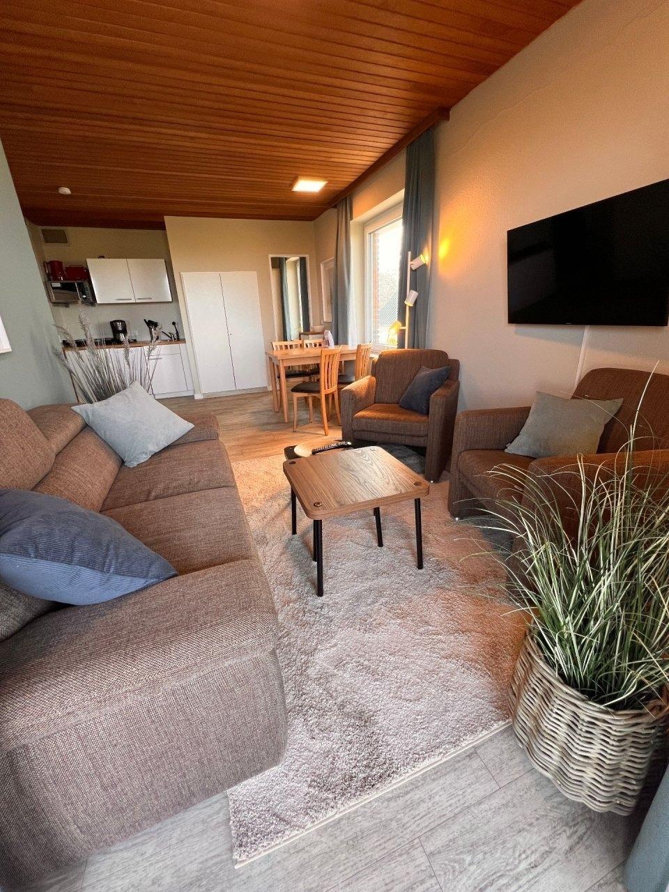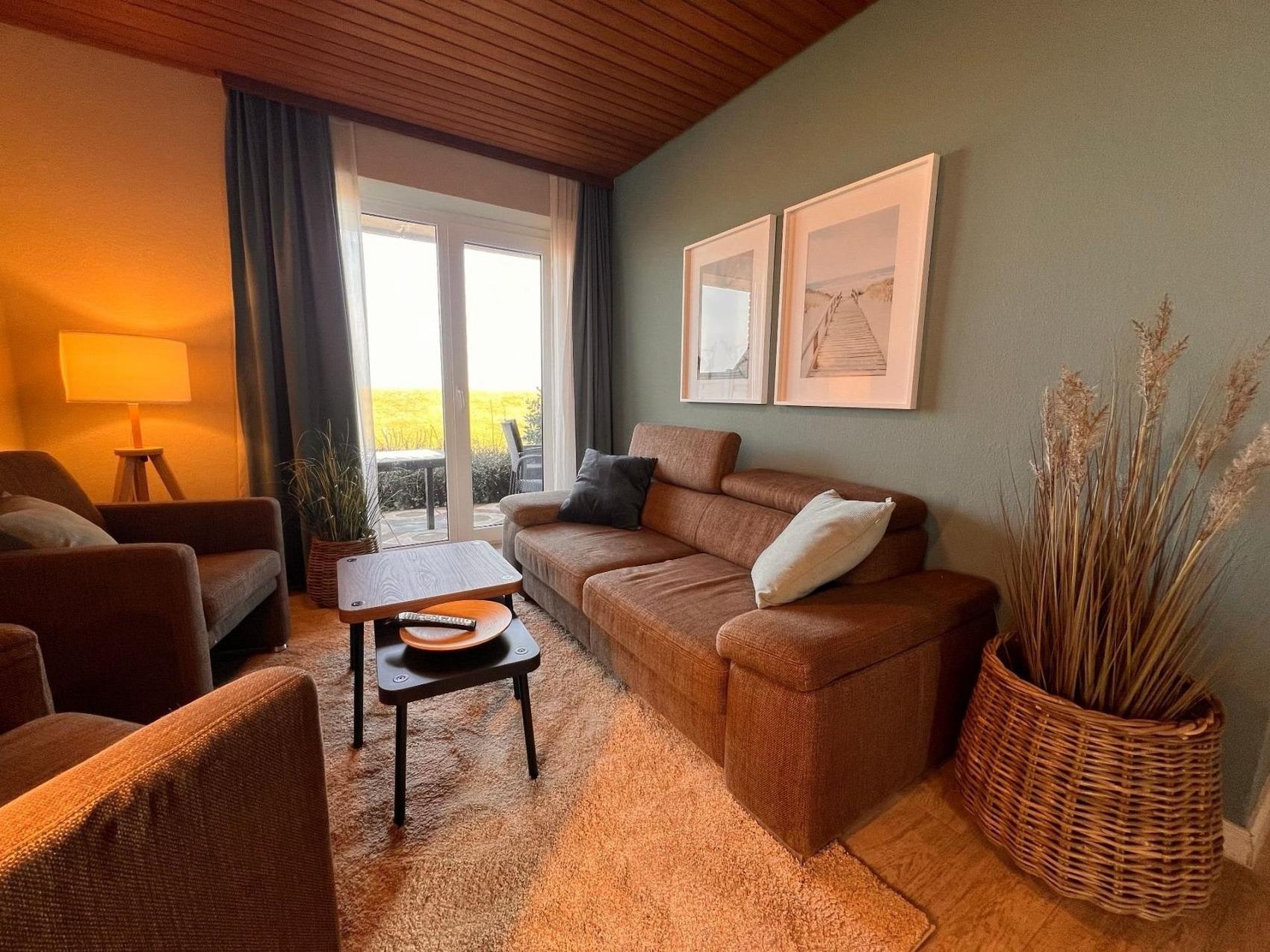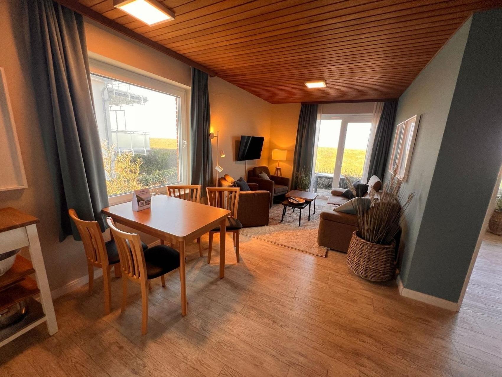 Der lichtdurchflutete Wohnbereich lädt zum Entspannen ein und bietet Ihnen einen wunderschönen Blick auf die Nordsee. Von hier aus gelangen Sie direkt auf die Terrasse zur Seeseite, auf der Sie frische Nordseeluft, Sonnenstunden und stimmungsvolle Abende genießen können.