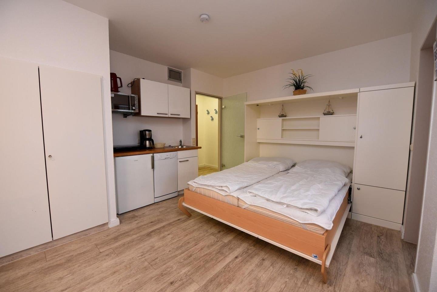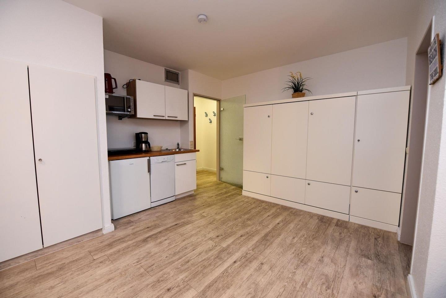 Die im Wohnraum integrierte Küchenzeile ist modern ausgestattet mit Spülmaschine, Mikrowelle sowie Kühlschrank mit Gefrierfach und bietet alles für einen komfortablen Aufenthalt.