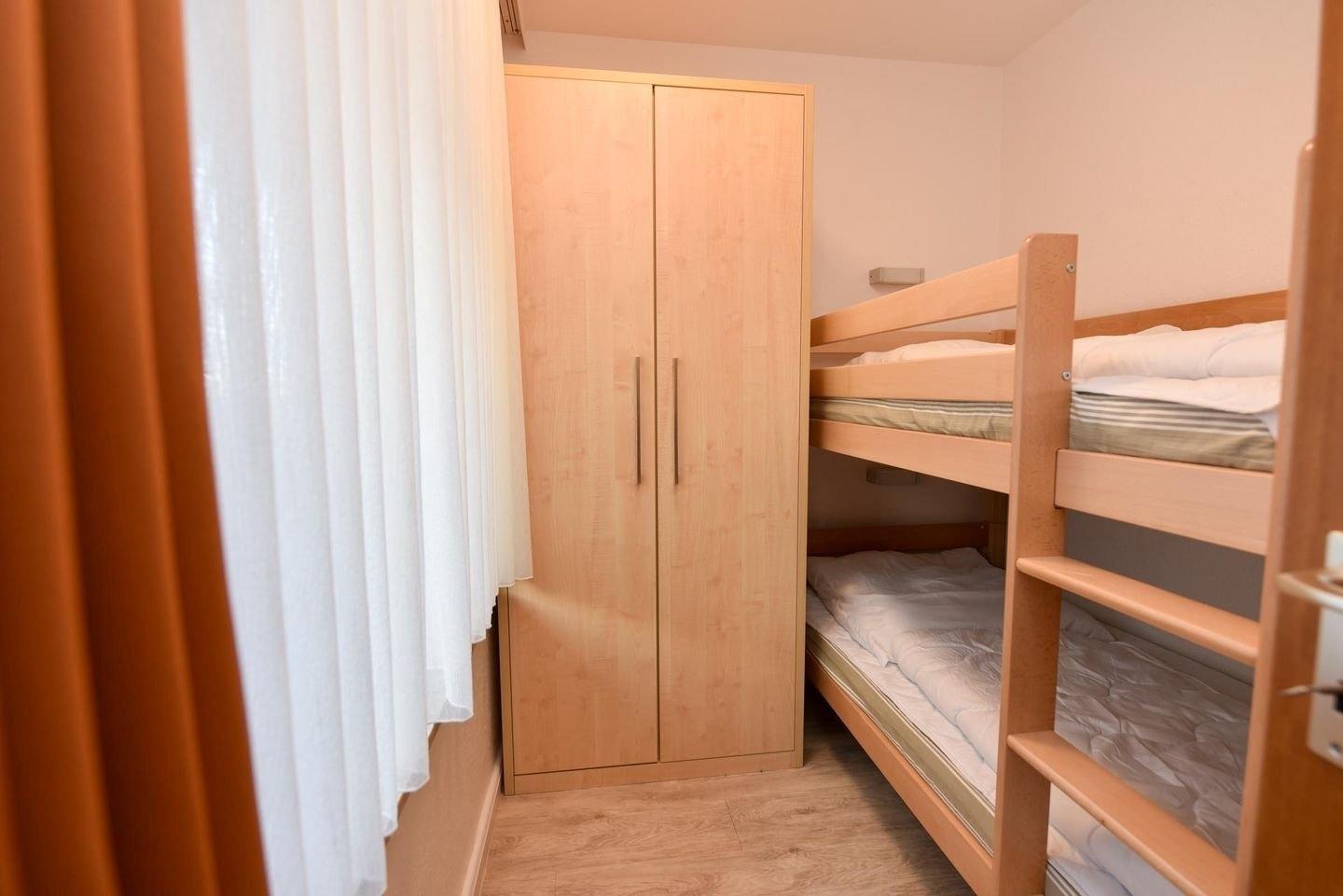 Die Wohnung verfügt über ein separates Elternschlafzimmer mit Doppelbett, ein Kinderzimmer mit Etagenbett für 2 Kinder sowie ein ausklappbares Doppelbett im Wohnzimmer. Der Südbalkon ist perfekt für Sonnenanbeter und ermöglicht gleichzeitig den Blick auf den Spielplatz ideal, um die Kinder entspannt im Auge zu behalten.