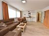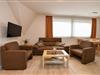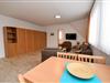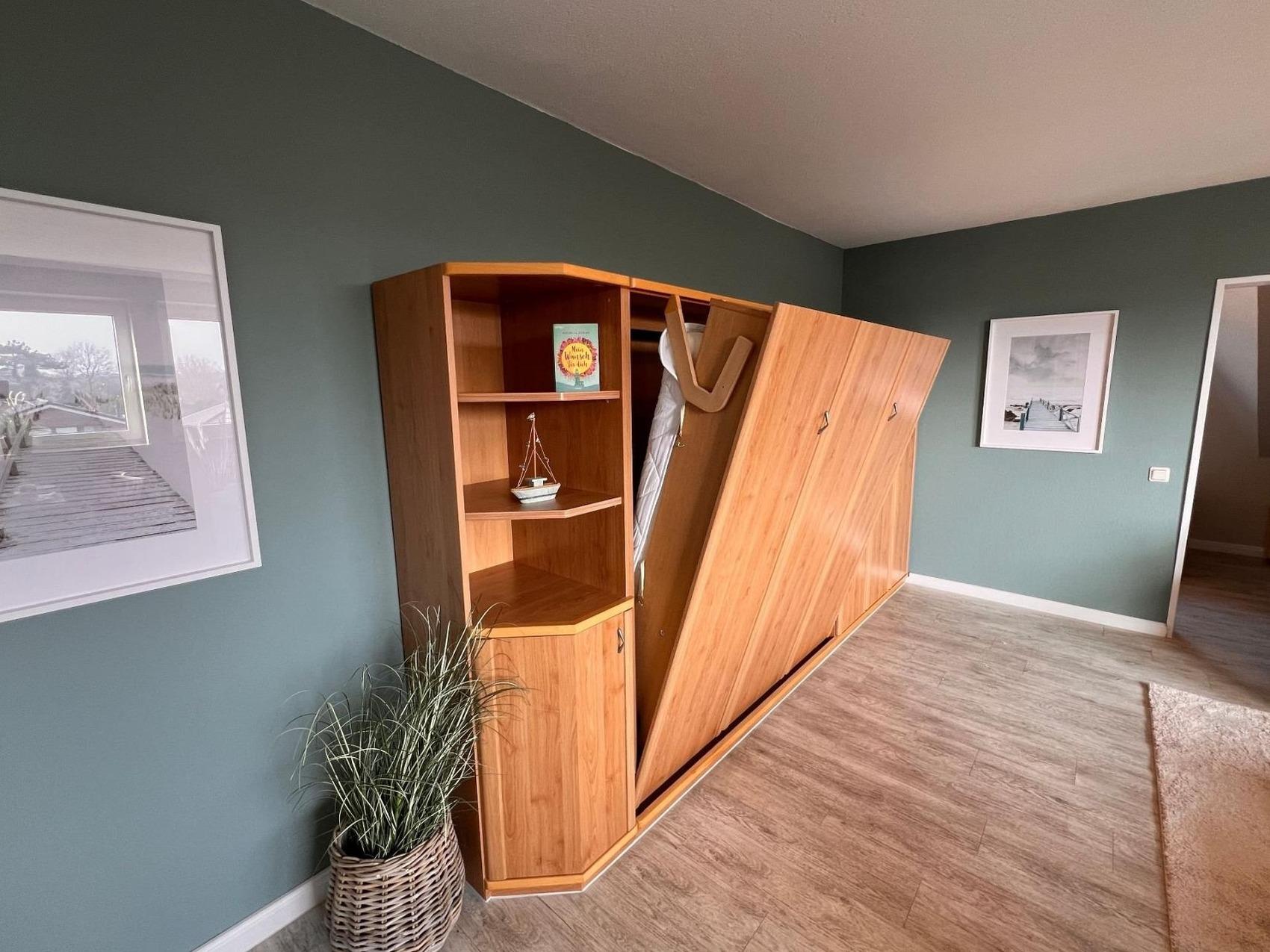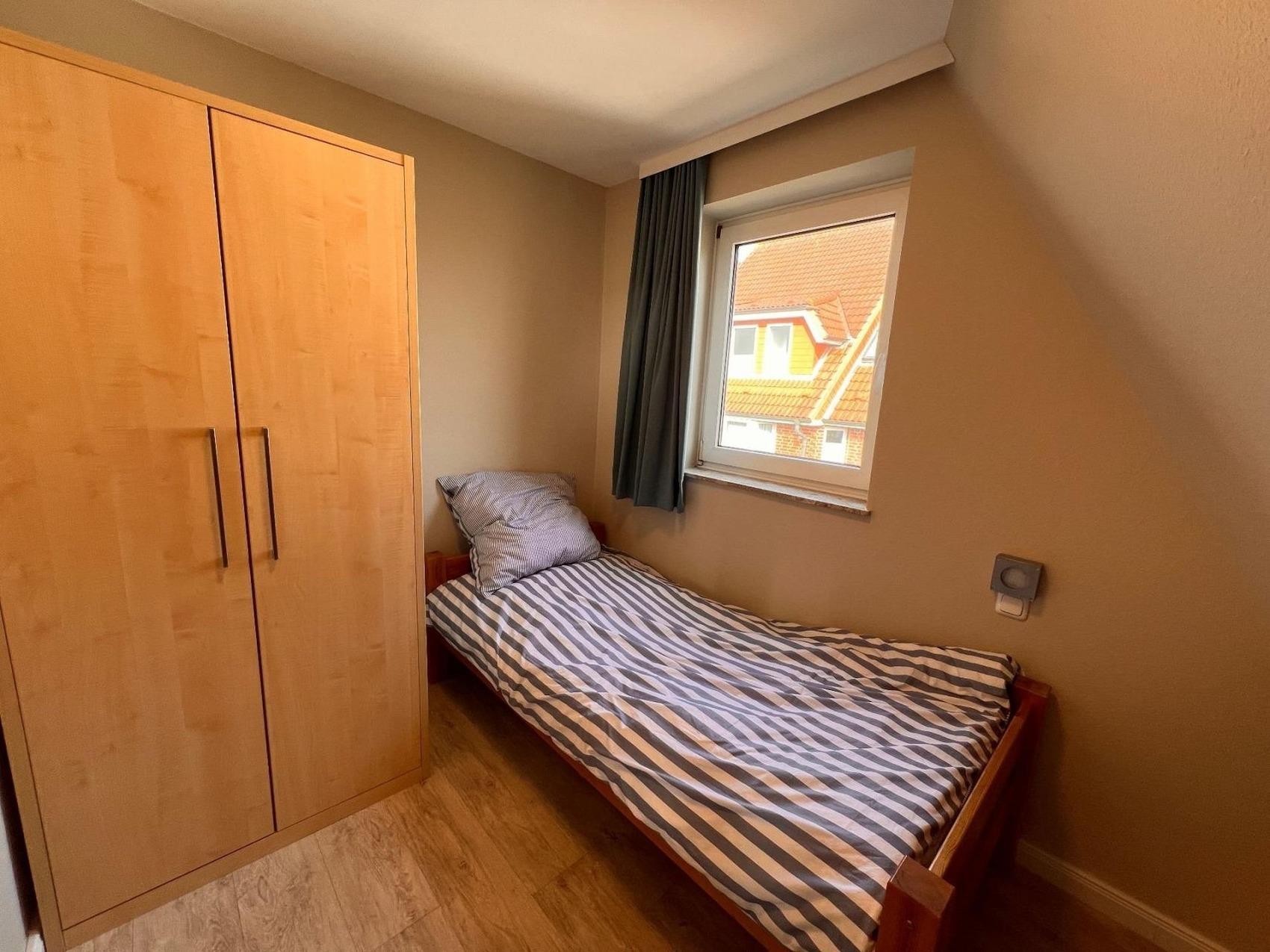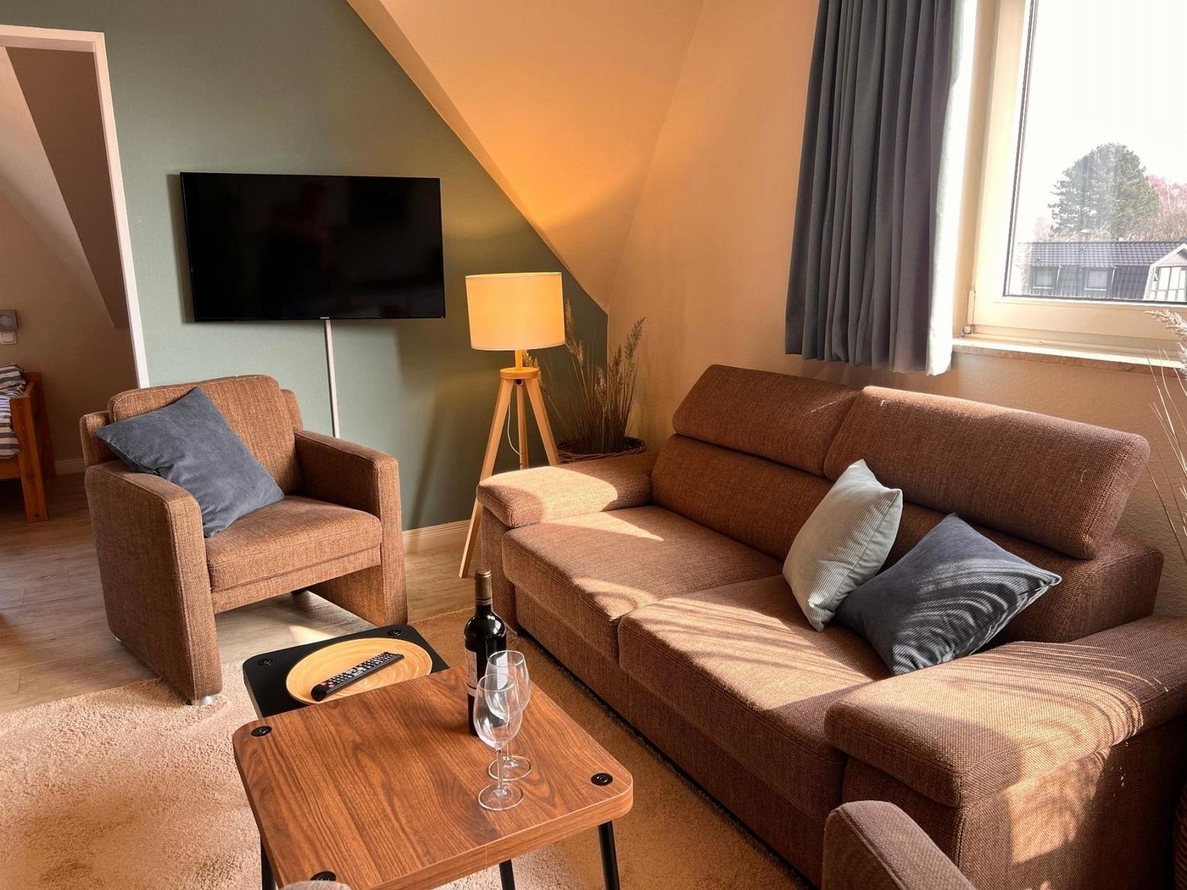 Die Unterkunft verfügt über ein gemütliches Schlafzimmer mit Etagenbett und ein helles Wohnzimmer mit zwei bequemen Zweisitzer-Sofas, Flat-TV und einer voll ausgestatteten Küchenzeile inklusive Spülmaschine, Mikrowelle und Kühlschrank mit Gefrierfach. Ein ausziehbarer Esstisch bietet ausreichend Platz für gemeinsame Mahlzeiten. Zusätzlich sorgt ein Schrankbett (2×90×200 cm) für flexible Schlafmöglichkeiten.