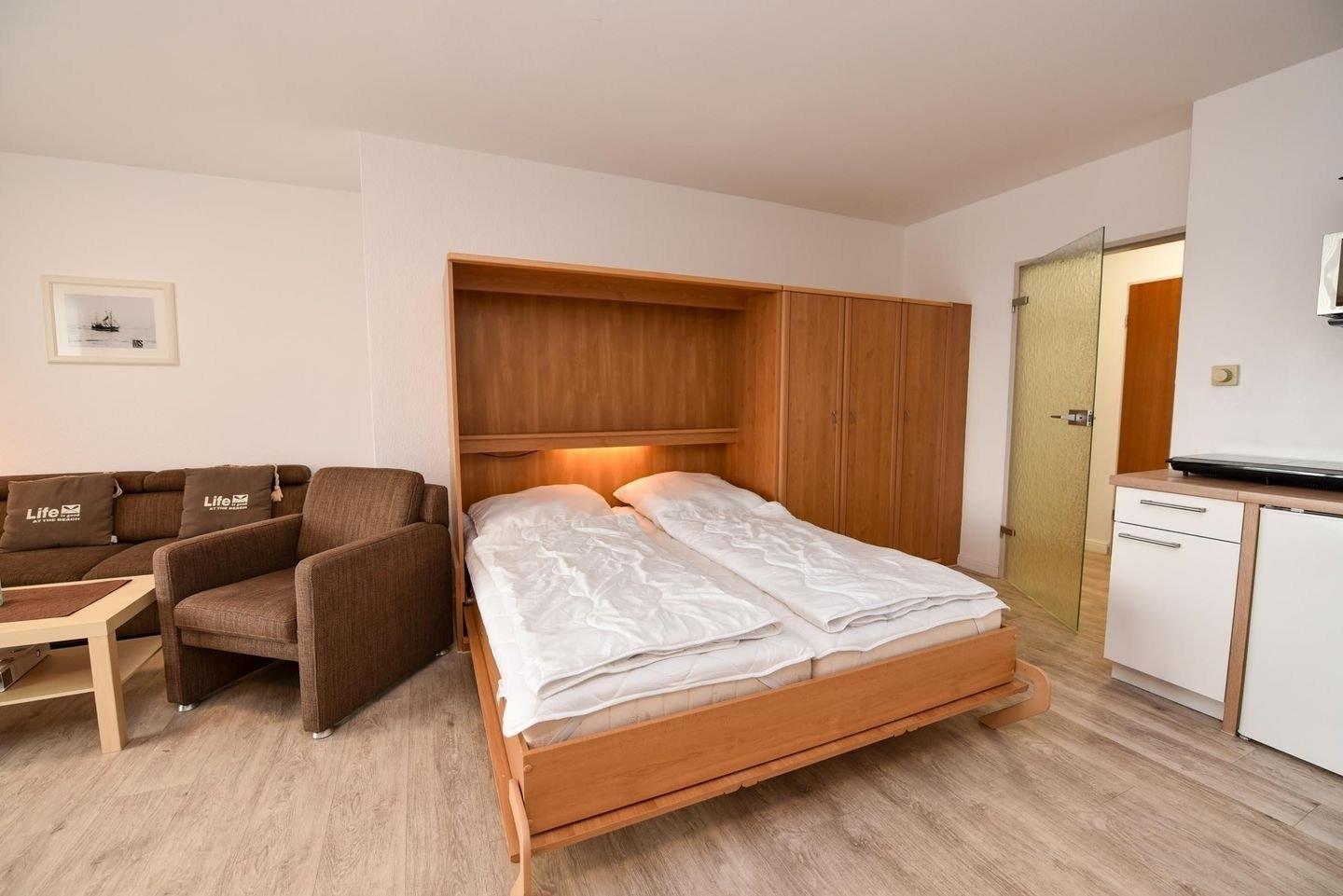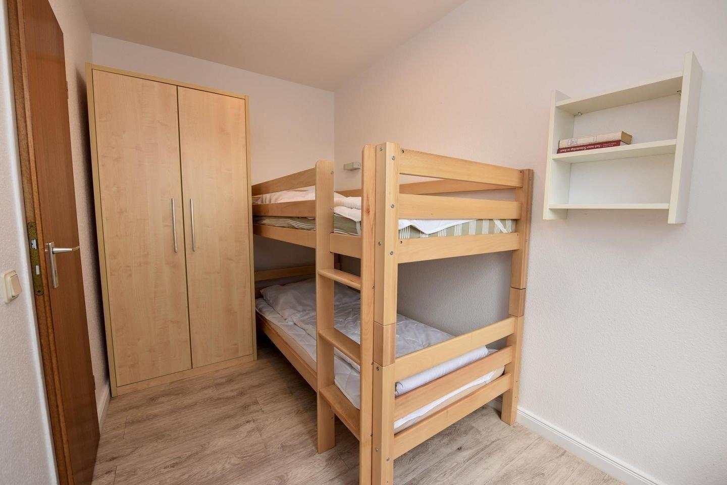 2-Zimmer Appartement im Haus "Nige Wark". In der TV-/Leseecke im Wohnzimmer befindet sich ein gemütliches Zweisitzer-Sofa, zwei Sessel und ein Flat- TV. Die integrierte Küchenzeile mit Spülmaschine, Mikrowelle und Kühlschrank mit Gefrierfach ist komplett ausgestattet und der ausziehbare Esstisch bietet genügend Platz für alle. Im Wohn-/Schlafraum befindet sich zusätzlich noch ein ein Schrankbett (2x90x200). Im Schlaf-/Kinderzimmer steht ein Etagenbett. Das Badezimmer ist mit einer Dusche und WC ausgestattet. Die ca. 42 qm große Wohnung liegt im 1. OG und verfügt zudem auch über einen Balkon zum Garten