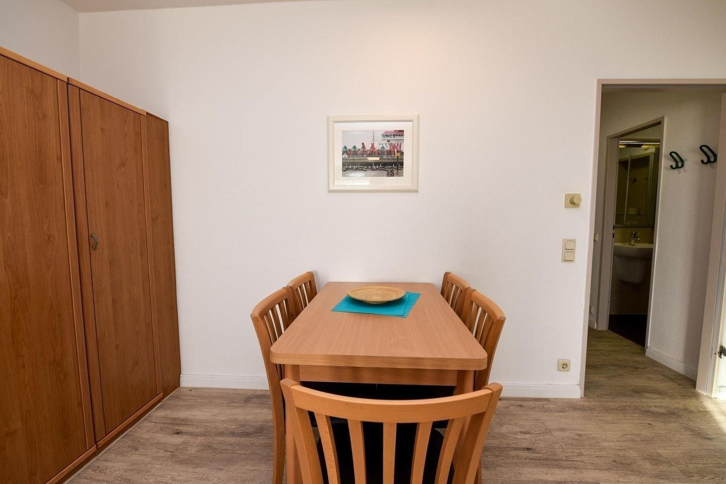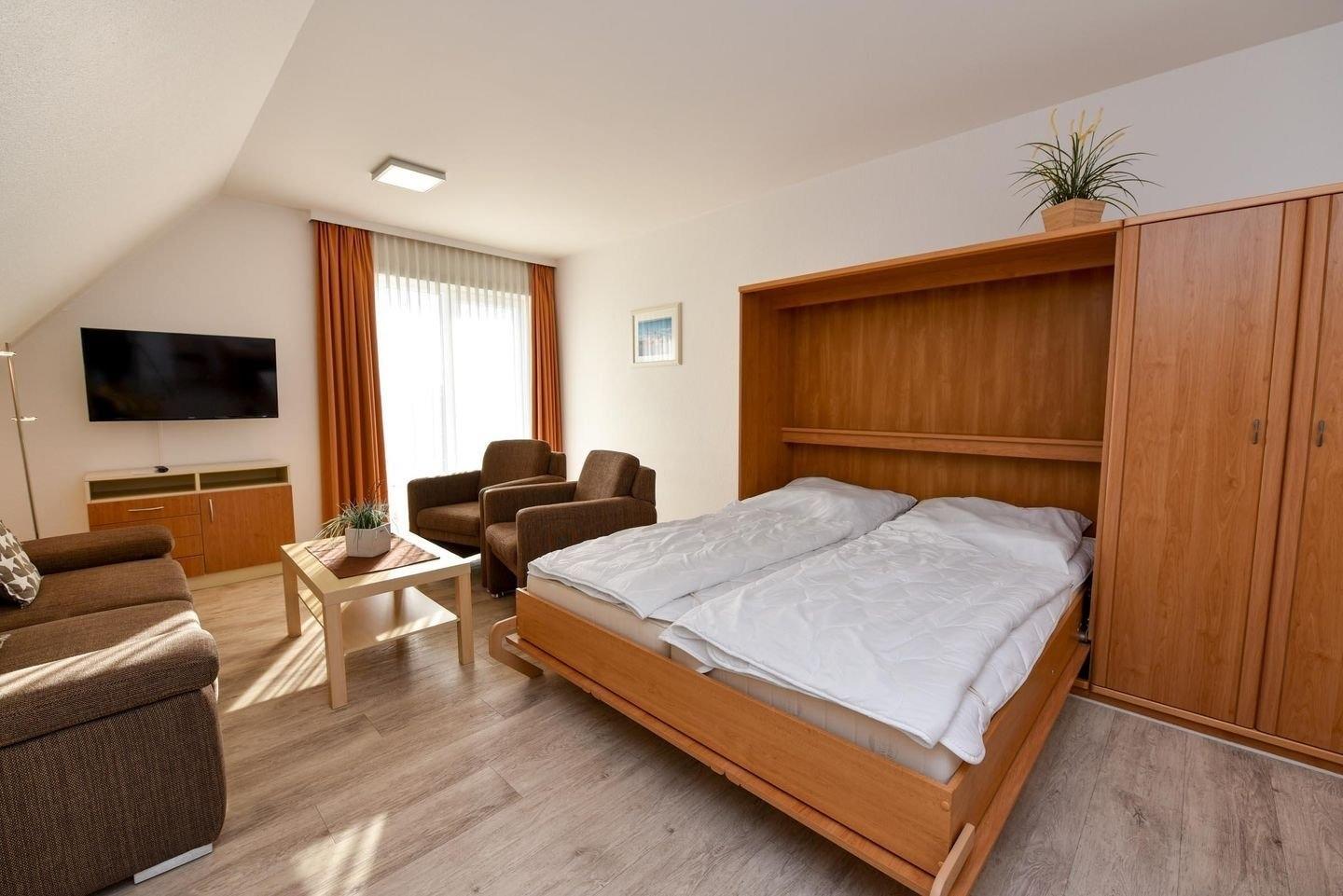 2-Zimmer Appartement im Haus "Nige Wark". In der TV-/Leseecke im Wohnzimmer befindet sich ein gemütliches Zweisitzer-Sofa, zwei Sessel und ein Flat- TV. Die integrierte Küchenzeile mit Spülmaschine, Mikrowelle und Kühlschrank mit Gefrierfach ist komplett ausgestattet und der ausziehbare Esstisch bietet genügend Platz für alle. Im Wohn-/Schlafraum befindet sich zusätzlich noch ein ein Schrankbett (2x90x200). Im Schlaf-/Kinderzimmer steht ein Etagenbett. Das Badezimmer ist mit einer Dusche und WC ausgestattet. Die ca. 40 qm große Wohnung liegt im 2. OG und verfügt zudem auch über einen Balkon zum Garten