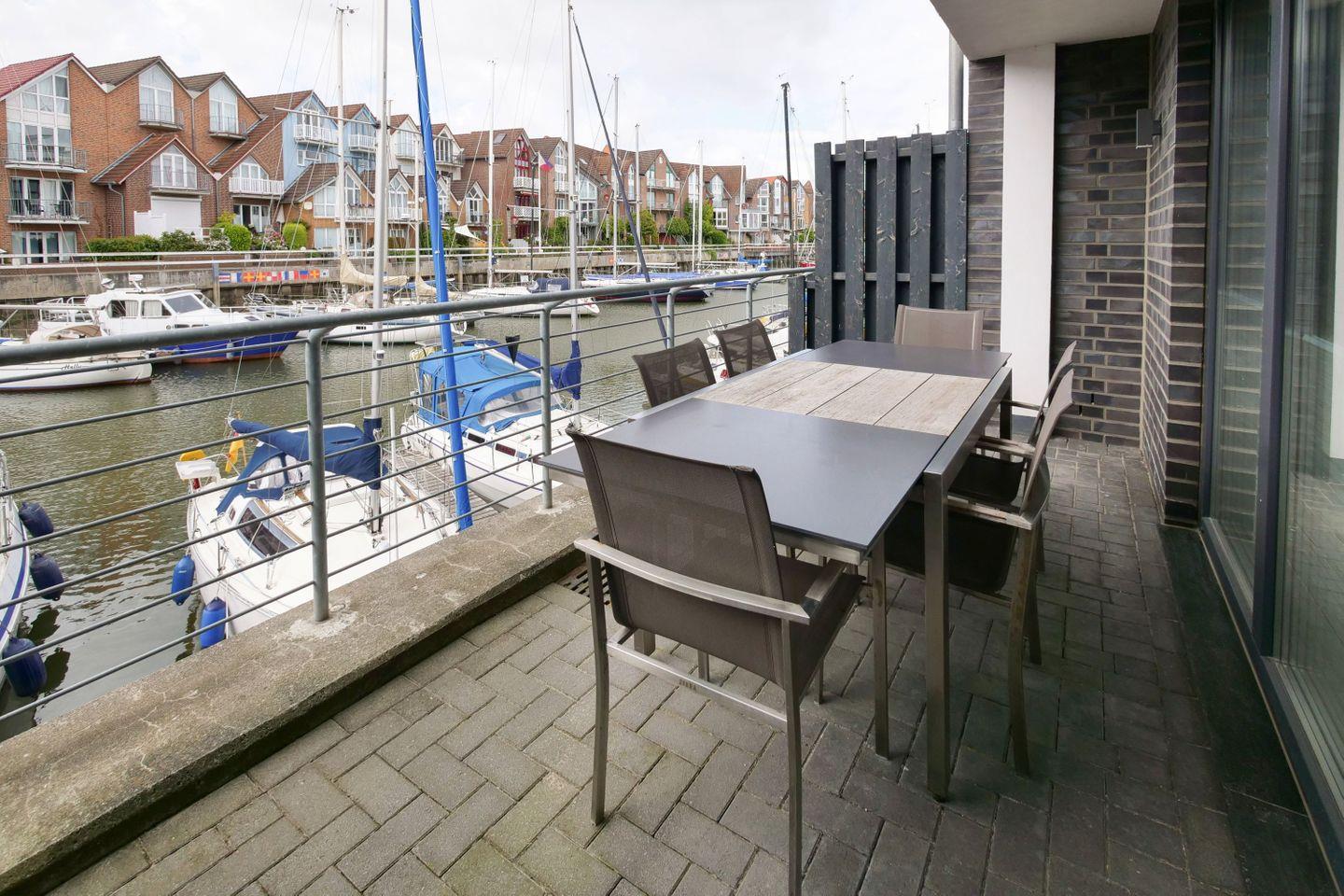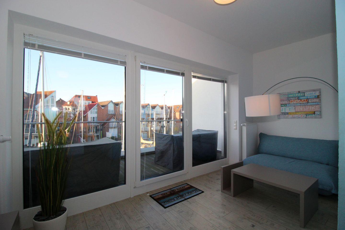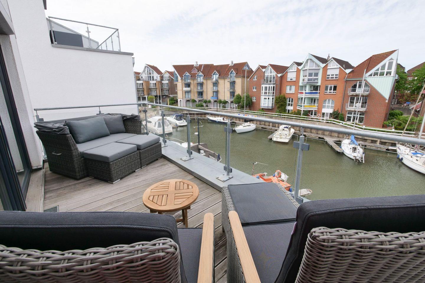 Über den Wohnbereich im Erdgeschoss gelangen die Urlaubsgäste auf die Terrasse, die mit einem großen ausziehbaren Tisch mit sechs Stühlen bestückt ist. Auf der Dachterrasse im 2. Obergeschoss können es sich die Urlaubsgäste auf beliebig kombinierbaren Lounge-Möbeln gemütlich machen. Sowohl von der Terrasse im Erdgeschoss als auch von der Dachterrasse haben Sie einen wunderschönen Blick in die Marina. Die weitere kleinere Terrasse zur gegenüberliegenden Hafenseite ist mit zwei Stühlen und einem kleinen Tisch ausgestattet und bietet sich z.B. für ein kleines Frühstück an.