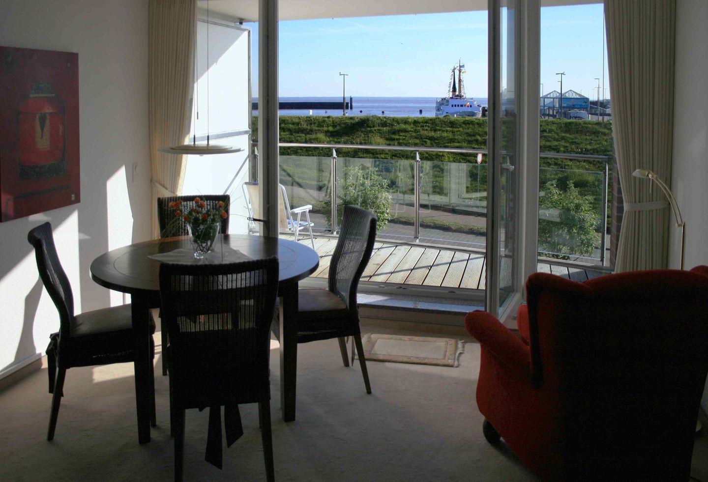 Auf dem Balkon können es sich die Gäste auf den Balkonmöbeln gemütlich machen, die frische Nordseeluft und den fabelhaften Ausblick auf den Weltschifffahrtsweg genießen.
