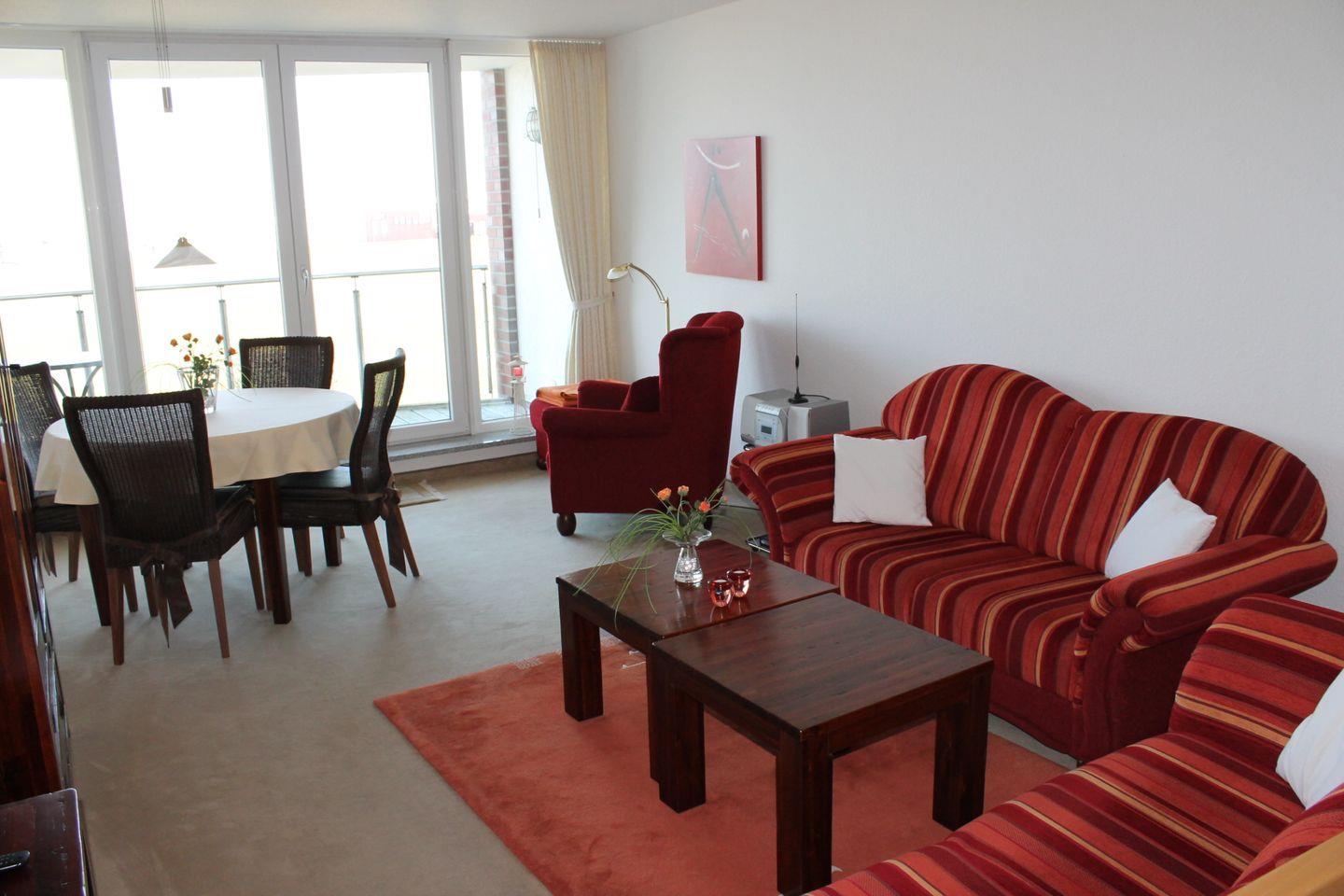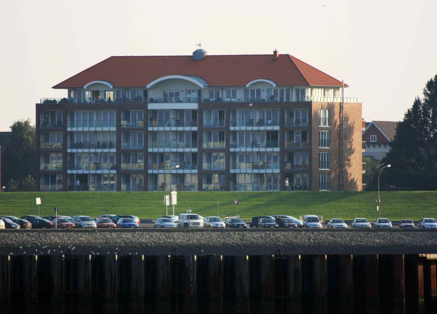 Haus "Nordseeblick", Typ D, Am Seedeich 34, Whg.Nr. 6, 2-4 Pers., 1. Etage, ca. 83 qm Größe auf 2 Ebenen, DEHOGA-Qualifizierung mit 5 Sternen, direkt am Deich, im EG (gefliest) 2 Schlafzimmer, 2 Bäder (1x Dusche, 1x Wanne), sep. Küche mit 4-Platten-Ceranfeld, Geschirrspüler, Backofen und Mikrowelle, im OG (Teppich) Wohnbereich mit Lesesessel und Balkon mit direkter Seesicht auf den Weltschifffahrtsweg, Kabel-TV, kostenl. W-Lan-Nutzung, Aufzug, Waschmaschine + Trockner gg. Gebühr im Keller, Tiefgaragenstellplatz, Fahrradkeller, Haustiere sind nicht erlaubt, Nichtraucherwohnung.