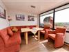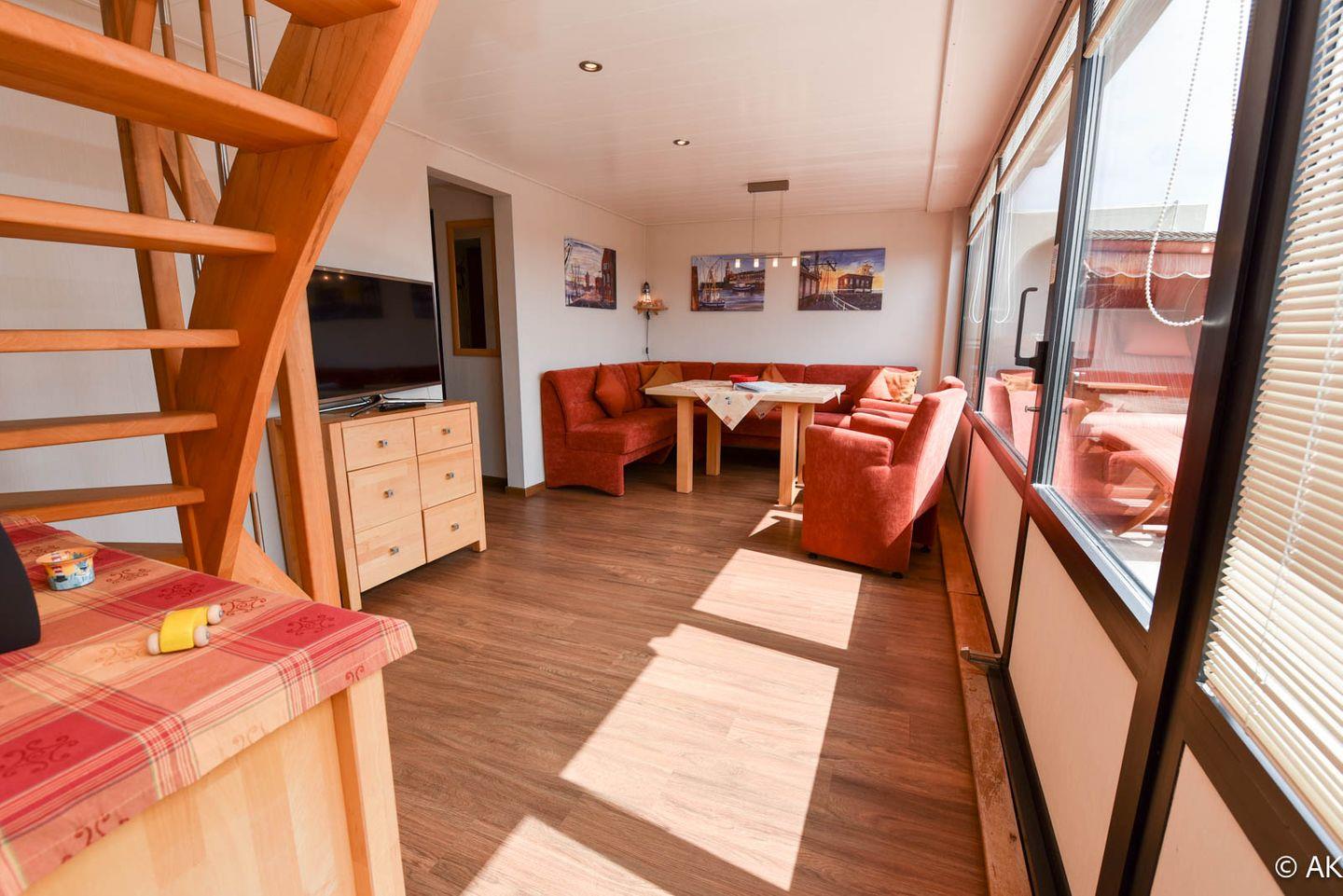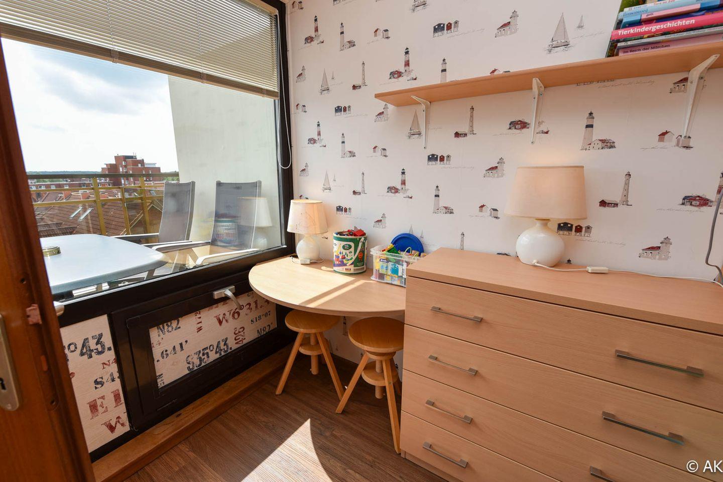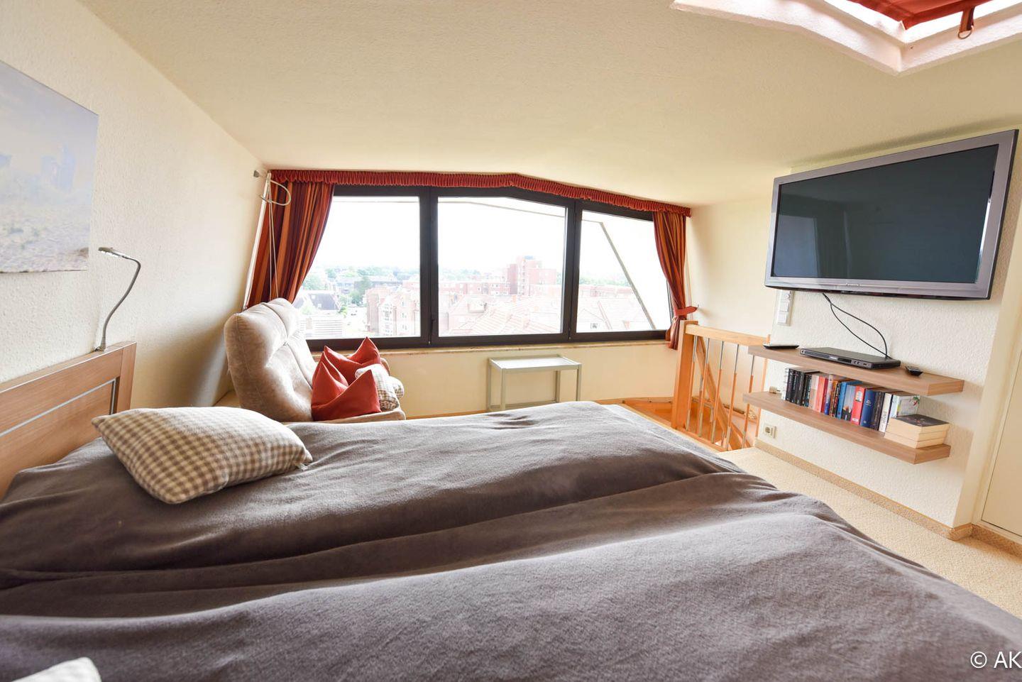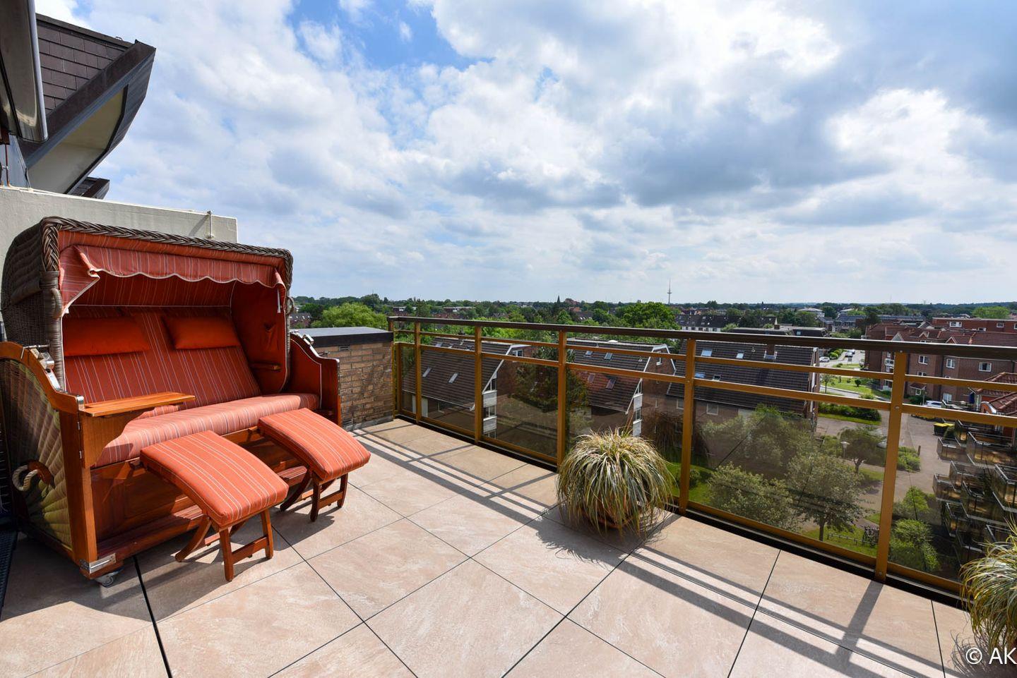 3-Zimmer Maisonette-Appartement im 5 OG zur Sonnenseite. Dieses schöne Appartement bietet Ihnen eine mit einem gemütlichem Sofa ausgestattete Essecke mit Tisch und einen Sessel, sowie Kabel TV und eine Hifi-Anlage mit integriertem DVD. Die separate Komfortküche ist u.a. mit einem Geschirrspüler, einer Back-Mikrowelle und einem großem Kühlschrank ausgestattet . Das Kinderzimmer hat ein Etagenbett und der Elternschlafraum ein Ehebett sowie gemütliche Sesseln. Im Bad/WC sind zwei Waschbecken und eine Dusche sowie eine Badewanne vorhanden. Die große Dachterrasse, welche u.a. mit einem traditionellen Strandkorb ausgestattet ist bietet einen wundervollen Panoramablick über Cuxhaven. Der dazugehörige PKW Tiefgaragenstellplatz hat eine Einstellhöhe von bis 149 cm. Fahrstuhl bis zur 5. Etage.
