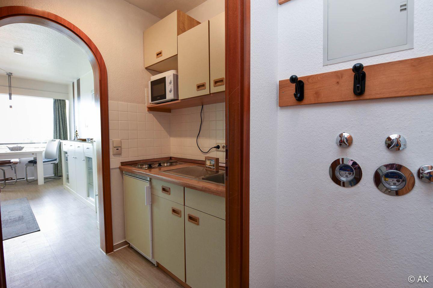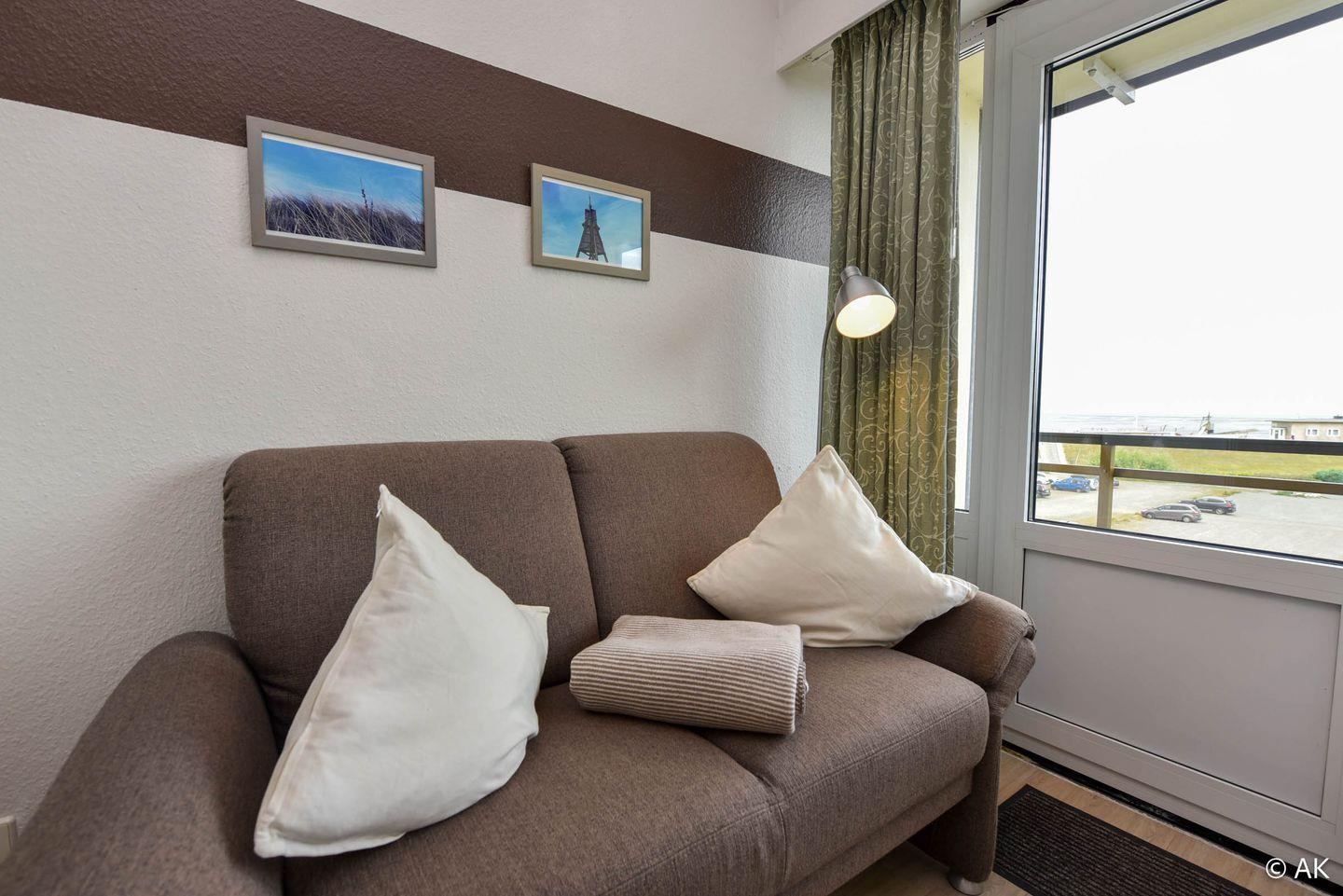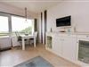Komfortables 1-Zimmer-Appartement für 2 Personen im 3. Obergeschoss mit Seesicht und eigenem Strandkorb am Strand (01.05.–30.09.).