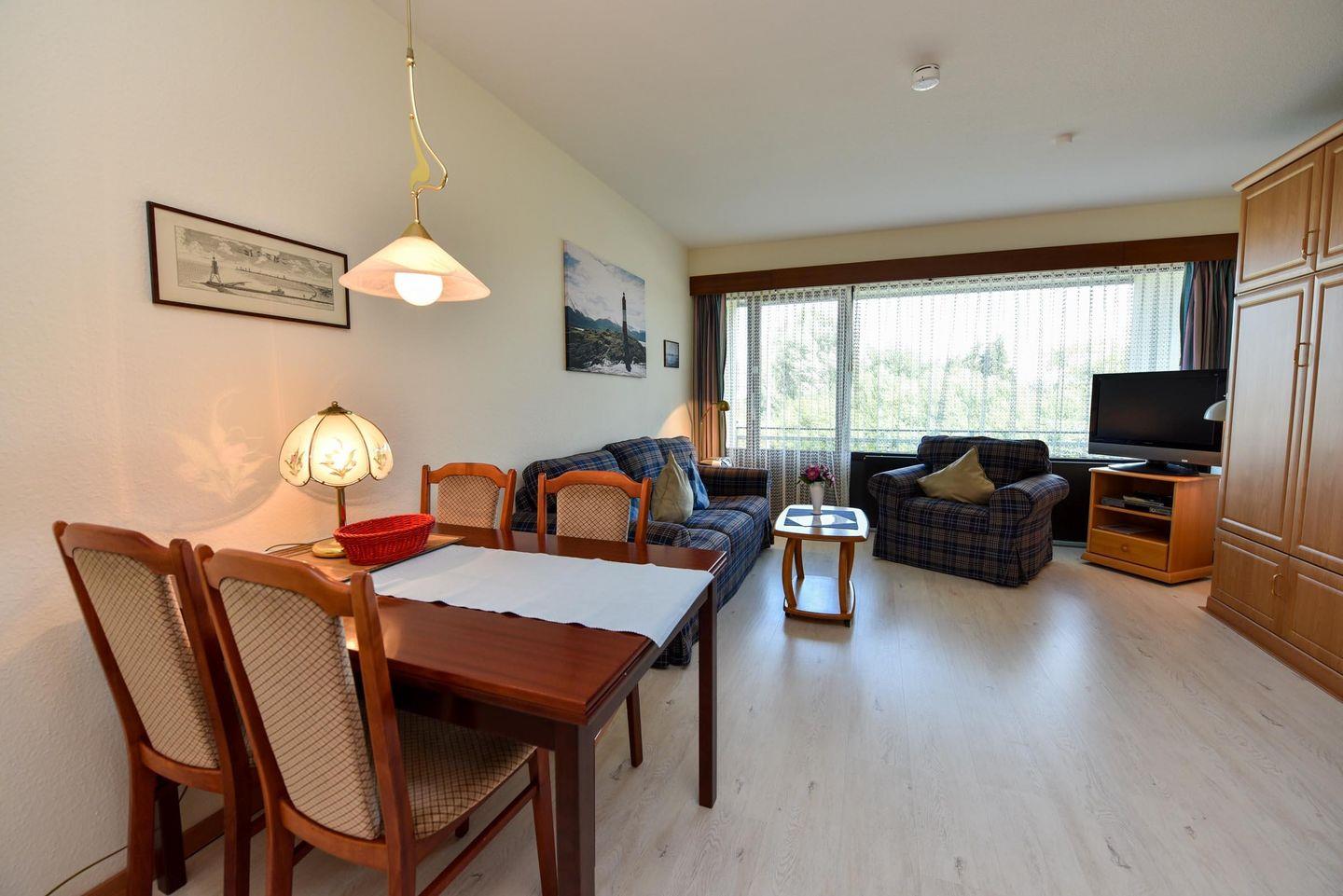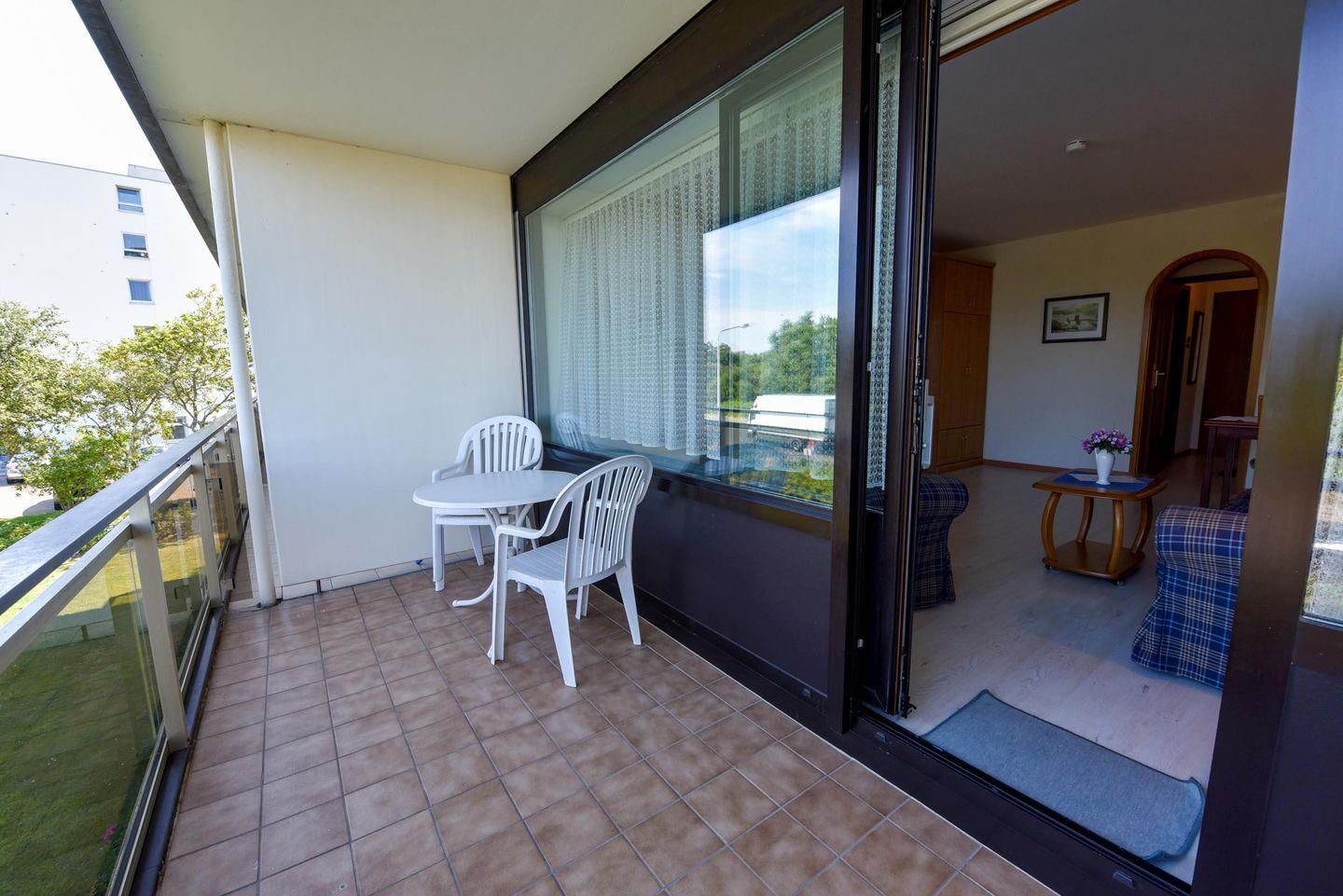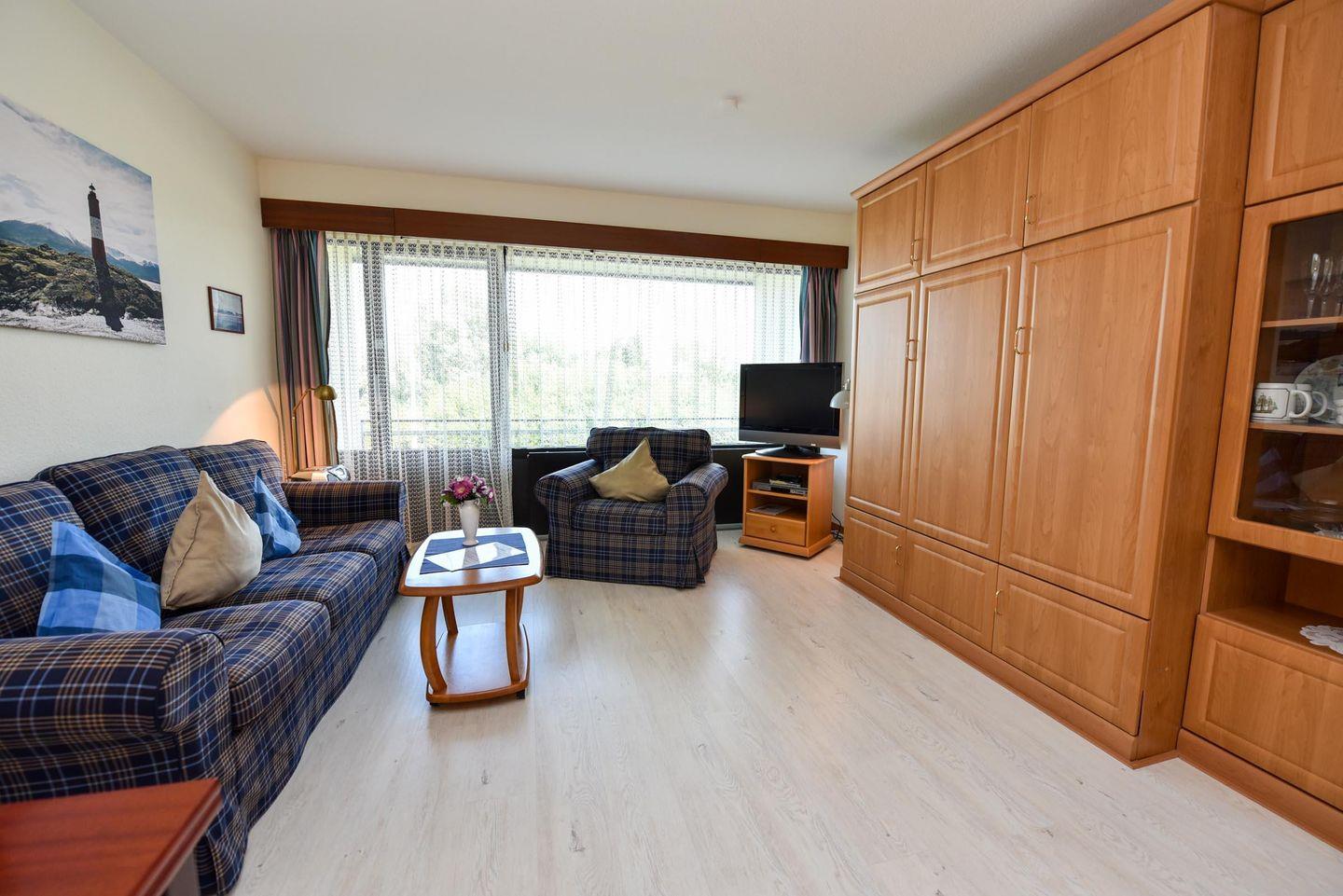Das geräumige 1-Zimmer Appartement für 2 Personen im 1 OG. im Haus "Jan am Strand" verfügt über einen großen Balkon zur Seeseite mit Blick auf den Deich und in Richtung des Weltschifffahrtsweg. Das Appartement mit Flach TV, Kabelfernsehen und DVD Player wurde mit Laminat und einer einladenden Sofagarnitur aufgewertet. Es bietet ein Doppelschrankbett mit einzelnen Matratzen und verfügt über eine separate Kochnische, einem großzügigen Essbereich mit Tisch und 4 Stühlen. Das Badezimmer ist geräumig mit einem Doppelwaschbecken und einem Wannenbad. Zu dem Appartement gehört auch ein Tiefgaragenplatz (Höhe 149 cm).