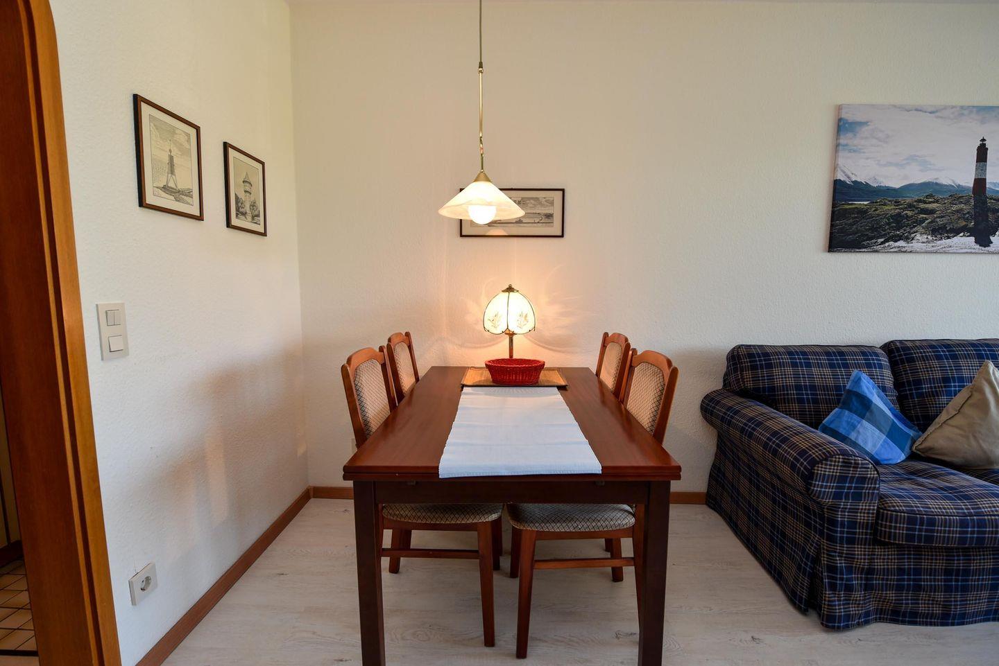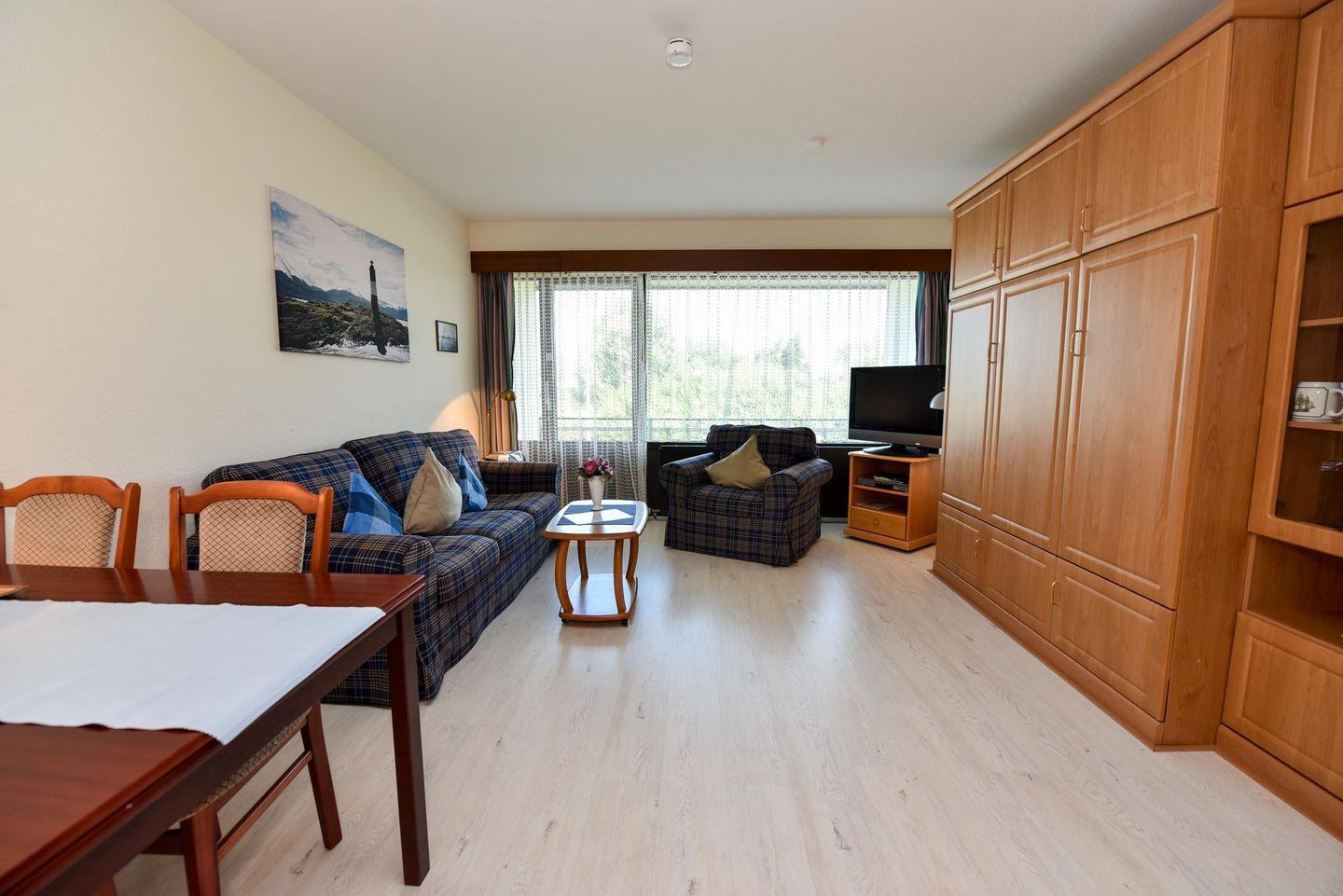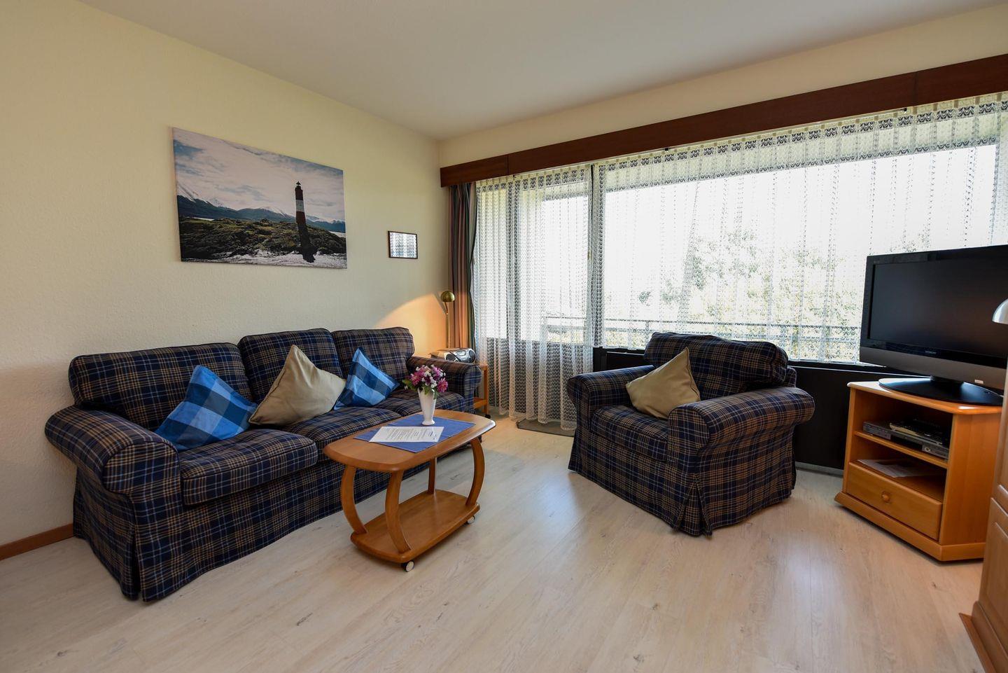 Das geräumige 1-Zimmer Appartement für 2 Personen im 1 OG. im Haus "Jan am Strand" verfügt über einen großen Balkon zur Seeseite mit Blick auf den Deich und in Richtung des Weltschifffahrtsweg. Das Appartement mit Flach TV, Kabelfernsehen und DVD Player wurde mit Laminat und einer einladenden Sofagarnitur aufgewertet. Es bietet ein Doppelschrankbett mit einzelnen Matratzen und verfügt über eine separate Kochnische, einem großzügigen Essbereich mit Tisch und 4 Stühlen. Das Badezimmer ist geräumig mit einem Doppelwaschbecken und einem Wannenbad. Zu dem Appartement gehört auch ein Tiefgaragenplatz (Höhe 149 cm).