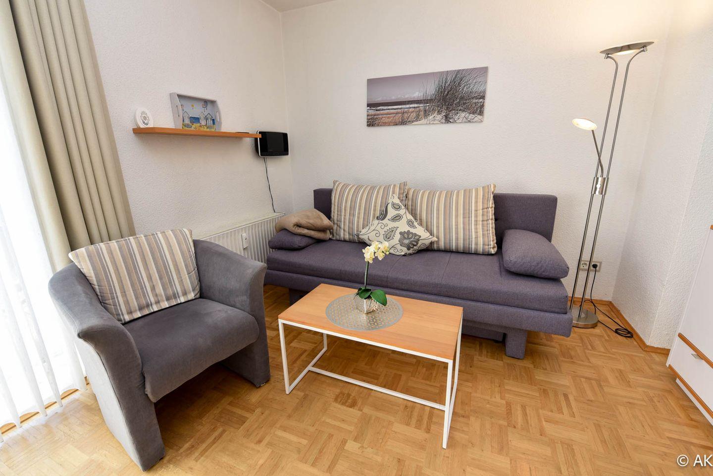 2-Zimmer-Appartment im 2. Obergeschoss, Residenz PASSAT. Komfortabel und modernes Appartement: 1 Wohn-/Schlafraum mit Esstisch und integrierter Küchenzeile, Espressoautomat (Tchibo) Mikrowelle mit Backofenfunktion, Spülmaschine. Kühlschrank mit Gefrierfach. Neue Schlafcouch, Couchtisch, Im Schlafzimmer ein Boxspringbett. Modernes Duschbad/WC. LED TV incl. DVD-Spieler. Kompakte Stereoanlage mit IPod/Telefonanschluss. Möblierter Süd/Ost-Balkon. Kostenloses W-LAN im App. PKW-Stellplatz. Rasenanlage mit Spielgerät. Das Schwimmbad und Sauna ist kostenfrei zu nutzen. Saisonale Bereitstellung eines Strandkorbs kostenlos.