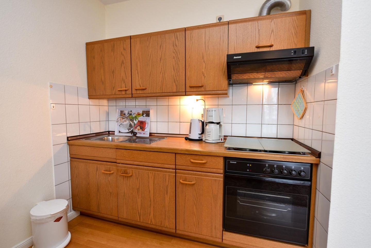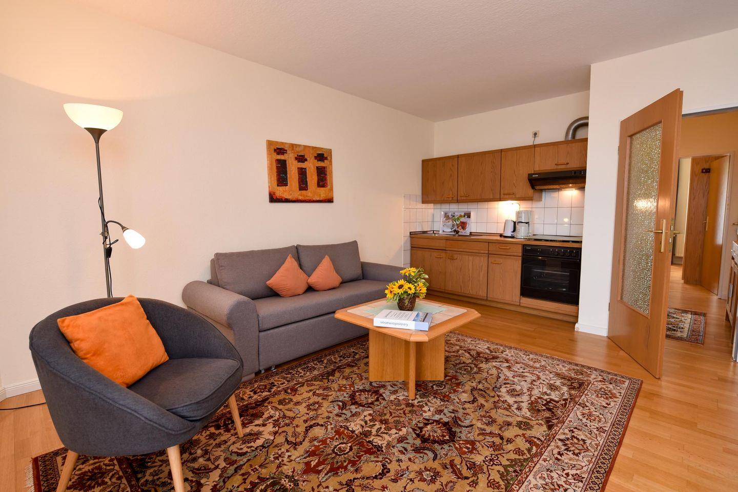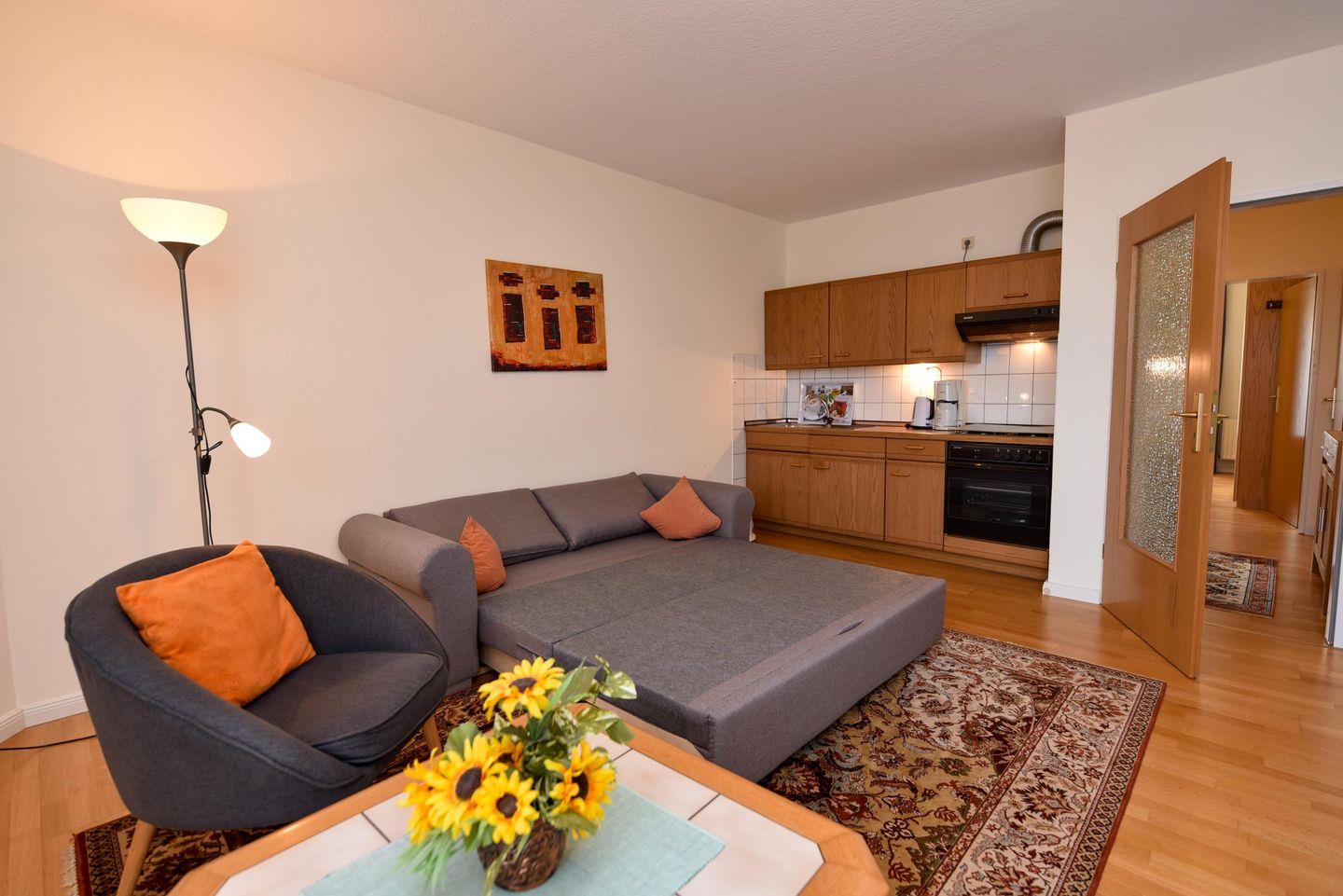 Das lichtdurchflutete Wohn-/Ess-/Schlafzimmer verfügt über eine voll ausgestattete Küchenzeile mit Backofen für Ihre kulinarischen Bedürfnisse. Entspannen Sie sich auf der komfortablen Doppelbettcouch, die sich perfekt für entspannte Abende eignet, oder genießen Sie einen geselligen Abend am Esstisch mit Platz für vier Personen.