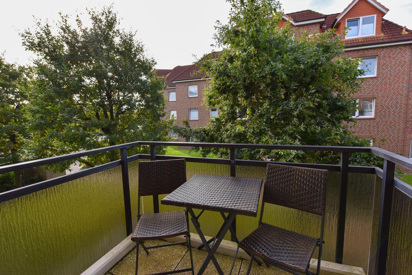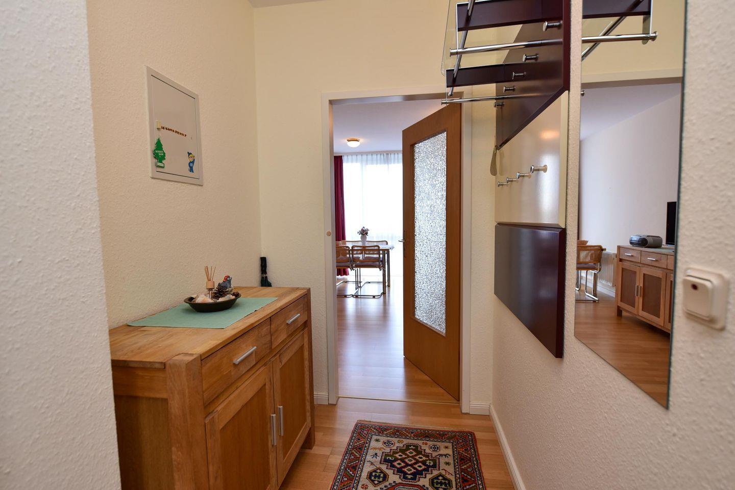 Großzügiges 2-Zimmer-Appartement im 1. Obergeschoss Residenz PASSAT für 2 bis 4 Personen Freundliches Appartement: 1 Wohn-/Ess-/Schlafraum mit integrierter Küchenzeile, Backofen, im Wohnraum eine bequeme Doppelbettcouch, Sessel und Couchtisch. Esstisch und 4 Stühle. Schlafzimmer mit Ehebett. Duschbad/WC. SAT-TV. Möblierte Südbalkon. Garagenstellplatz. Rasenanlage mit Spielgerät. Das Schwimmbad mit Gegenstromanlage und eine finnische Sauna sind kostenfrei im Haus zu nutzen. Fahrstuhl bis zum Schwimm-bad, Sauna u. Münzwaschmaschine u. Trockner stehen für alle Gäste bereit.