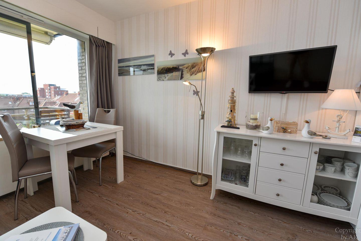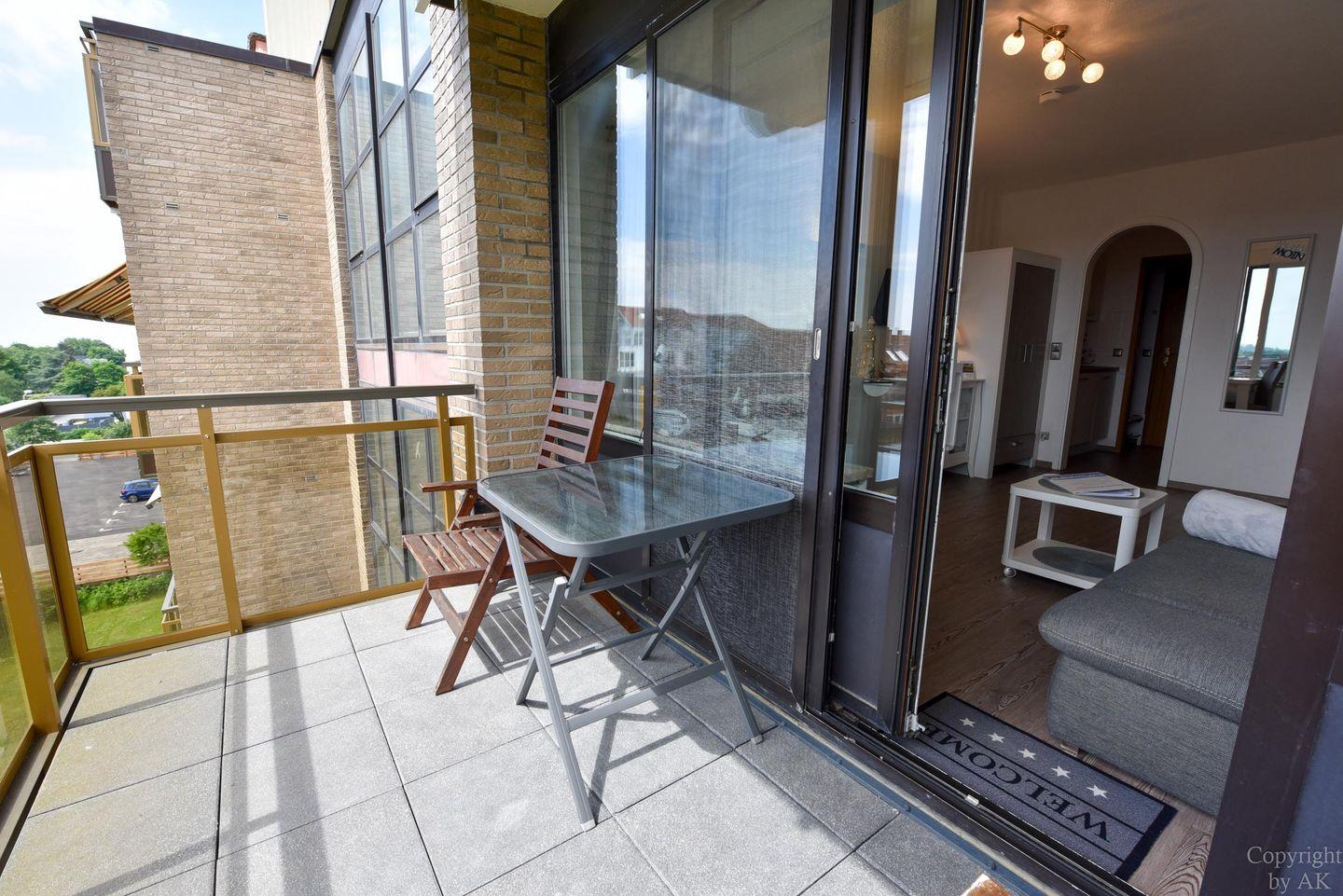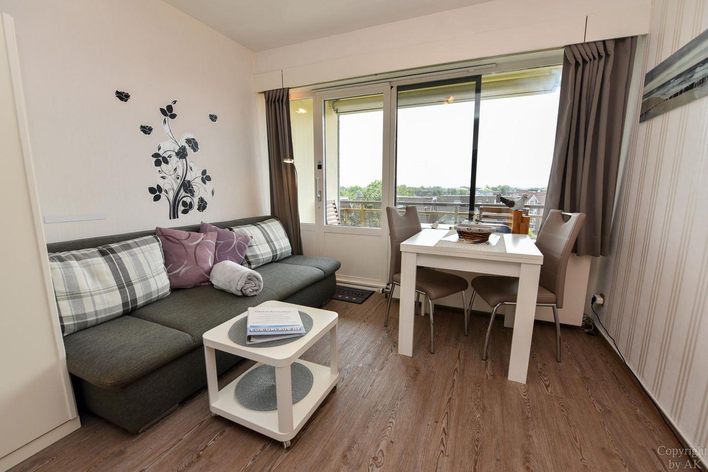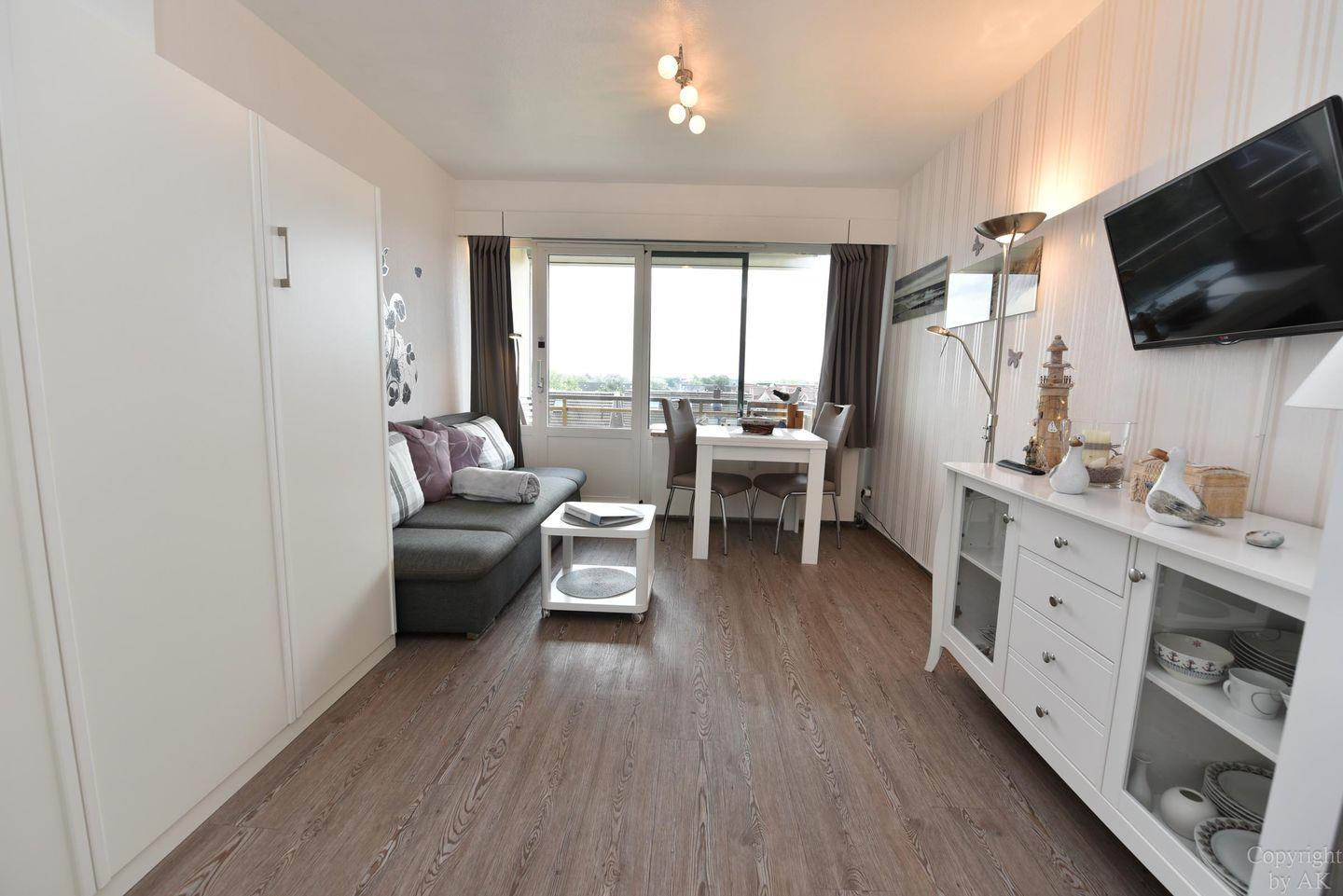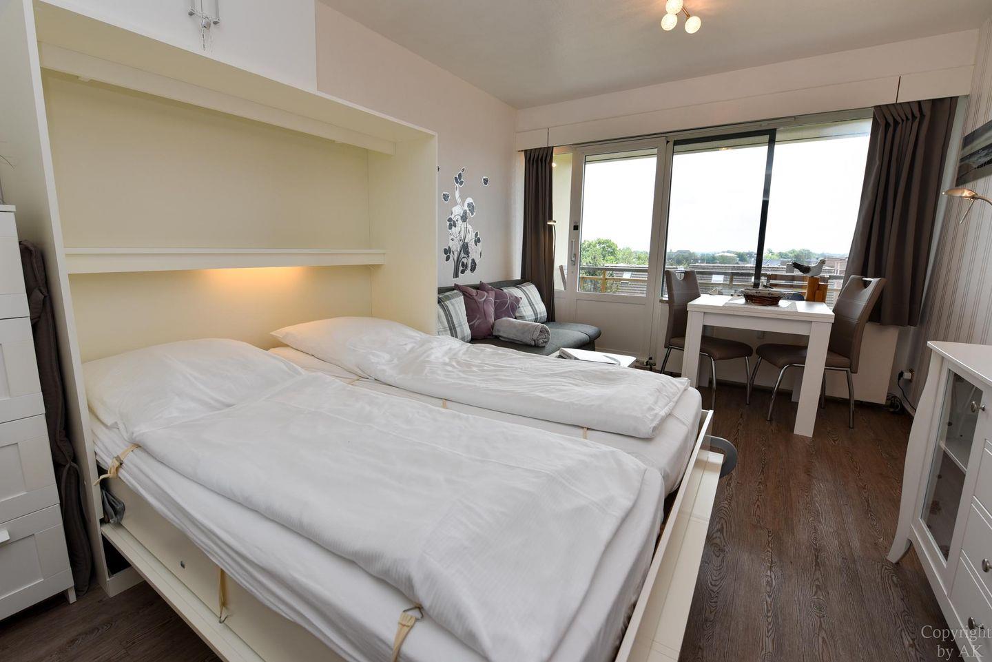 1-Zimmer Appartement im 4. OG mit herrlich sonnigen Balkon im Haus JAN AM STRAND. Dieses komfortabel für 2 Personen eingerichtete Appartement mit integrierter Küchennische ist u.a. mit einem Schrankbett, sowie einem Sofa und einem Tisch mit 2 Stühlen ausgestattet. WC/Duschbad. Der kostenlose Tiefgaragenstellplatz hat eine Einstellhöhe von 149 cm. Dazu gehört ein kostenfreier Parkschein ( 01.01.- 31.12. ) für den Parkplatz gegenüber.