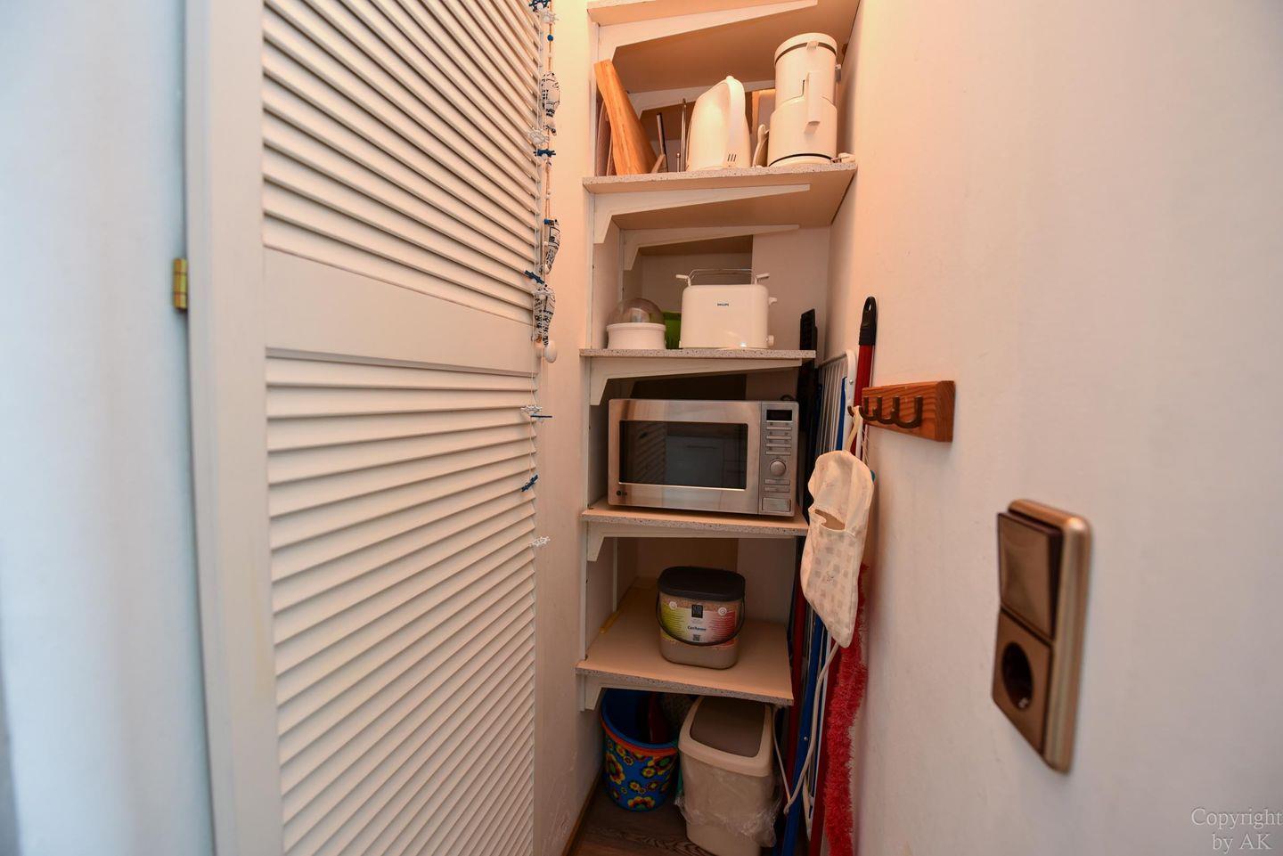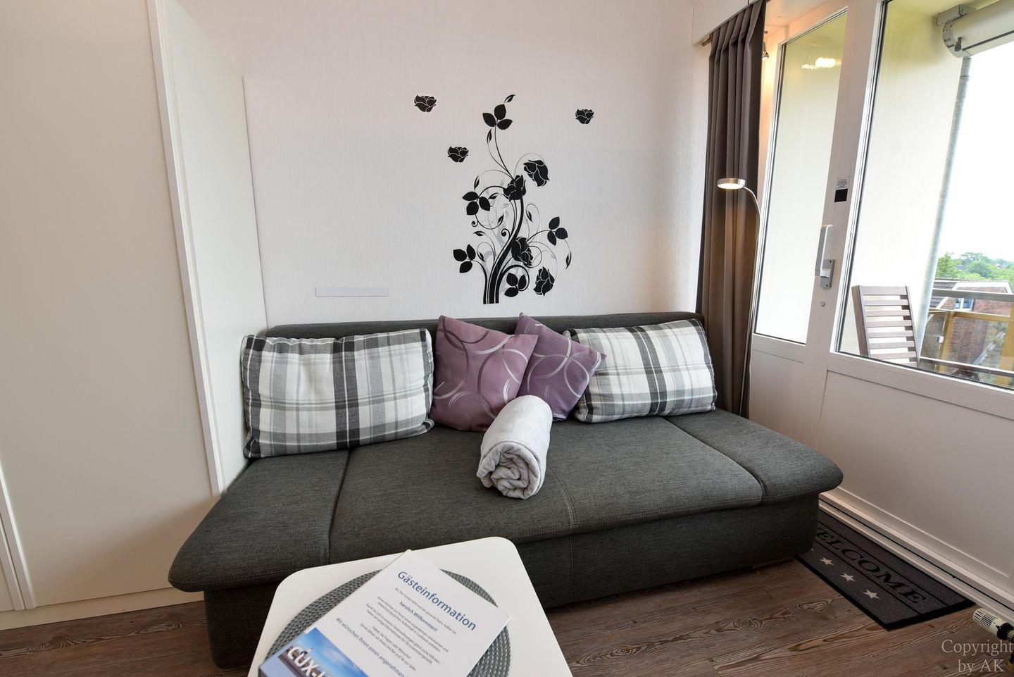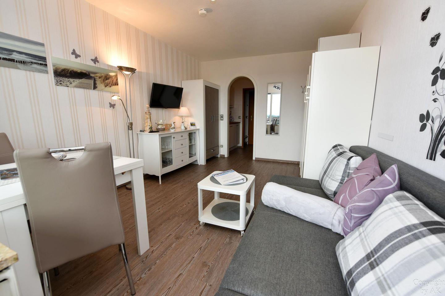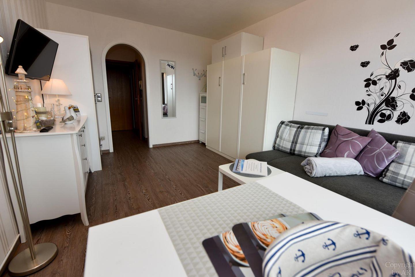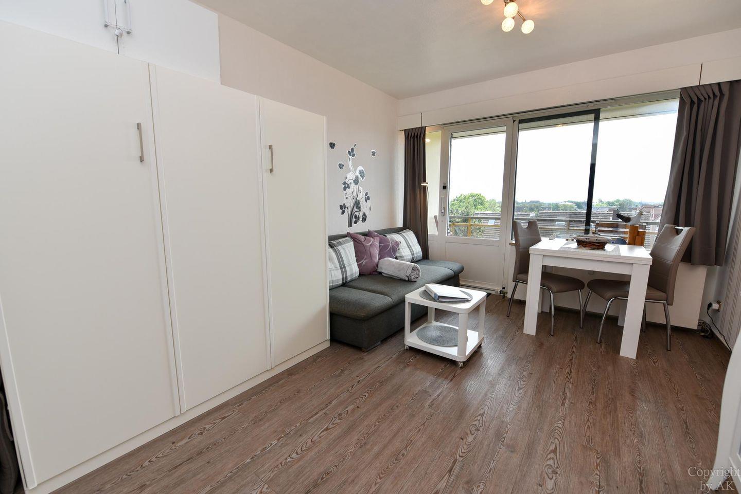 1-Zimmer Appartement im 4. OG mit herrlich sonnigen Balkon im Haus JAN AM STRAND. Dieses komfortabel für 2 Personen eingerichtete Appartement mit integrierter Küchennische ist u.a. mit einem Schrankbett, sowie einem Sofa und einem Tisch mit 2 Stühlen ausgestattet. WC/Duschbad. Der kostenlose Tiefgaragenstellplatz hat eine Einstellhöhe von 149 cm. Dazu gehört ein kostenfreier Parkschein ( 01.01.- 31.12. ) für den Parkplatz gegenüber.
