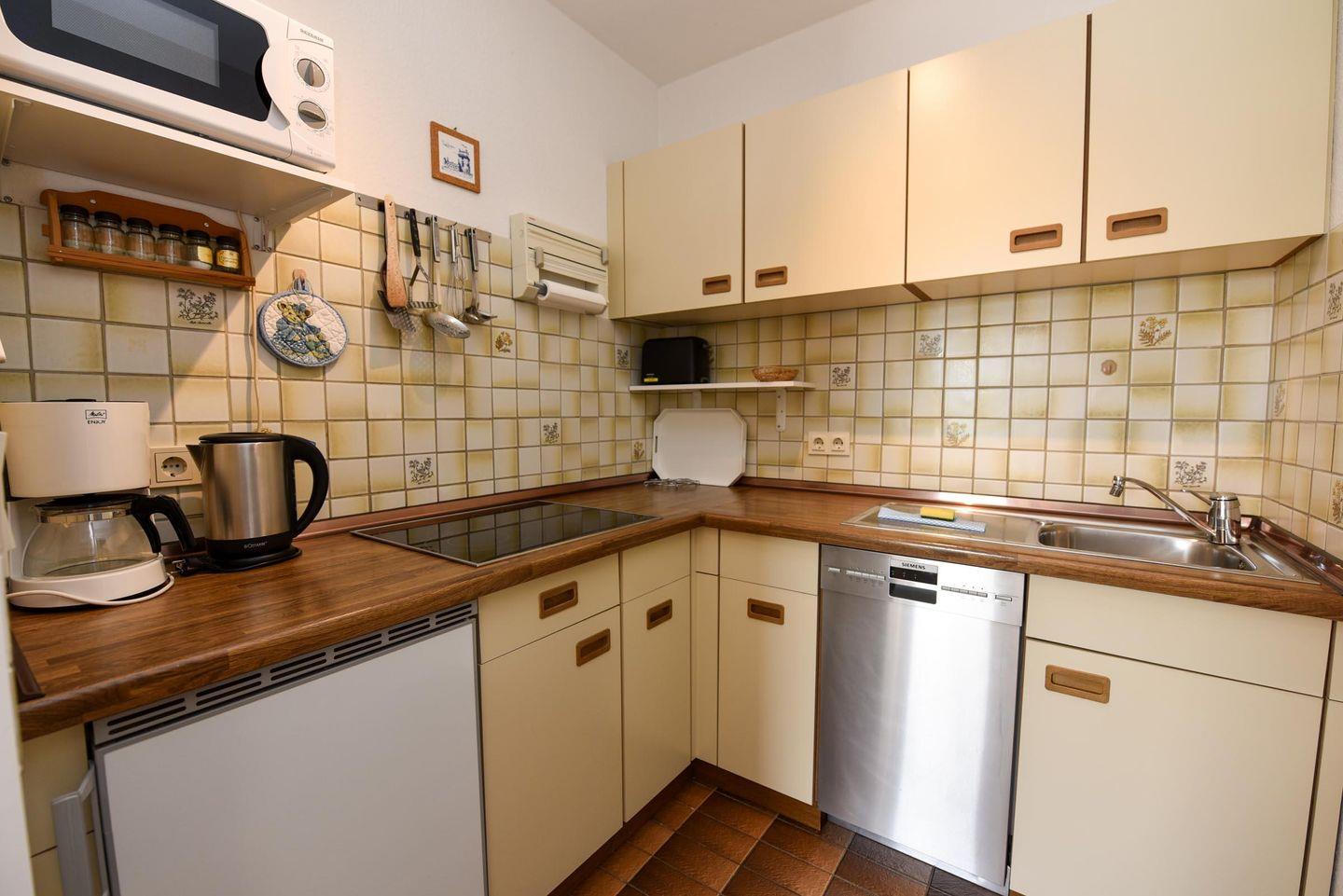 Die offene Küche ist großzügig gestaltet und voll ausgestattet – inklusive Spülmaschine, Mikrowelle, Cerankochfeld und Kaffeemaschine. Das Schlafzimmer verfügt über ein komfortables Boxspringbett, das zweite Zimmer über ein Einzelbett sowie einen Schreibtisch – ideal für die Kombination aus Urlaub und Homeoffice.