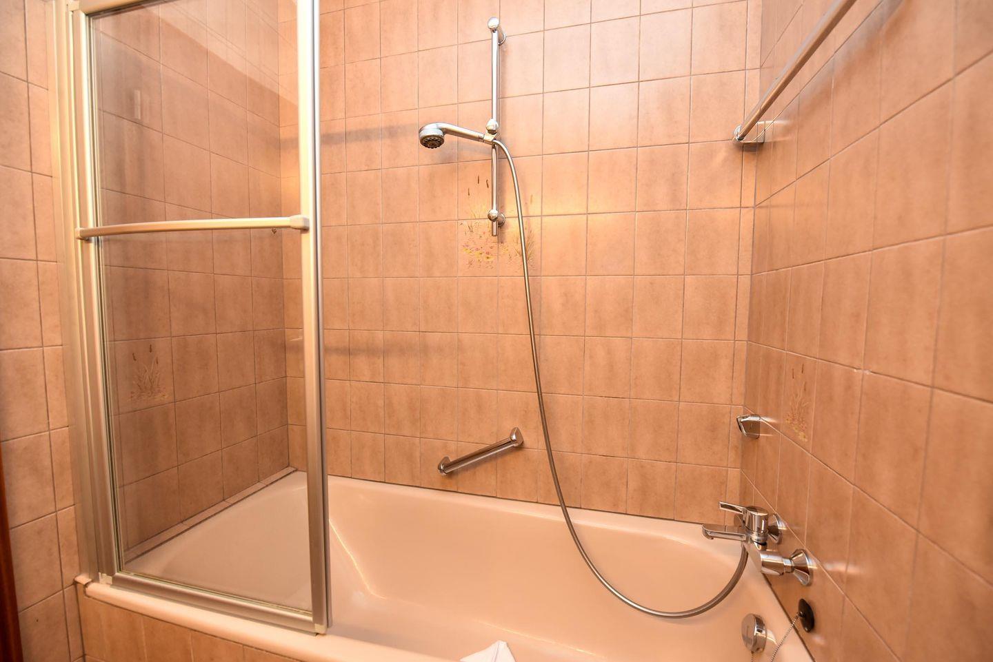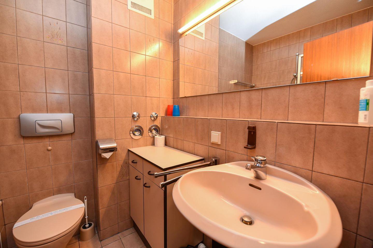 Das Duschwannenbad mit WC ist modern und funktional eingerichtet. Ein kostenloser Tiefgaragenstellplatz (Einfahrthöhe max. 195 cm) rundet das Angebot ab.