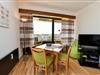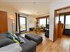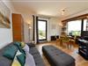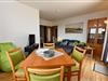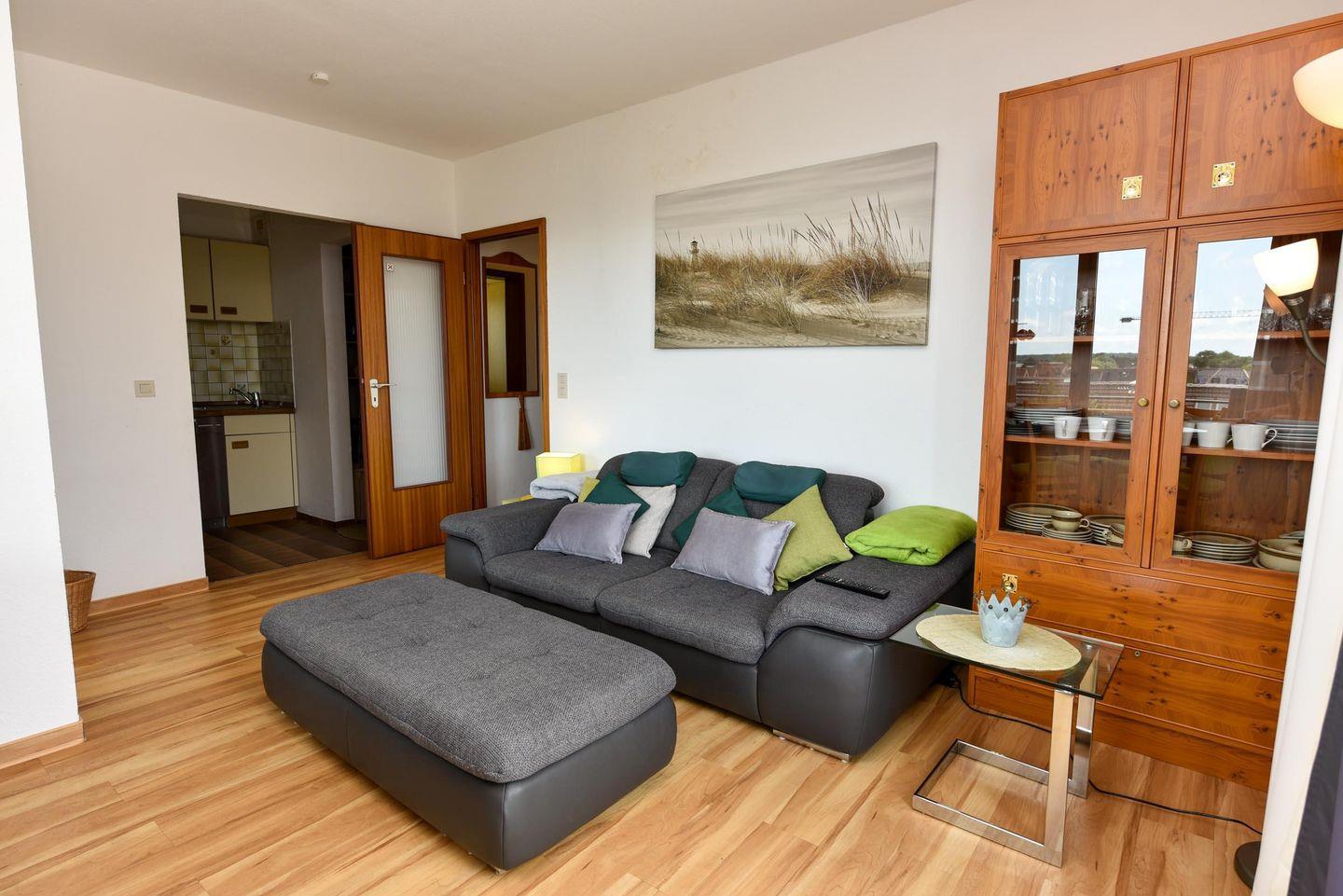 Im Wohnbereich sorgt ein modernes Sofa mit Sitztiefenverstellung und Relax-Hocker für Komfort. Ein Esstisch bietet Platz für bis zu drei Personen. Vom Wohnzimmer aus gelangen Sie sowohl auf den Südbalkon als auch auf die Seesichtterrasse.