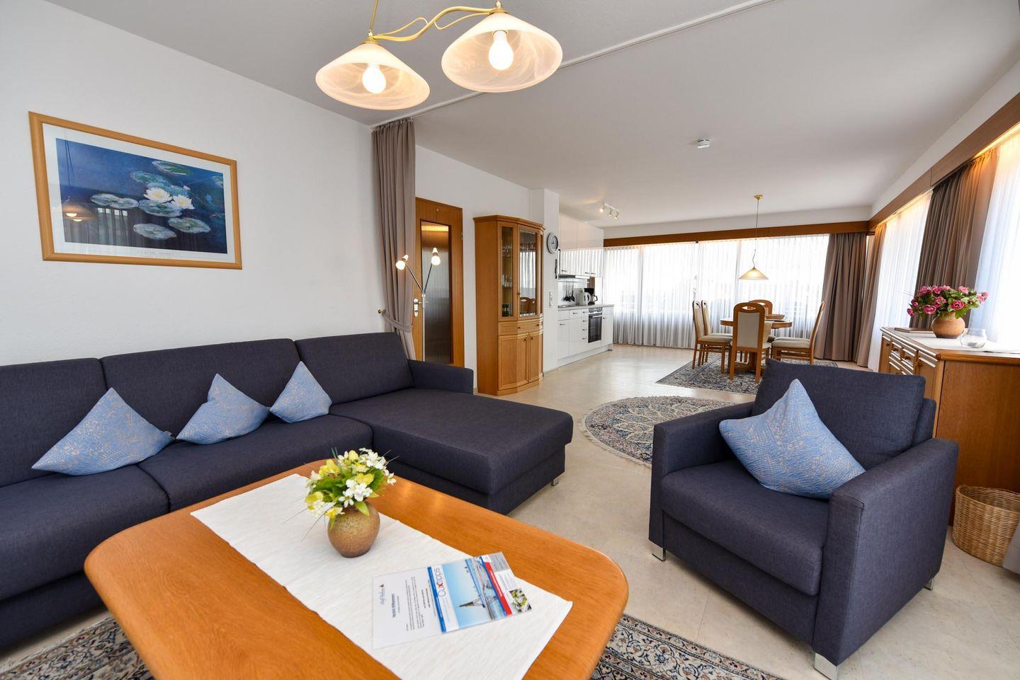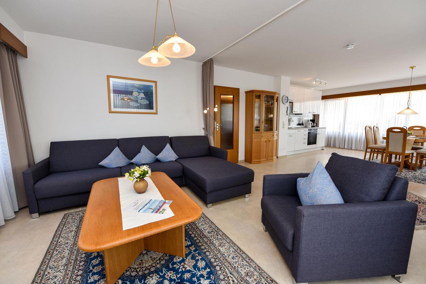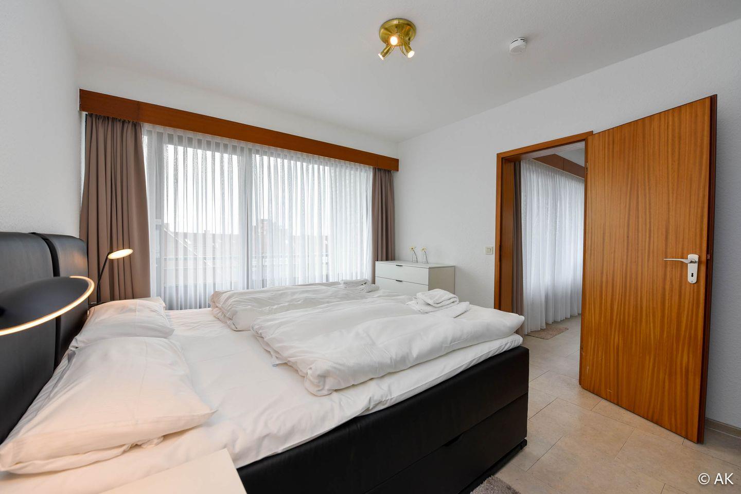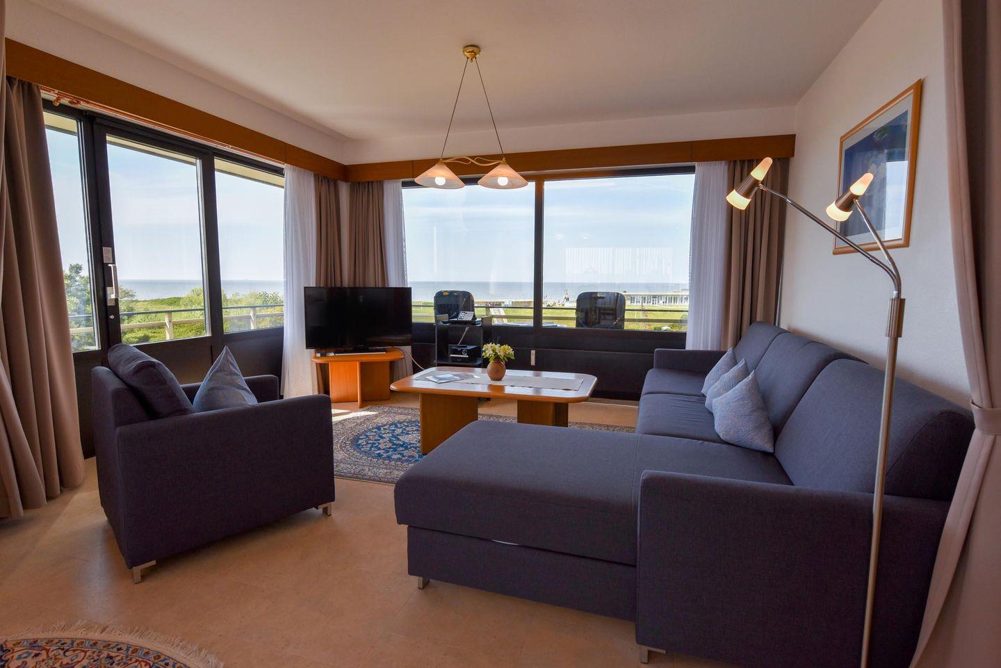 2-Zimmer Appartement im 4. OG mit 2 großen Balkon-Terrassen und toller Sicht auf den Weltschifffahrtsweg. Zu dem Appartement gehört auch ein Strandkorb (01.05.-30.09.) am nur wenige Minuten entfernten Strand. Komfortabler und mit PVC Belag ausgelegter Wohnbereich der für 2 bis 4 Personen eingerichtet ist. Es gibt eine separate und gut ausgestattete Küchenzeile mit Mikrowelle und Geschirrspüler. Im Wohnbereich befindet sich u.a. ein Schlafsofa, zwei gemütliche Sessel, sowie ein Esstisch mit dazugehörigen Stühlen. Der Schlafraum ist mit einem Ehebett ausgestattet. Das Bad verfügt über ein Dusch- und Wannenbad sowie ein WC, es gibt aber zusätzlich noch ein separates WC. Der Tiefgaragenstellplatz hat eine Einstellhöhe von bis 190 cm.