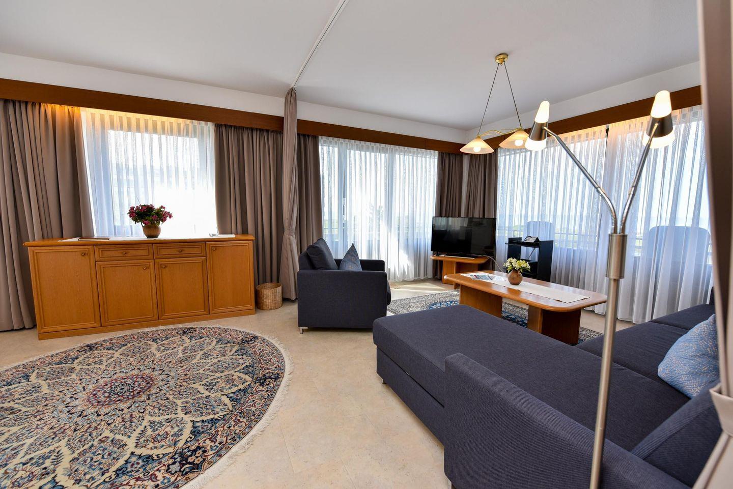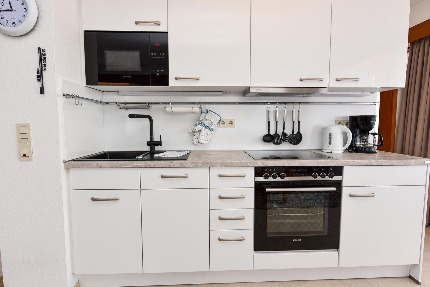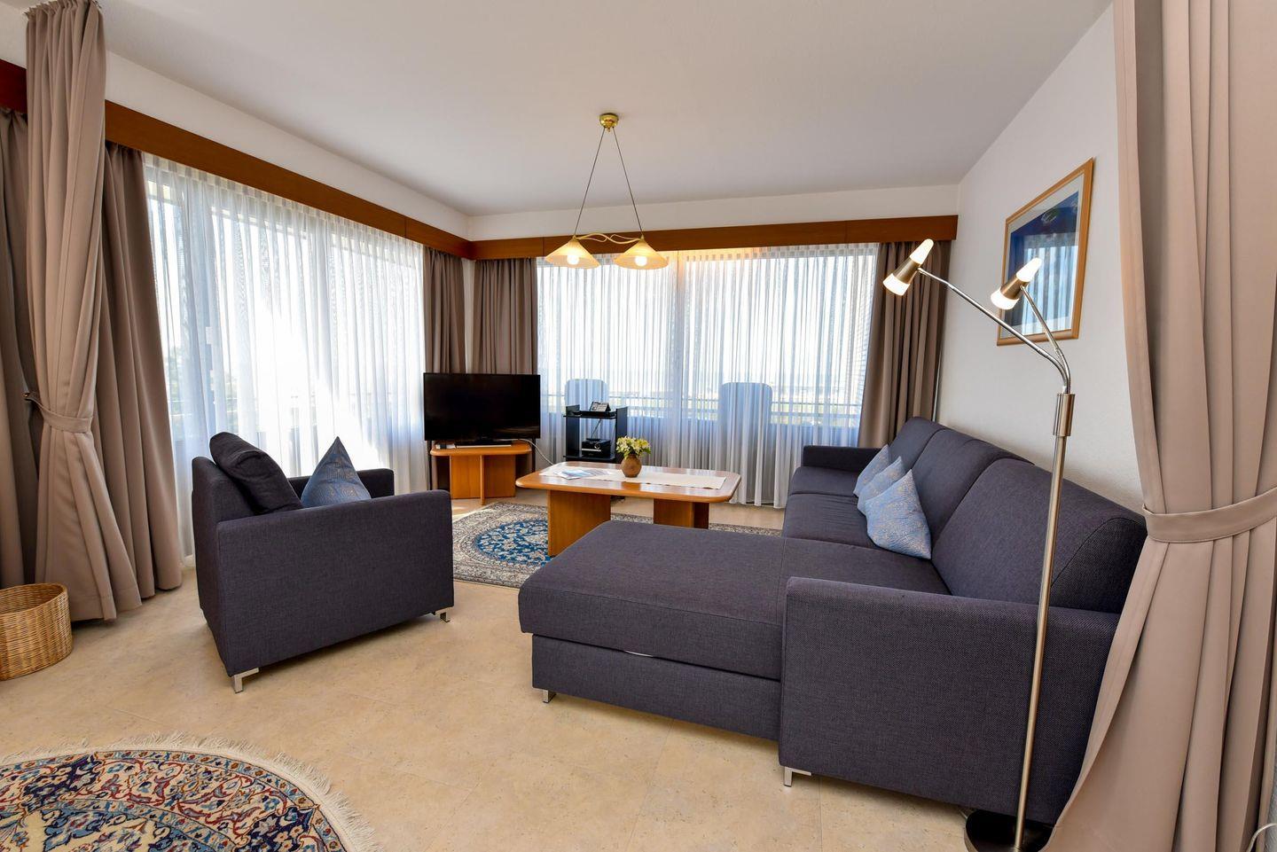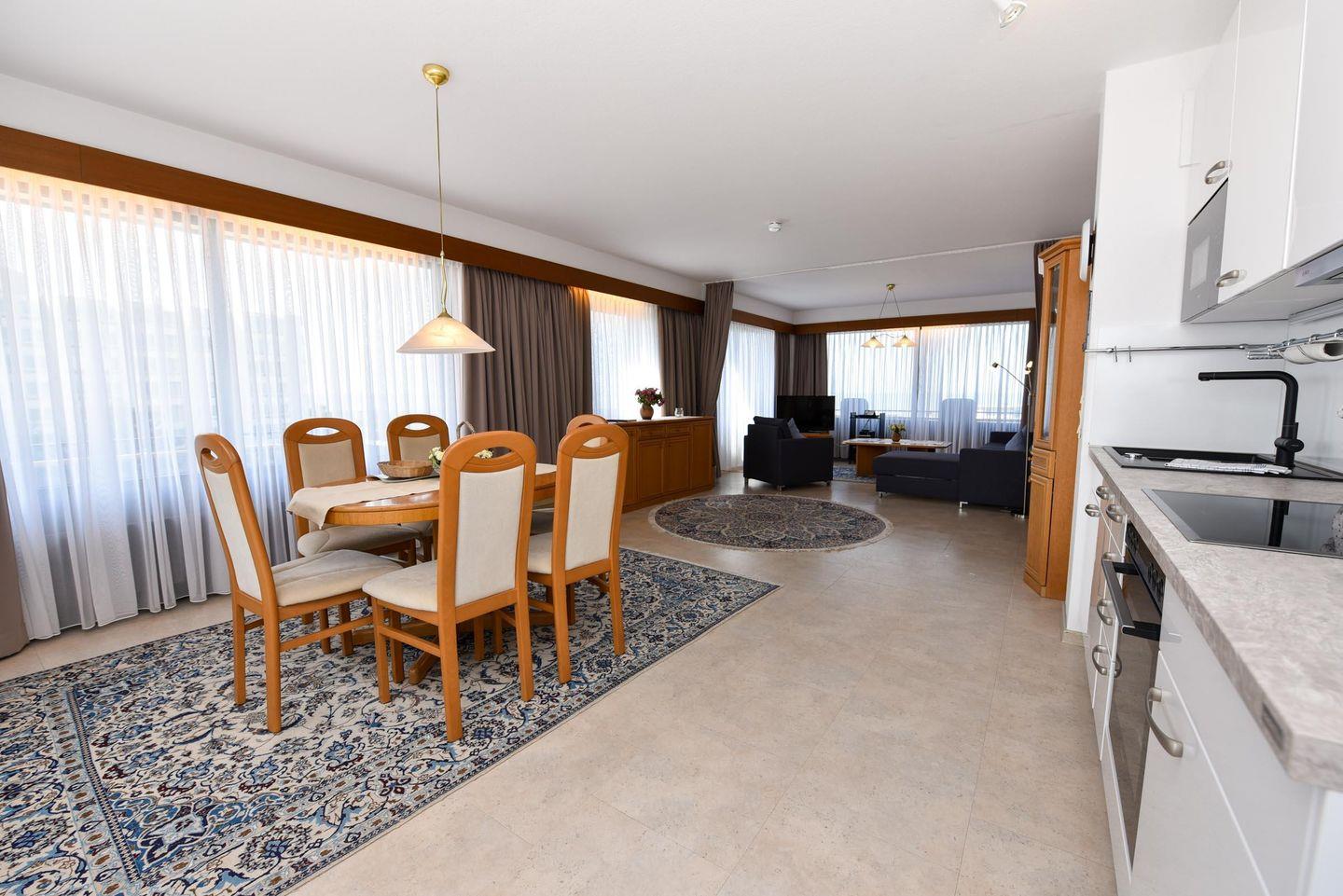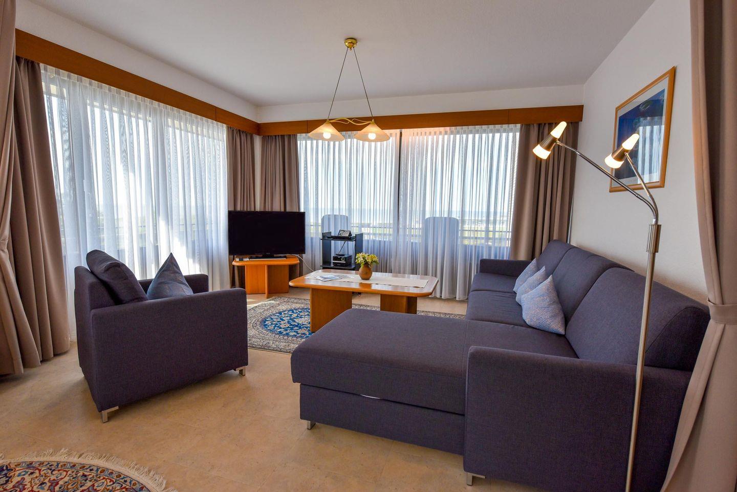 2-Zimmer Appartement im 4. OG mit 2 großen Balkon-Terrassen und toller Sicht auf den Weltschifffahrtsweg. Zu dem Appartement gehört auch ein Strandkorb (01.05.-30.09.) am nur wenige Minuten entfernten Strand. Komfortabler und mit PVC Belag ausgelegter Wohnbereich der für 2 bis 4 Personen eingerichtet ist. Es gibt eine separate und gut ausgestattete Küchenzeile mit Mikrowelle und Geschirrspüler. Im Wohnbereich befindet sich u.a. ein Schlafsofa, zwei gemütliche Sessel, sowie ein Esstisch mit dazugehörigen Stühlen. Der Schlafraum ist mit einem Ehebett ausgestattet. Das Bad verfügt über ein Dusch- und Wannenbad sowie ein WC, es gibt aber zusätzlich noch ein separates WC. Der Tiefgaragenstellplatz hat eine Einstellhöhe von bis 190 cm.
