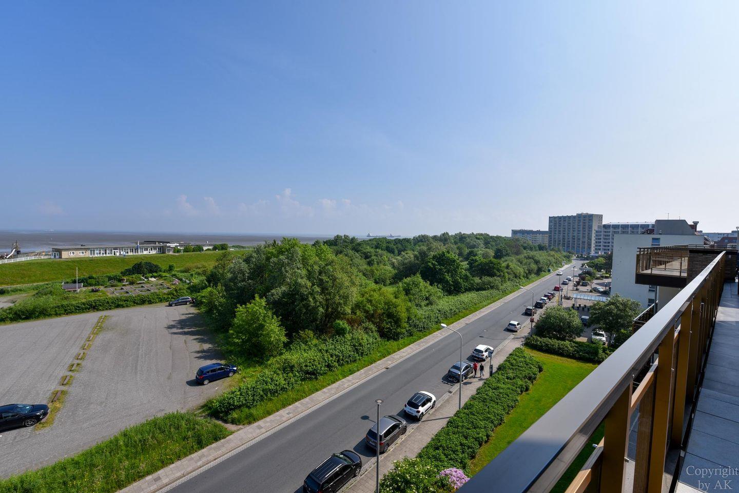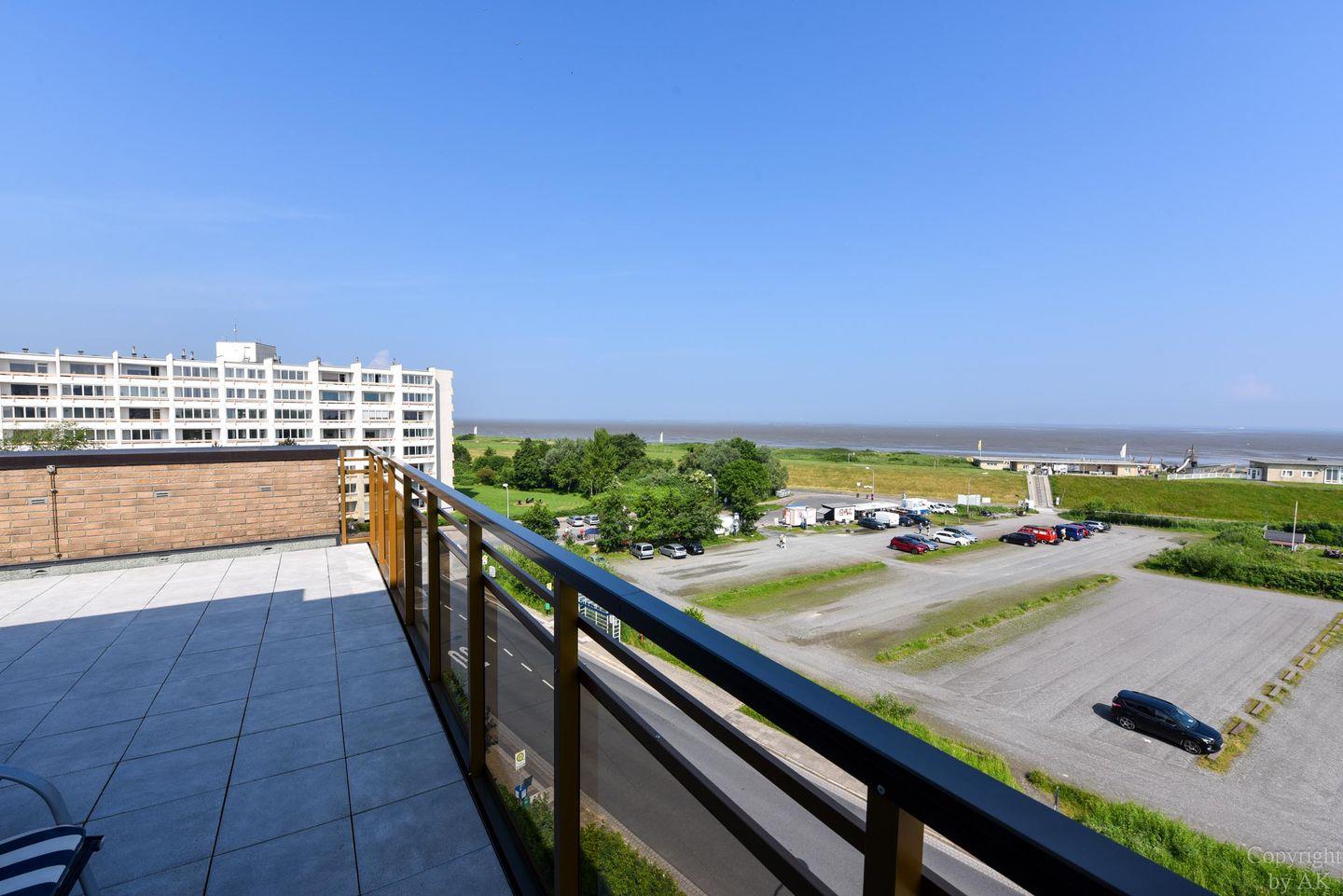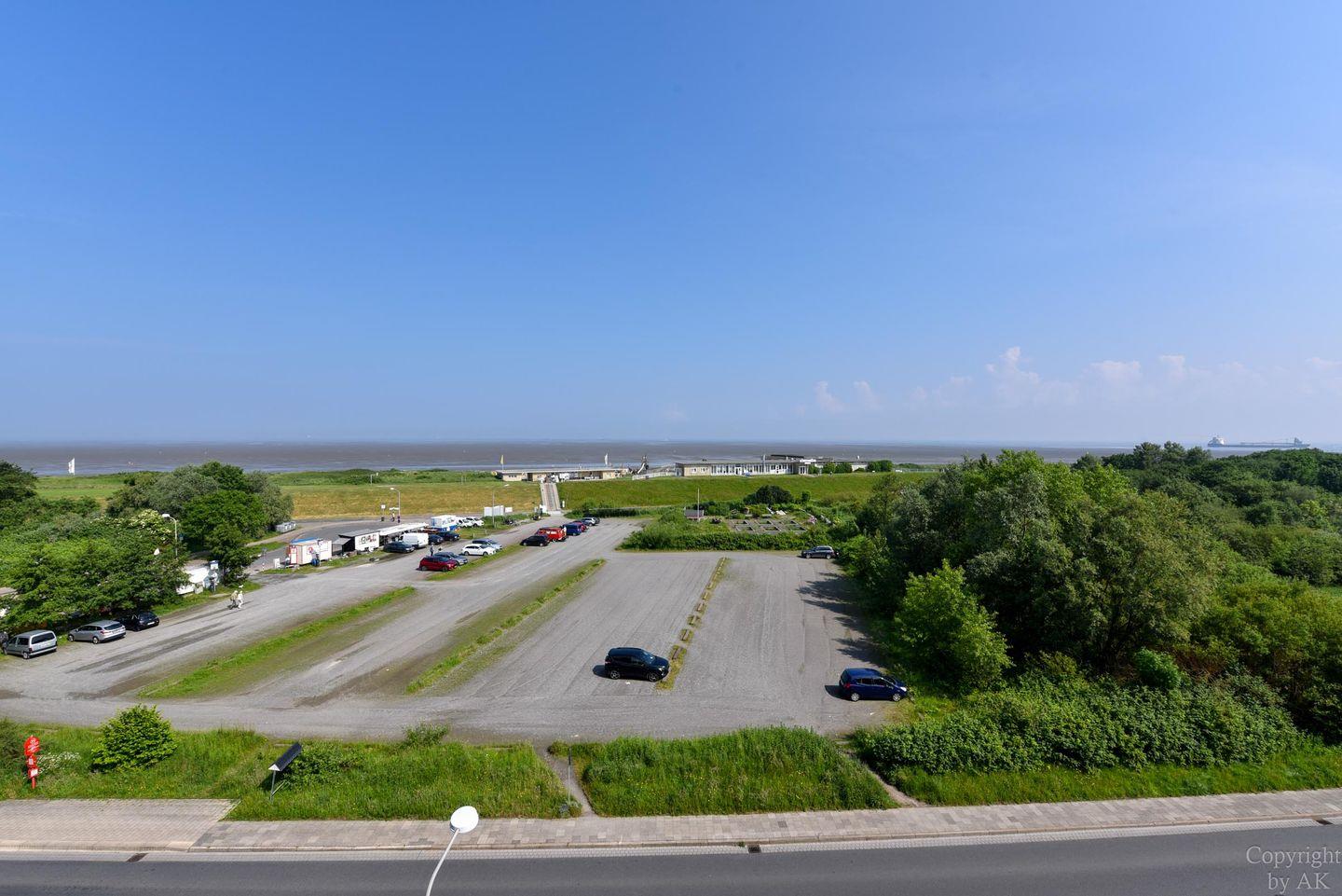 2-Zimmer-Appartement im 5. Obergeschoss in Nordwestlage mit herrlichem Blick auf den Weltschifffahrtsweg und das UNESCO-Weltnaturerbe Wattenmeer. Der Wohnbereich ist mit einem Schlafsofa, zwei Sesseln sowie einem Esstisch mit vier Stühlen ausgestattet. Der Schlafraum auf der Empore, mit einer Kopfhöhe von 165–175 cm, verfügt über zwei Einzelbetten (120 cm x 200 cm). Die Küchenzeile ist gut ausgestattet und bietet alles für die Zubereitung kleiner Mahlzeiten. Das Badezimmer wurde renoviert und ist nun mit WC, Badewanne, Dusche und einem Waschbecken ausgestattet. Zum Appartement gehört außerdem ein Strandkorb (01.05.–30.09.) am nahegelegenen Sandstrand von Döse. Ein kostenloser Tiefgaragenstellplatz (Einfahrtshöhe 190 cm) steht ebenfalls zur Verfügung.