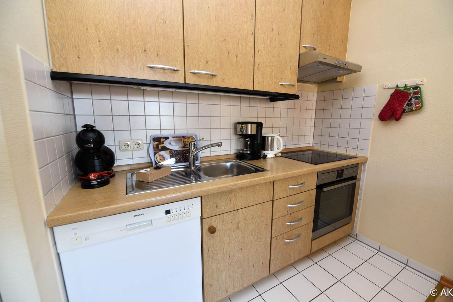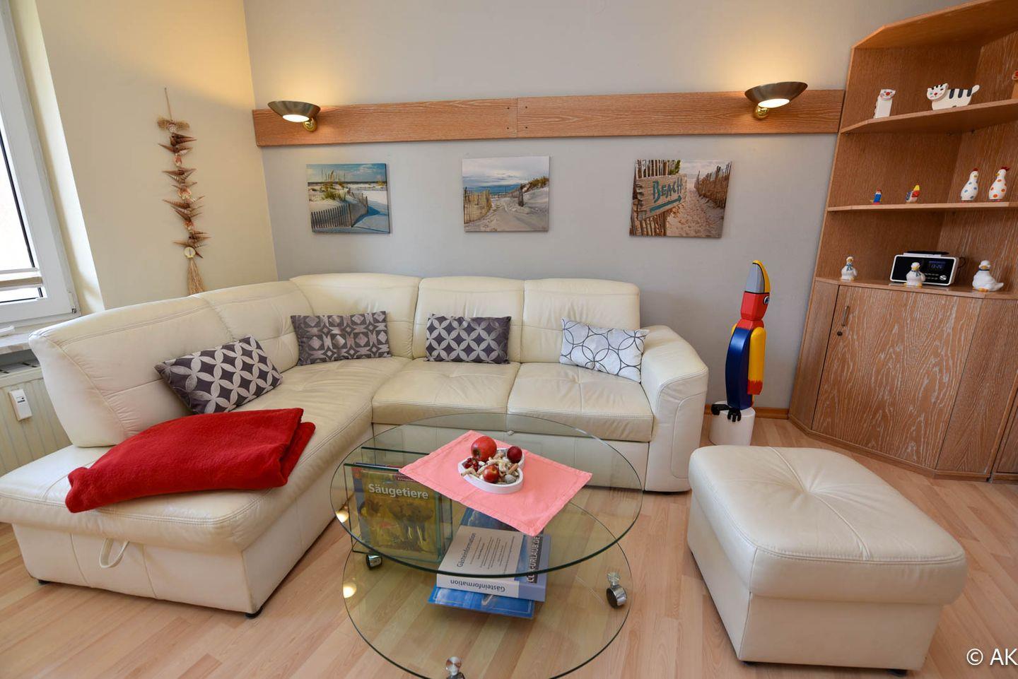 Die Ferienwohnung ist in einen Wohn- und Essbereich aufgeteilt, der eine vollständig ausgestattete Küchenzeile und eine moderne Sitzgruppe für bis zu vier Personen umfasst. Für Unterhaltung an regnerischen Tagen sorgen eine Auswahl an Spielen, ein DVD-Player und eine kleine HIFI-Anlage. Die behagliche Sesselecke mit einer ausziehbaren Ledercouch bietet den idealen Platz für entspannte Fernsehabende.