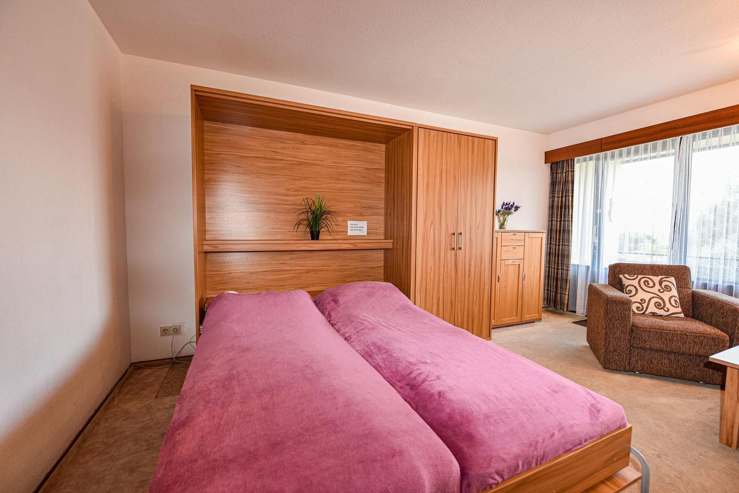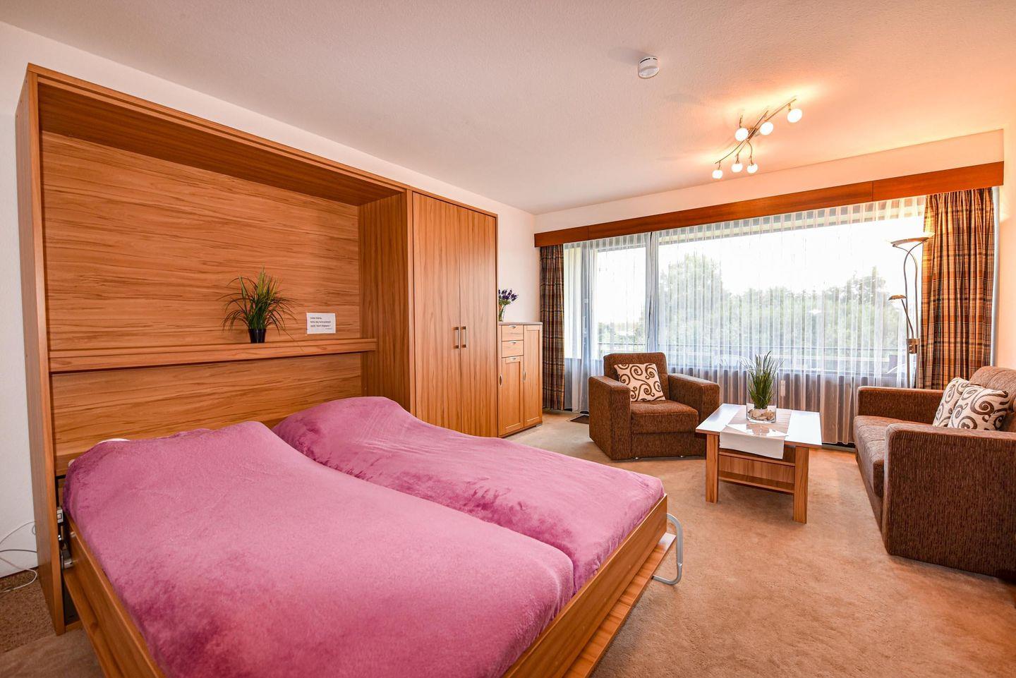 Der Wohnbereich ist mit Teppichboden ausgelegt und verfügt über ein Schrankbett, einen Tisch mit zwei Stühlen, einen Sessel sowie ein Sofa mit Couchtisch. Die separate Küchennische bietet alles Nötige für die Selbstverpflegung.