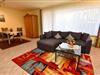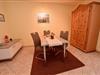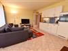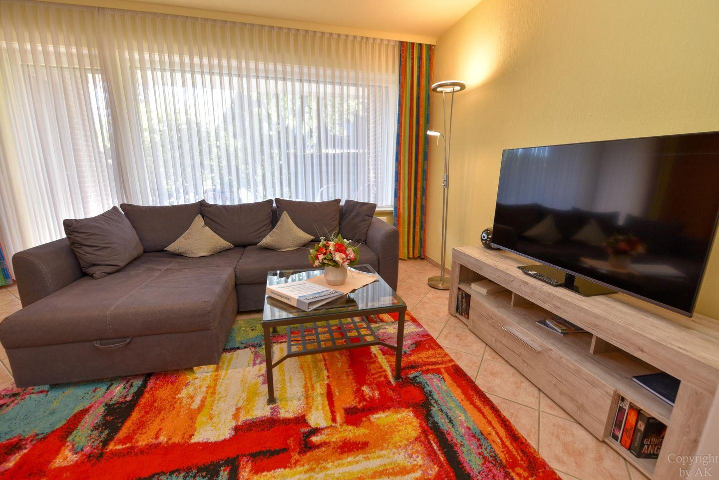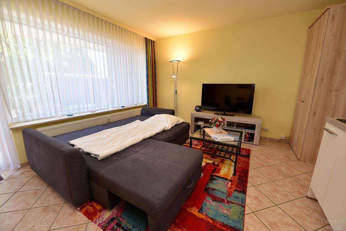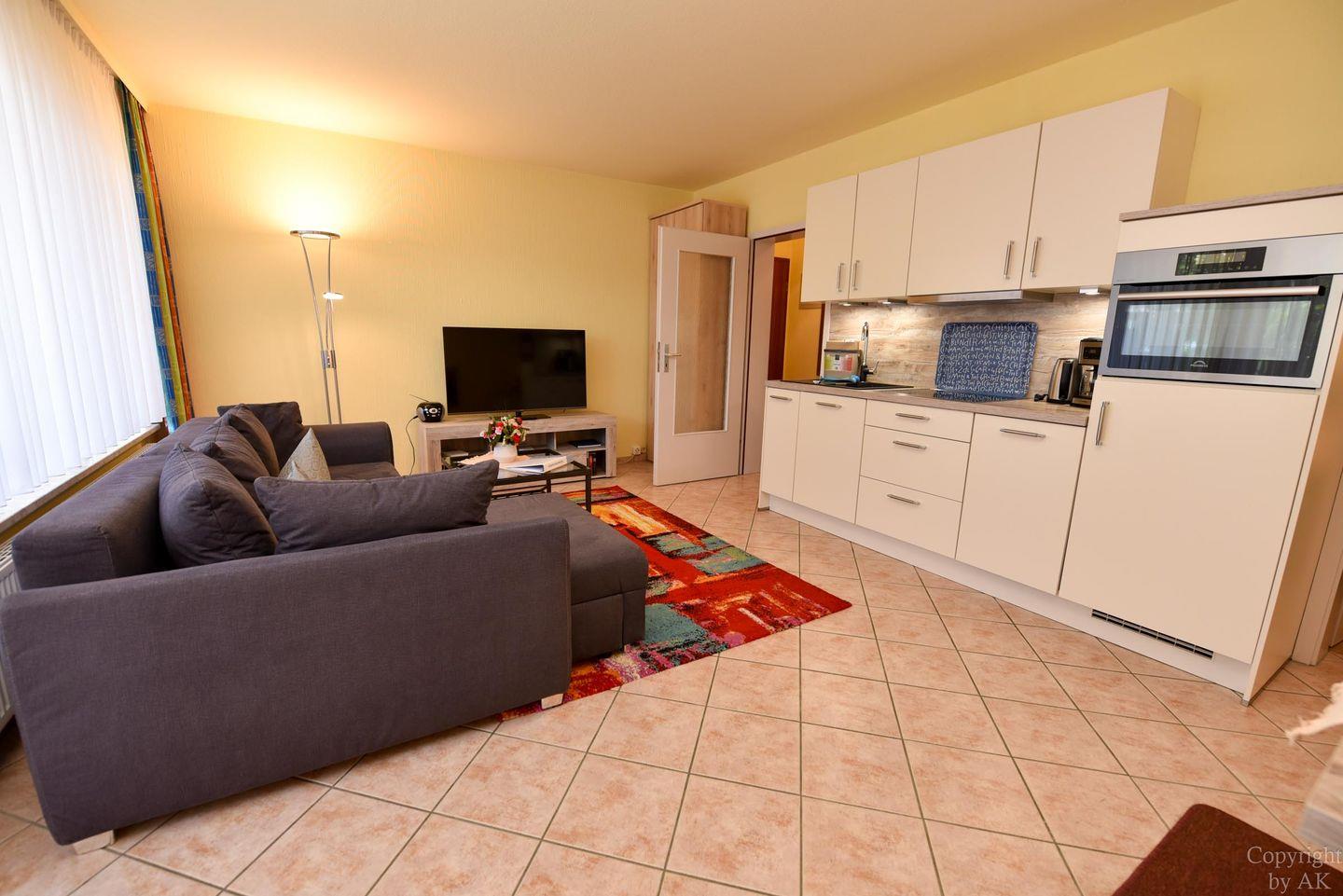 Der helle Wohnbereich ist mit einem Schlafsofa, einem Kleiderschrank und einem Esstisch mit drei Stühlen eingerichtet. Die moderne, im Wohnraum integrierte Küche ist mit Cerankochfeld, Spülmaschine und allem ausgestattet, was Sie für einen entspannten Aufenthalt benötigen.
