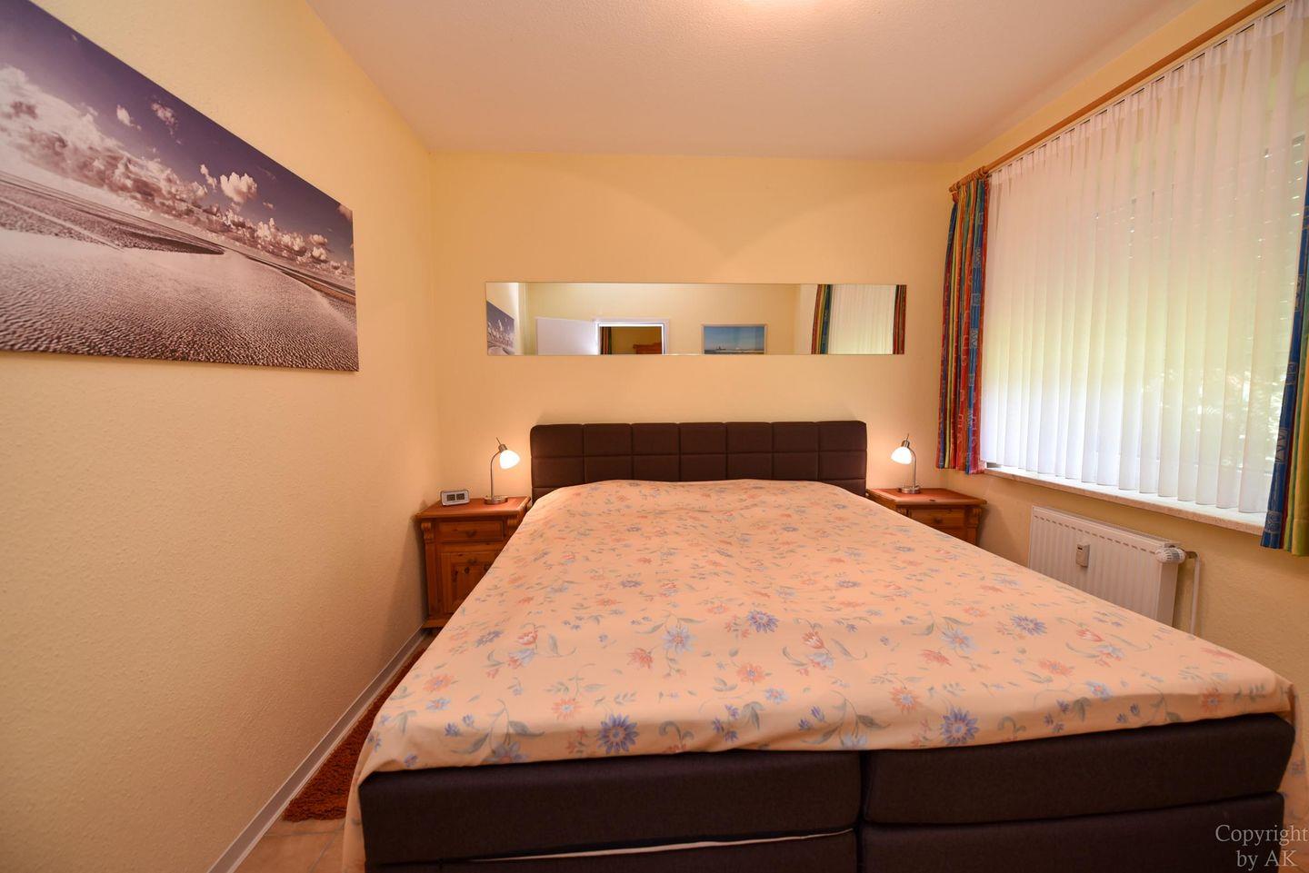 Im separaten Schlafzimmer sorgt ein bequemes Boxspringbett für hohen Schlafkomfort. Das Badezimmer verfügt über eine bodengleiche, barrierefrei begehbare Dusche – ideal auch für Gäste mit eingeschränkter Mobilität.