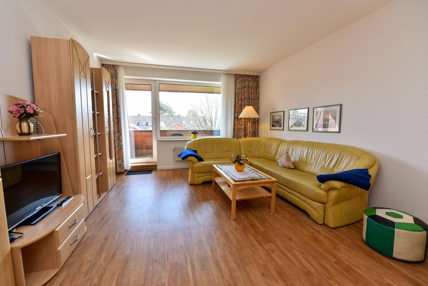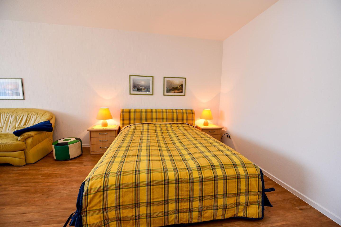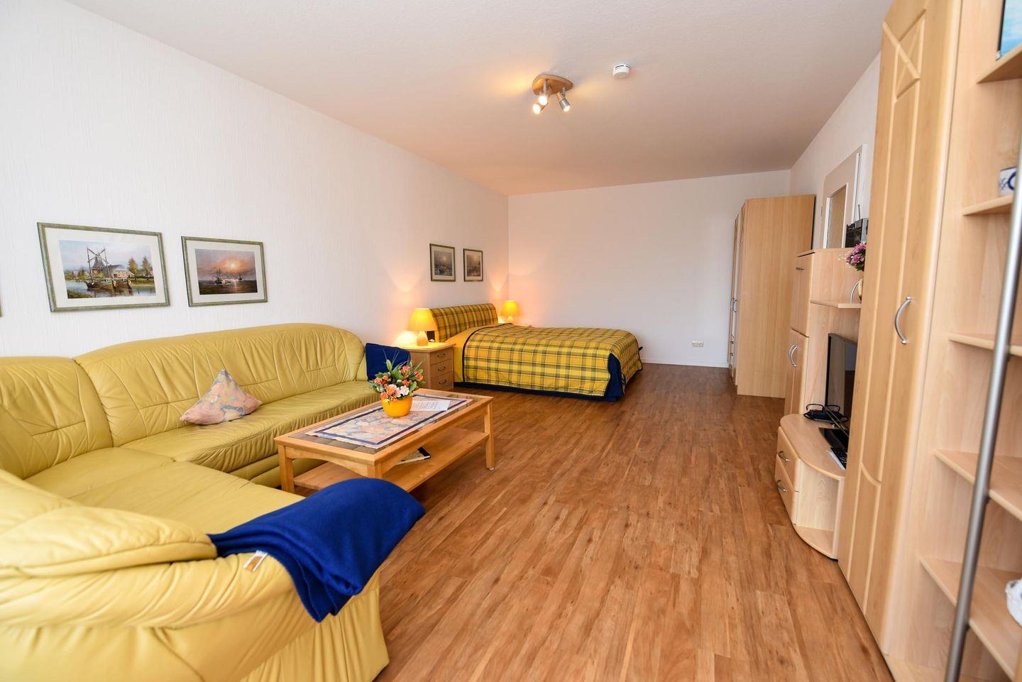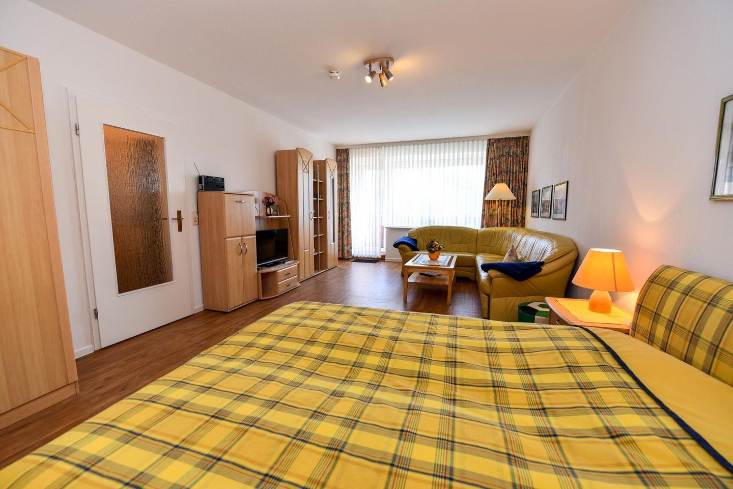1-Zimmer-Ferienwohnung im 1. OG des Hauses LEE mit kostenfreiem WLAN. Sehr schöne und komfortable Ferienwohnung: 1 Wohn-Schlafraum (Ehebett). 1 Küchenraum mit Esstisch, Stühle, Einbauküche mit Mikrowelle und Geschirrspüler. Im Wohn-/Schlaf-raum Couchgarnitur und Ehebett. Wannenduschbad/WC, Kabel-TV, Balkon. Spielrasen, Spielgerät und Sandkiste auf dem Grundstück, PKW-Stellplatz. Schwimmbadnutzung kostenfrei!