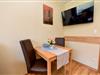 Modern eingerichtetes und bedingt behindertengerechtes 1- Zimmer-Appartement im Erdgeschoss mit großem Balkon. Im Wohn-/Schlaf-/ Essbereich gibt es ein einzeln klappbares Doppelschrankbett, ein Sofa mit passendem Sessel, sowie einen Esstisch. Zum Kochen gibt es eine Kochnische, welche mit einem Ceranfeld Herd mit zwei Platten ausgestattet ist. Das Appartement hat ein neues WC/Duschbad. Es gibt natürlich einen Kabel-Flach- TV und W-LAN. Der dazugehörige PKW Stellplatz in der Tiefgarage hat eine Einstellhöhe von 1,49.m