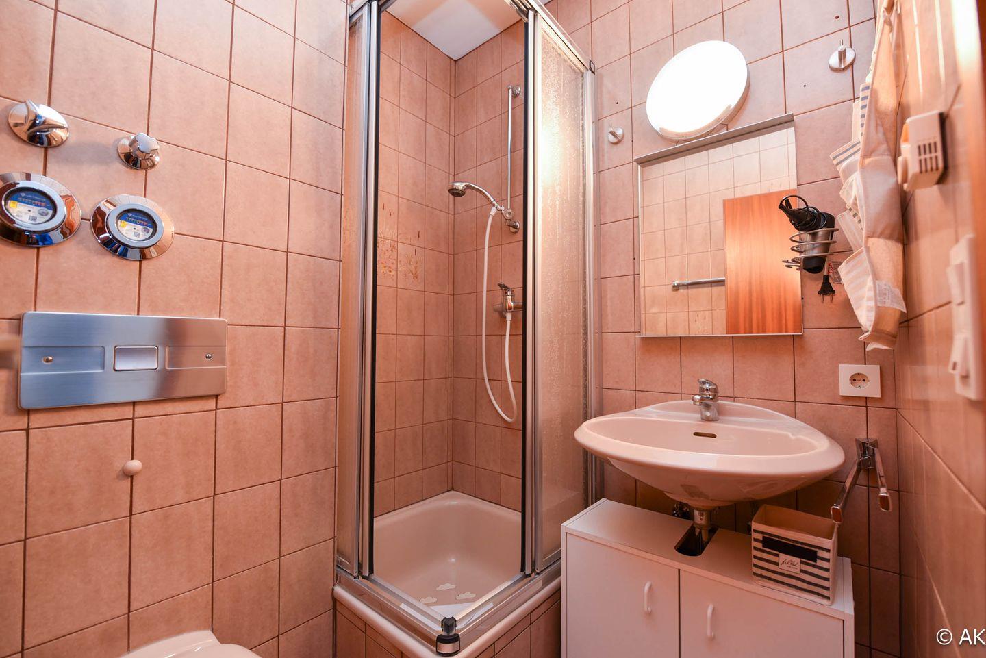 Das Appartement ist für zwei Personen eingerichtet und verfügt über eine praktische Küchenzeile, in der Sie kleinere Gerichte zubereiten können. Das moderne Duschbad mit WC rundet die Ausstattung ab.