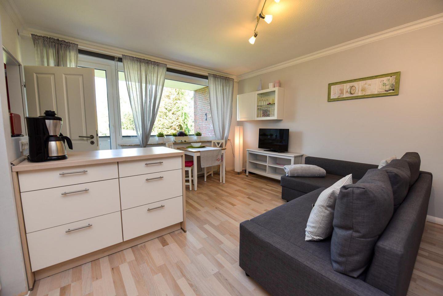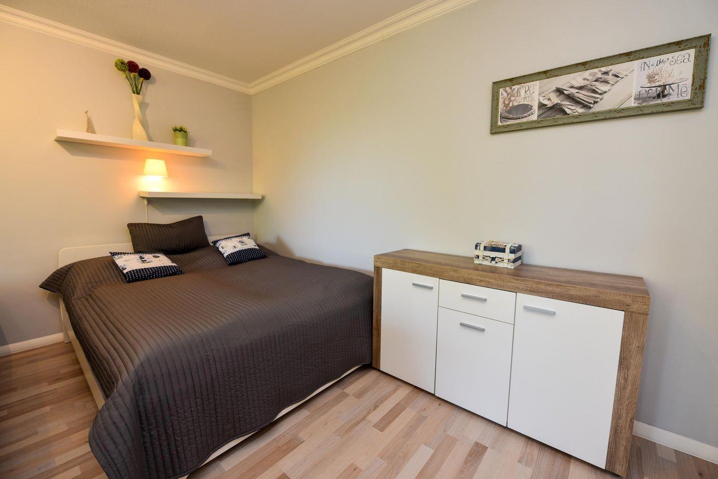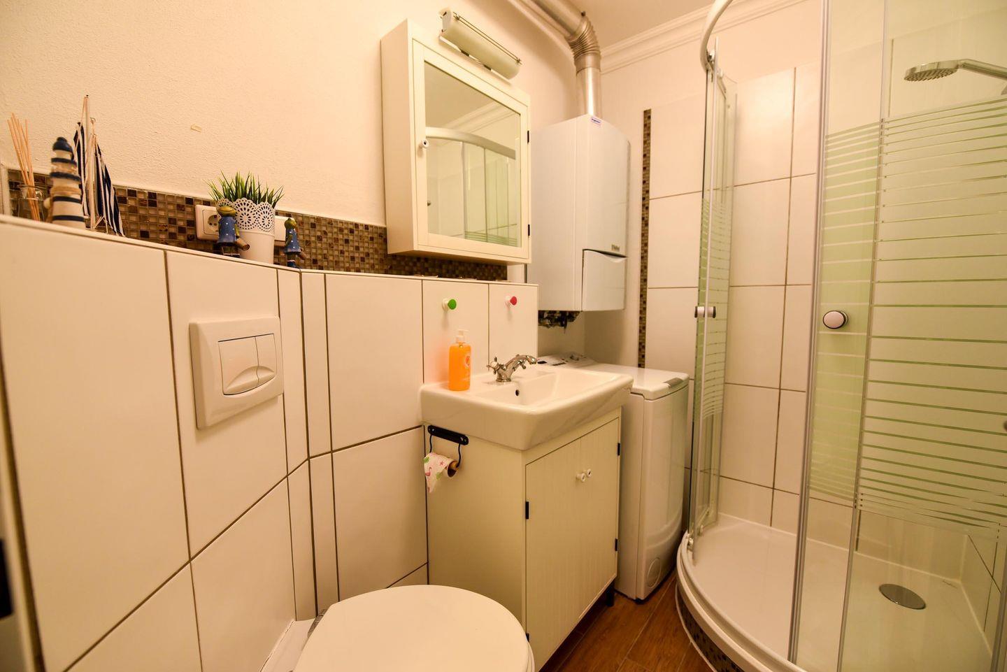 Das modern und gemütlich eingerichtete 2 Zimmer Appartement (1.Etage, ohne WLAN) liegt zentral in Döse. Der sonnige Westbalkon mit Blick in den Garten bietet Entspannung an frischer Luft. Neben einem Wohn-Ess-Schlafzimmer mit offener Küche und Zugang zum Balkon steht Ihnen ein weiteres Zimmer mit Etagenbett, ein hellgefliestes Duschbad/WC und der Flur zur Verfügung. Bis zum Sand- oder Grünstrand sind es nur wenige Minuten mit dem Fahrrad, ebenso zum Kurzentrum / Kurpark. In der Nähe befinden sich Restaurants, Banken, Einkaufsmöglichkeiten und eine Bushaltestelle. Ein eigener PKW-Außenstellplatz (Nr.15) vor dem Haus und ein Fahrradabstellraum in der Hausanlage steht Ihnen zur Verfügung.