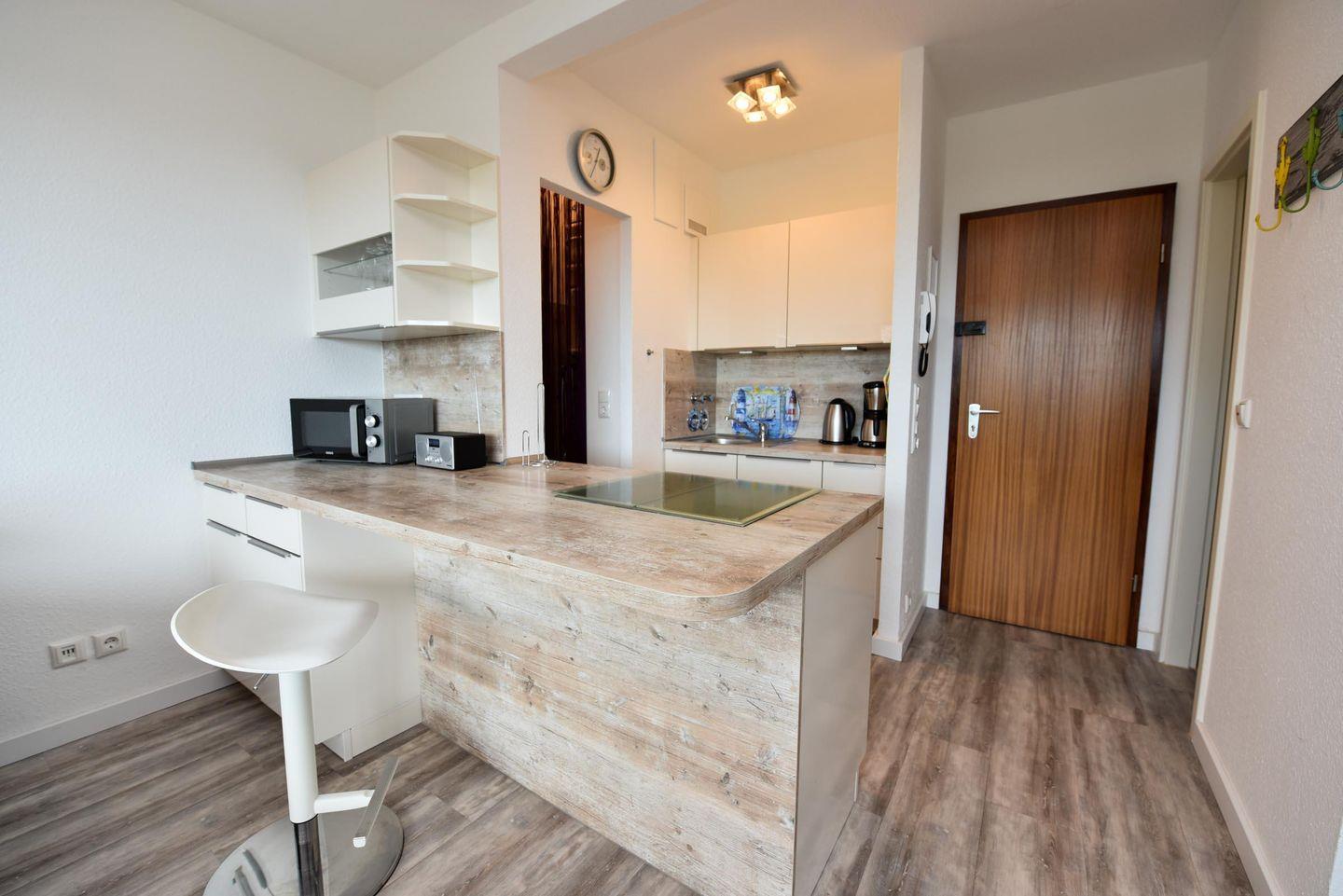 Freundliches 2-Zimmer Appartement im 1. OG mit großem Balkon und eingeschränkter Sicht auf den Weltschifffahrtweg. In 2018 wurde dieses freundliche Appartement grundsaniert und verfügt u.a. über einen allergikerfreundlichen Vinylboden. Im Wohn-/ Essbereich befindet sich eine integrierte und voll ausgestattete Küche, sowie ein Schlafsofa (140cm x 200cm), ein Sessel und eine Eckbank mit einem Stuhl. Das Schlafzimmer ist mit einem Doppelbett und einen weiteren TV -Gerät ausgestattet. Das Duschbad hat eine bodentiefe Dusche. Der kostenlose Tiefgaragenstellplatz hat eine Einstellhöhe von 149 cm, Der Eigentümer stellt seinen Gästen aber auch einen Parkausweis für den städtischen Parkplatz vor dem Haus zur Verfügung.