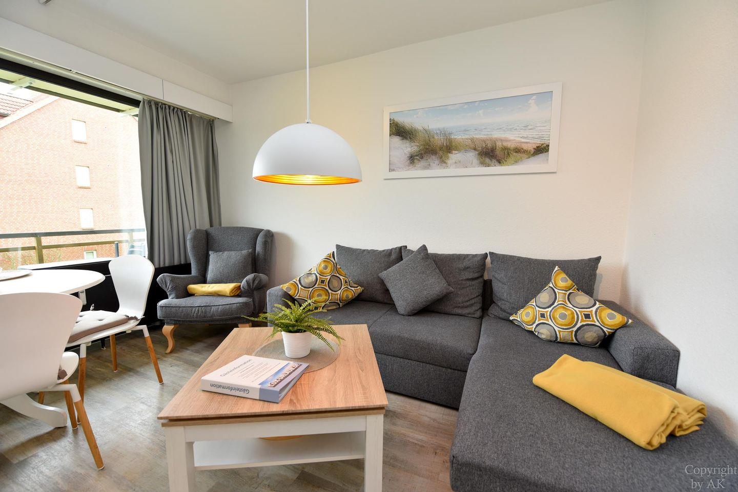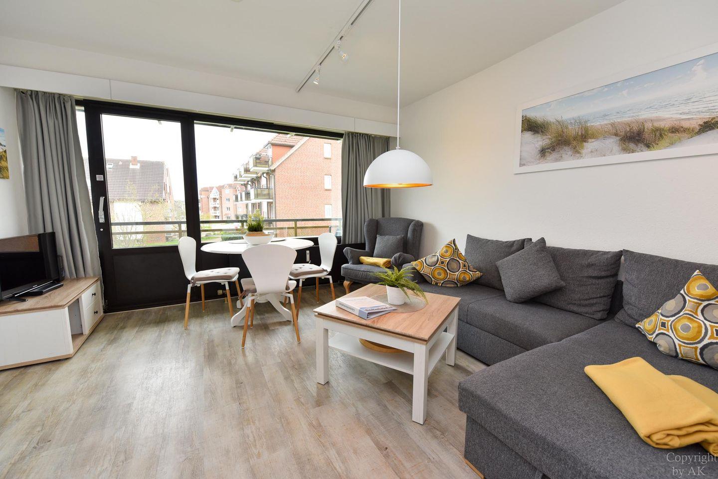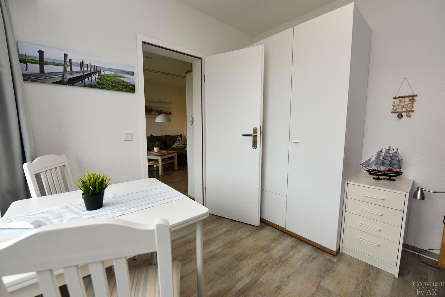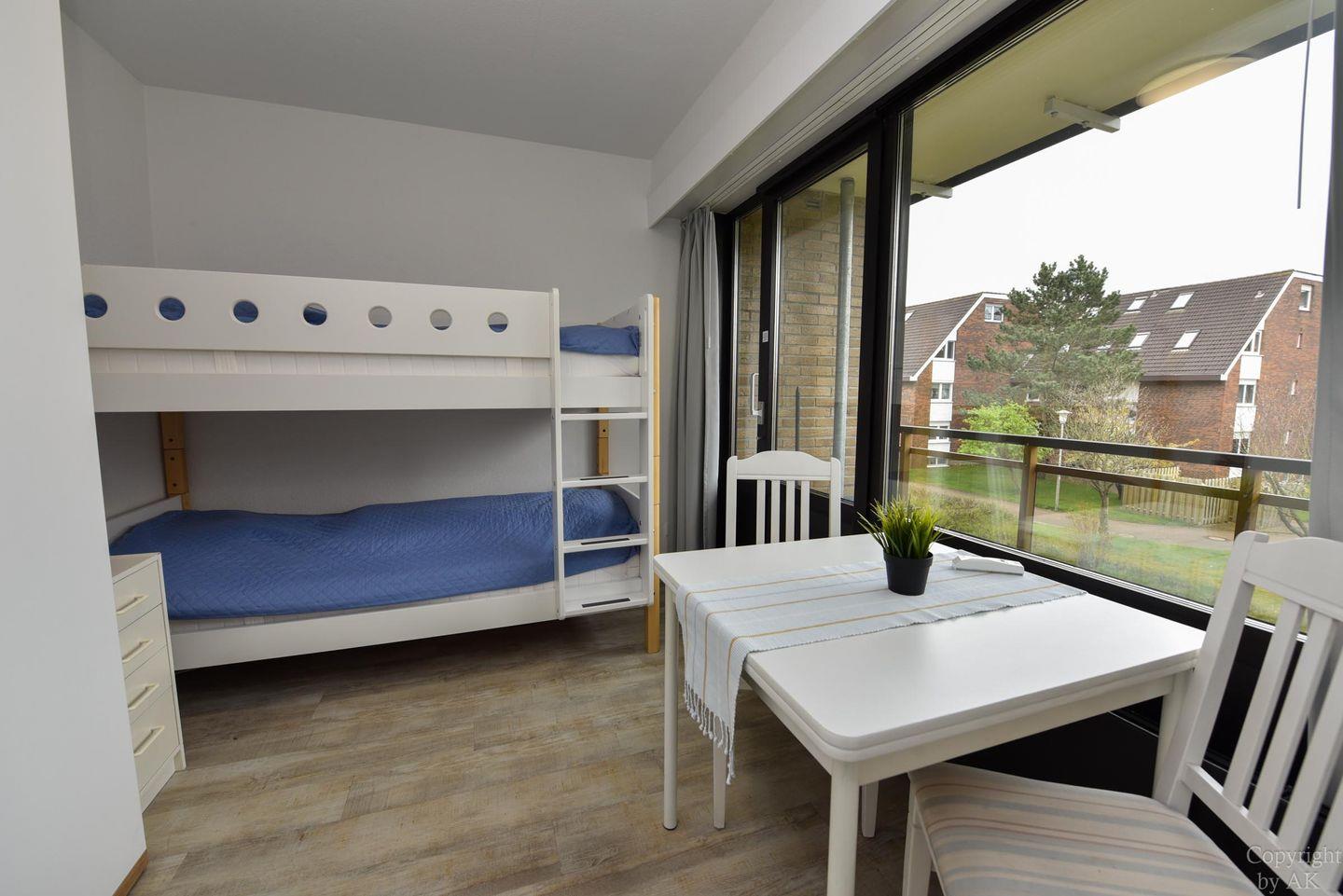 Gemütliches und frisch (2019) renoviertes 3-Zimmer Appartement im 1. OG mit Südbalkon. Im Wohn- und Essbereich befindet sich unter anderem ein Schlafsofa und ein bequemer Sessel der zum entspannen und TV schauen oder lesen einlädt. Dazu ist der Raum mit einem Esstisch ausgestattet. Der durch eine Falttür vom Wohnraum getrennte Schlafraum verfügt über ein Ehebett und einen großen Kleiderschrank. Im zweiten Schlafraum befindet sich ein freundliches Etagenbett und ein Kleiderschrank, sowie ein Tisch mit 2 Stühlen. In der separaten und gut ausgestatteten Küchennische ist ein Geschirrspüler und eine Mikrowelle untergebracht. Das moderne Bad mit geräumiger Dusche vervollständigt dieses schöne Appartement im Haus "Jan am Strand". Der dazugehörige und kostenlose Tiefgaragenstellplatz hat eine Einstellhöhe von 149 cm.