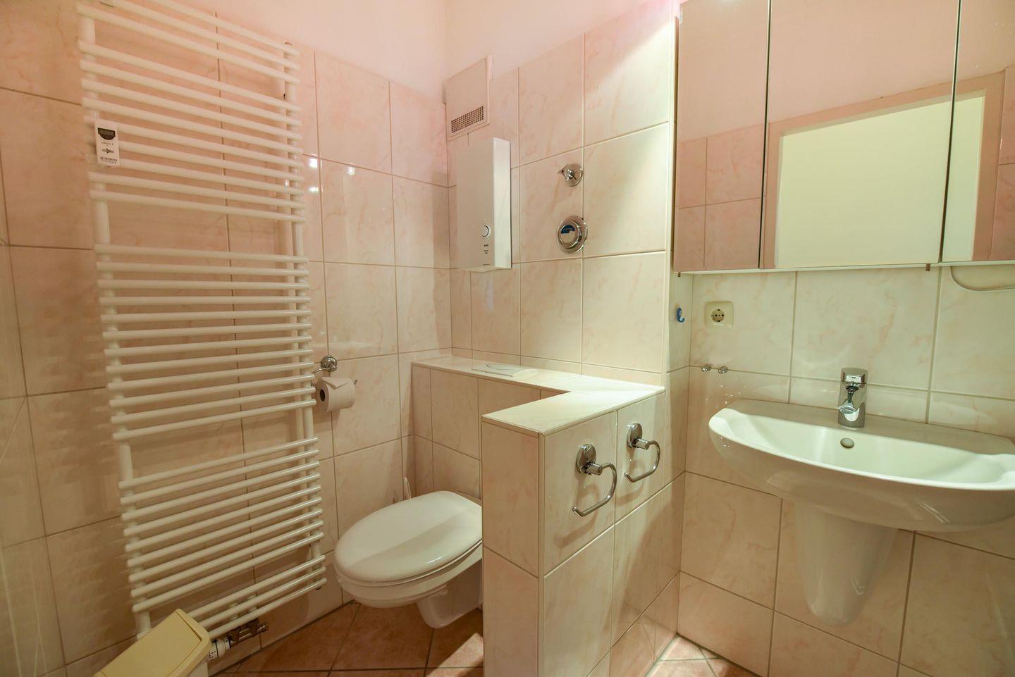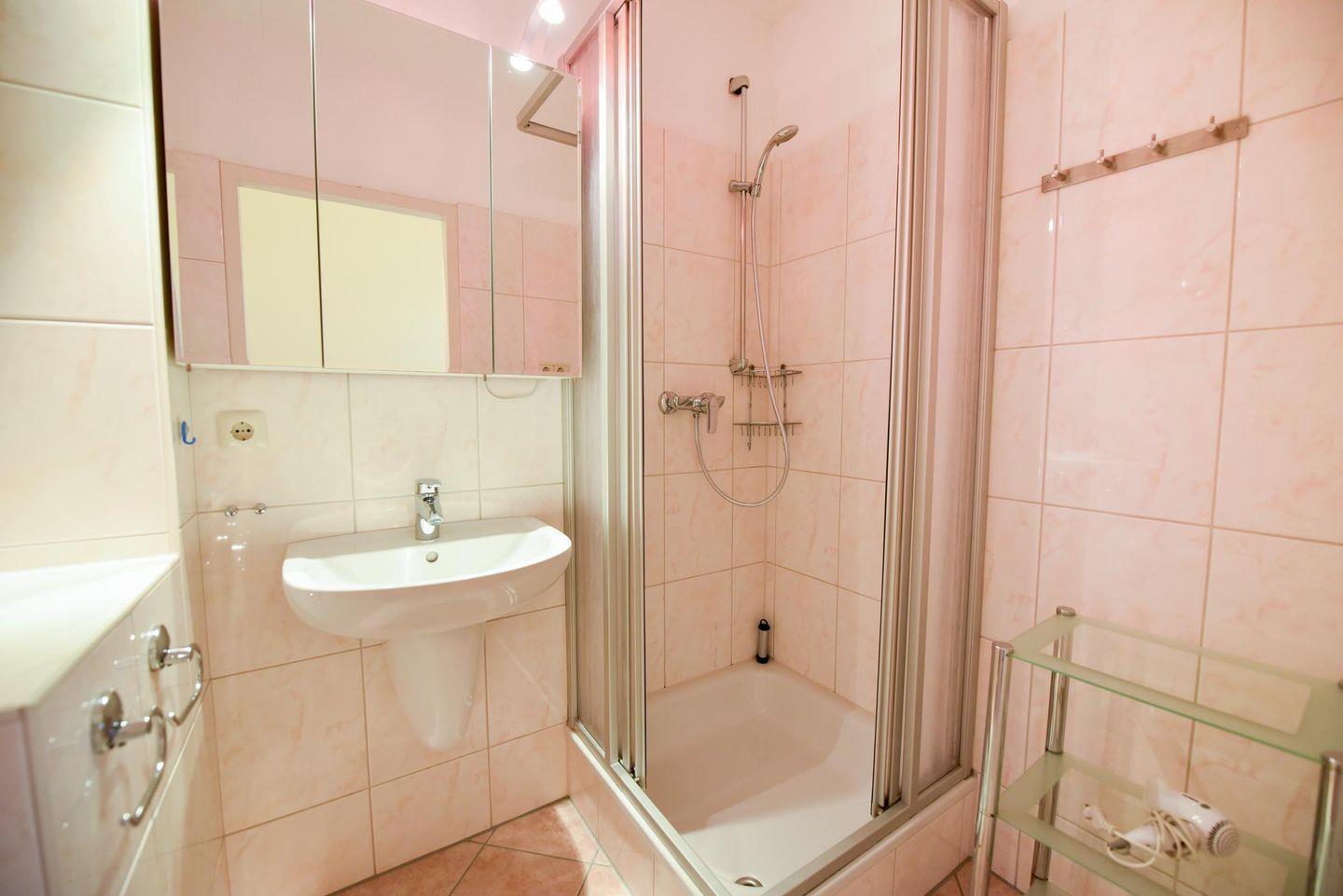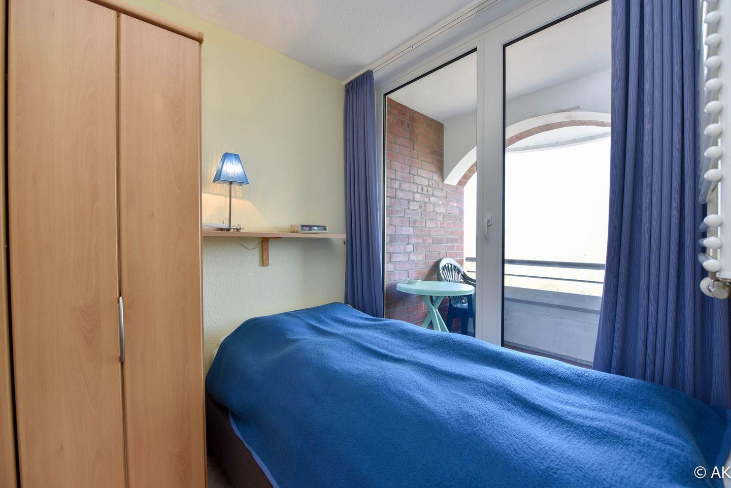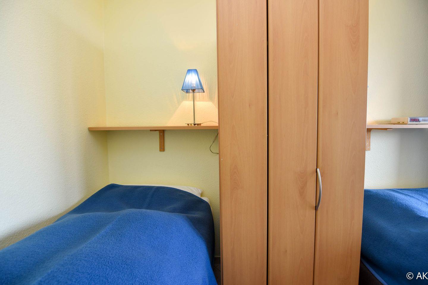 Der separate Schlafraum bietet zwei Einzelbetten und einen geräumigen Kleiderschrank für Ihre persönlichen Gegenstände. Abgerundet wird das Appartement durch ein Duschbad mit WC.