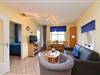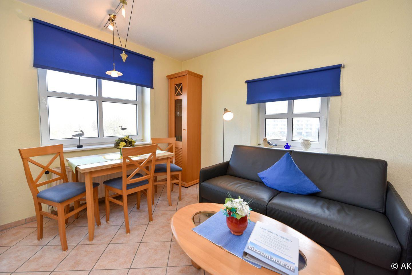 Der geräumige Wohn-/Ess-/Schlafbereich ist komfortabel eingerichtet und verfügt über eine Schlafcouch und einen gemütlichen Sessel. Ein Esstisch mit Stühlen lädt zu gemeinsamen Mahlzeiten ein. Zusätzlich erweitert ein Balkon den Wohnraum und bietet die perfekte Kulisse für entspannte Stunden im Freien.