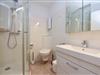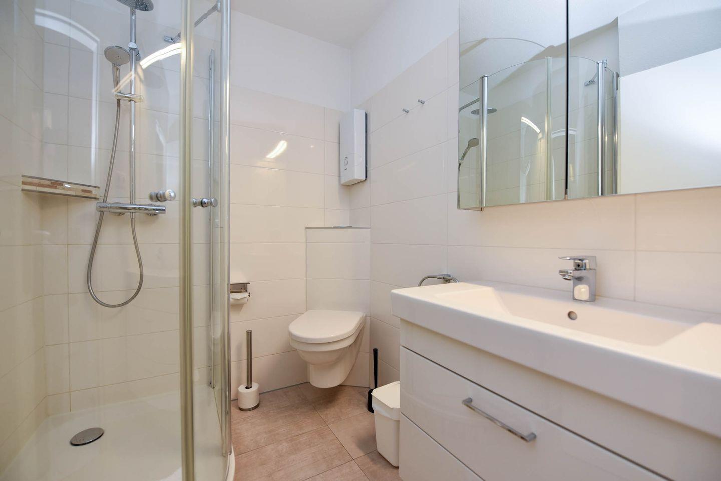 Das Badezimmer verfügt über eine Dusche und bietet alles, was Sie für einen angenehmen Aufenthalt benötigen.