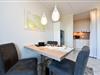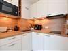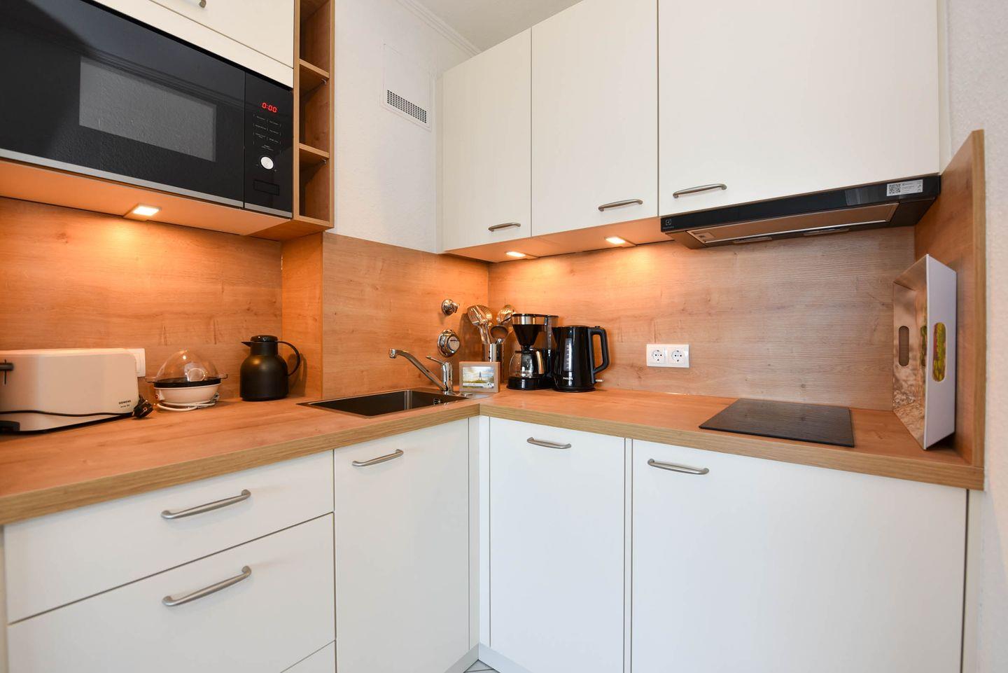 Die moderne Küchenzeile ist bestens ausgestattet mit einem Kühlschrank, einer Mikrowelle mit Grillfunktion und einer Spülmaschine. Sie ist offen zum Ess- und Wohnbereich gestaltet und ermöglicht so ein geselliges Miteinander.