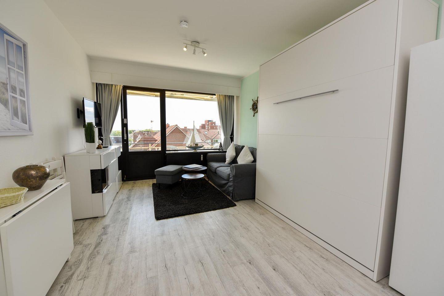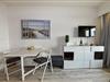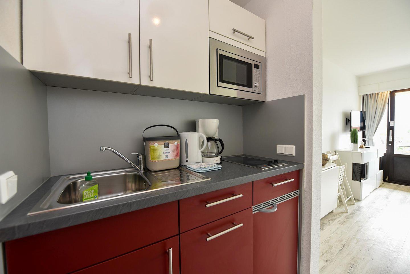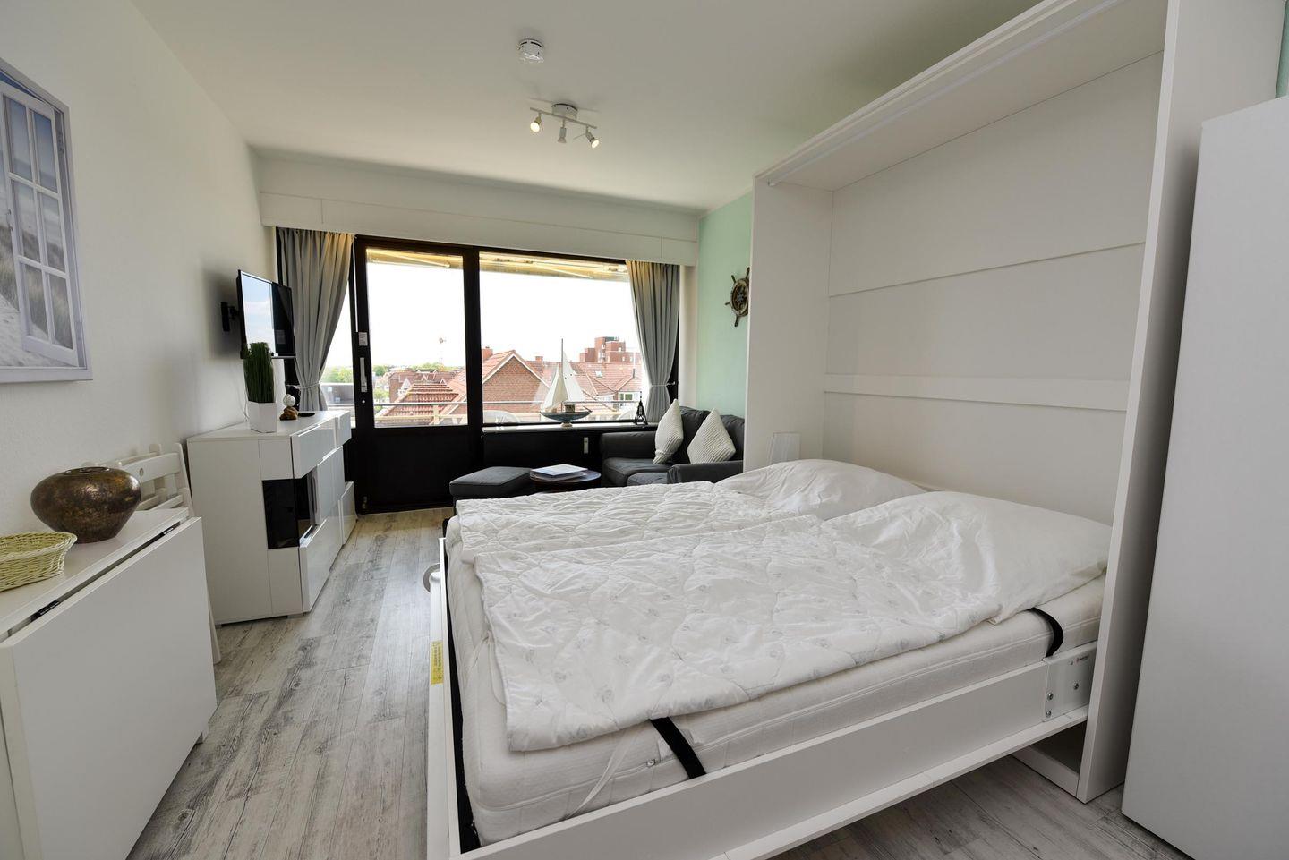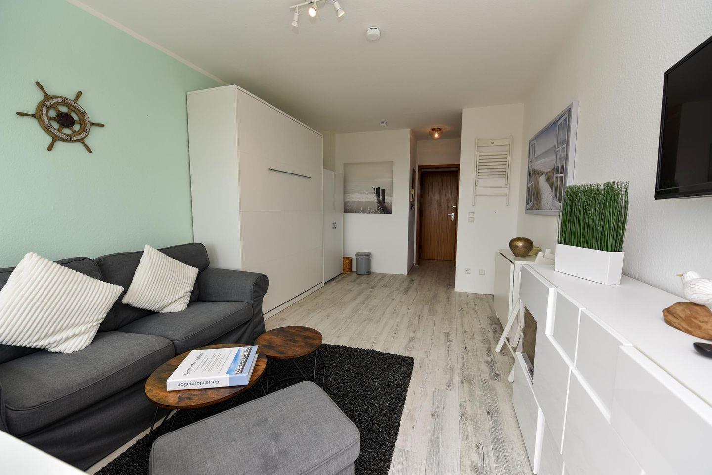 Liebevoll renoviertes 1-Zimmer-Ferienappartement mit sonnigem Südbalkon im 4. OG im Haus JAN AM STRAND. Dieses neu renovierte Appartement für 2 Personen hat eine voll ausgestattete Küchennische inkl. Spülmaschine und Mikrowelle. Der Wohnbereich ist mit einem Doppelschrankbett, einem Sofa und einem Esstisch für 2 eingerichtet. Zu dem Appartement gehört auch ein Tiefgaragenstellplatz mit einer Einstellhöhe von149 cm.
