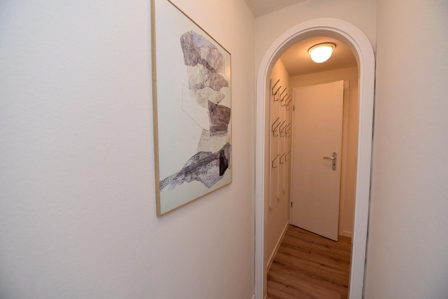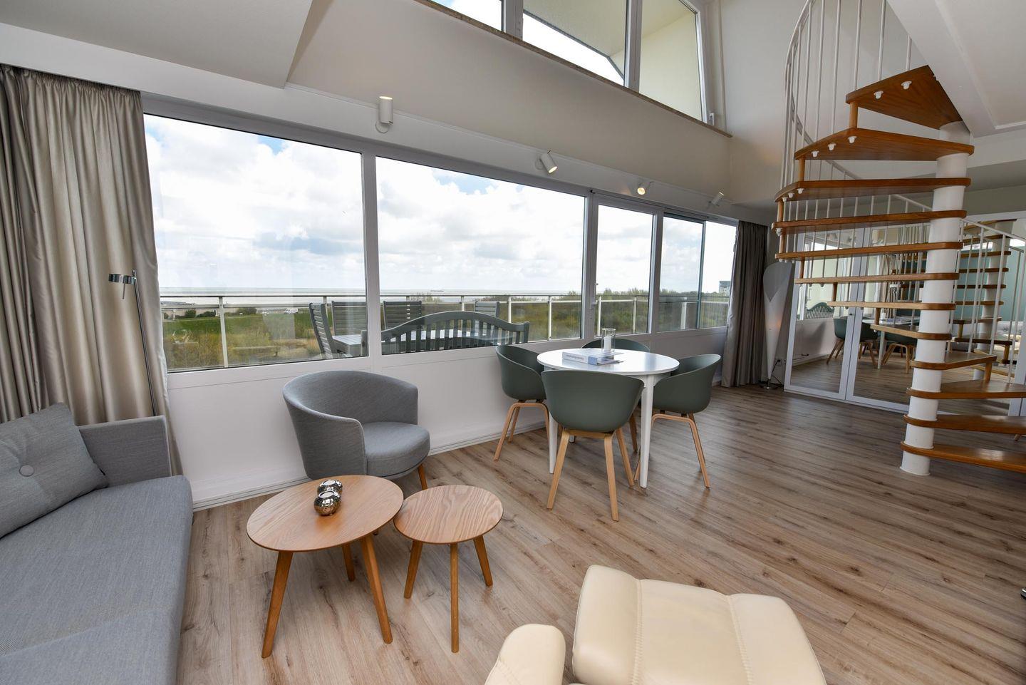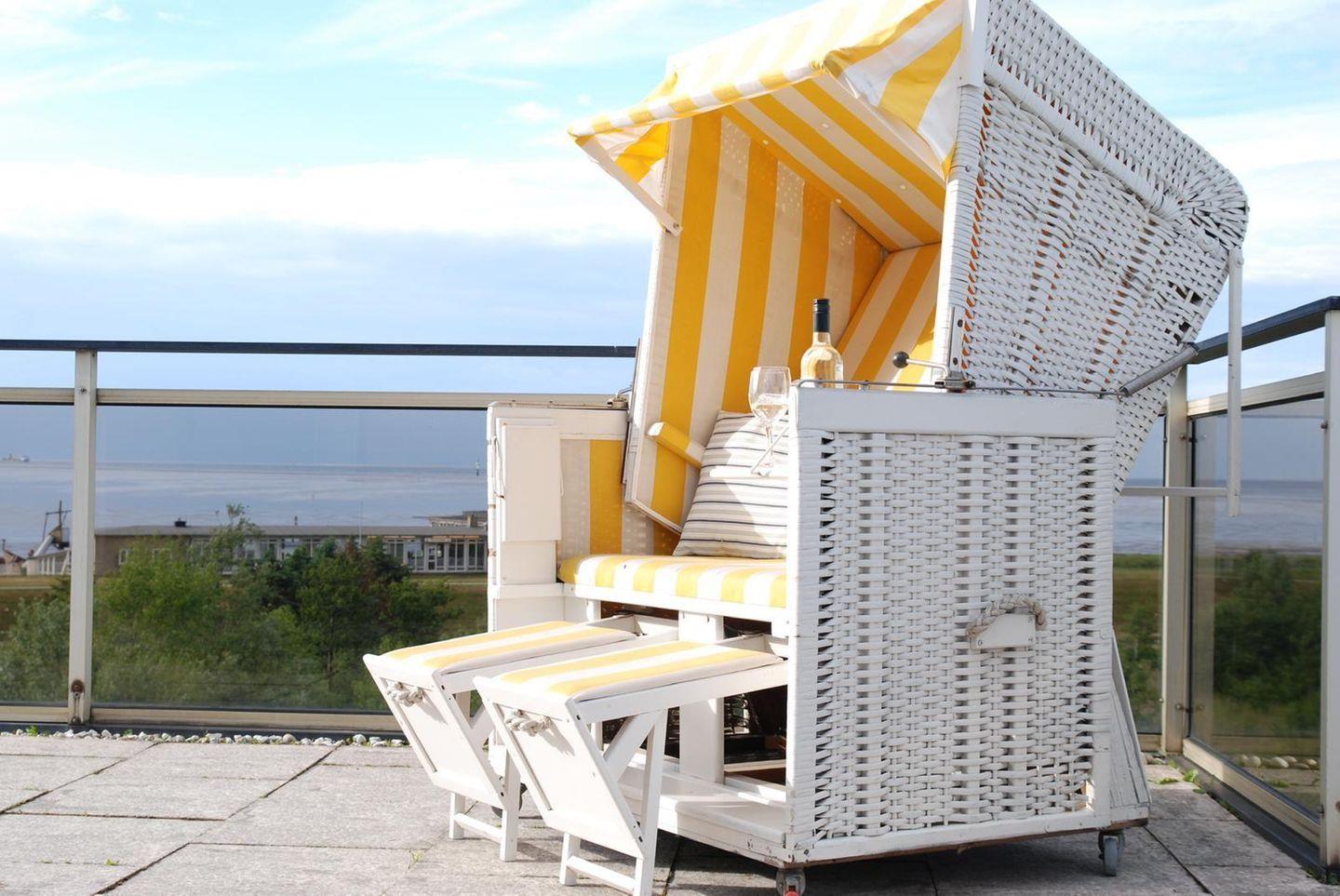 Helle, renovierte 2-Zimmer-Eckwohnung (!) im 5. OG mit sehr großzügiger Sonnenterrasse, eigenem Strandkorb, Sonnenliegen und Relaxsesseln. Exklusive Sicht auf den Weltschifffahrtsweg und das UNESCO Weltnaturerbe Wattenmeer.