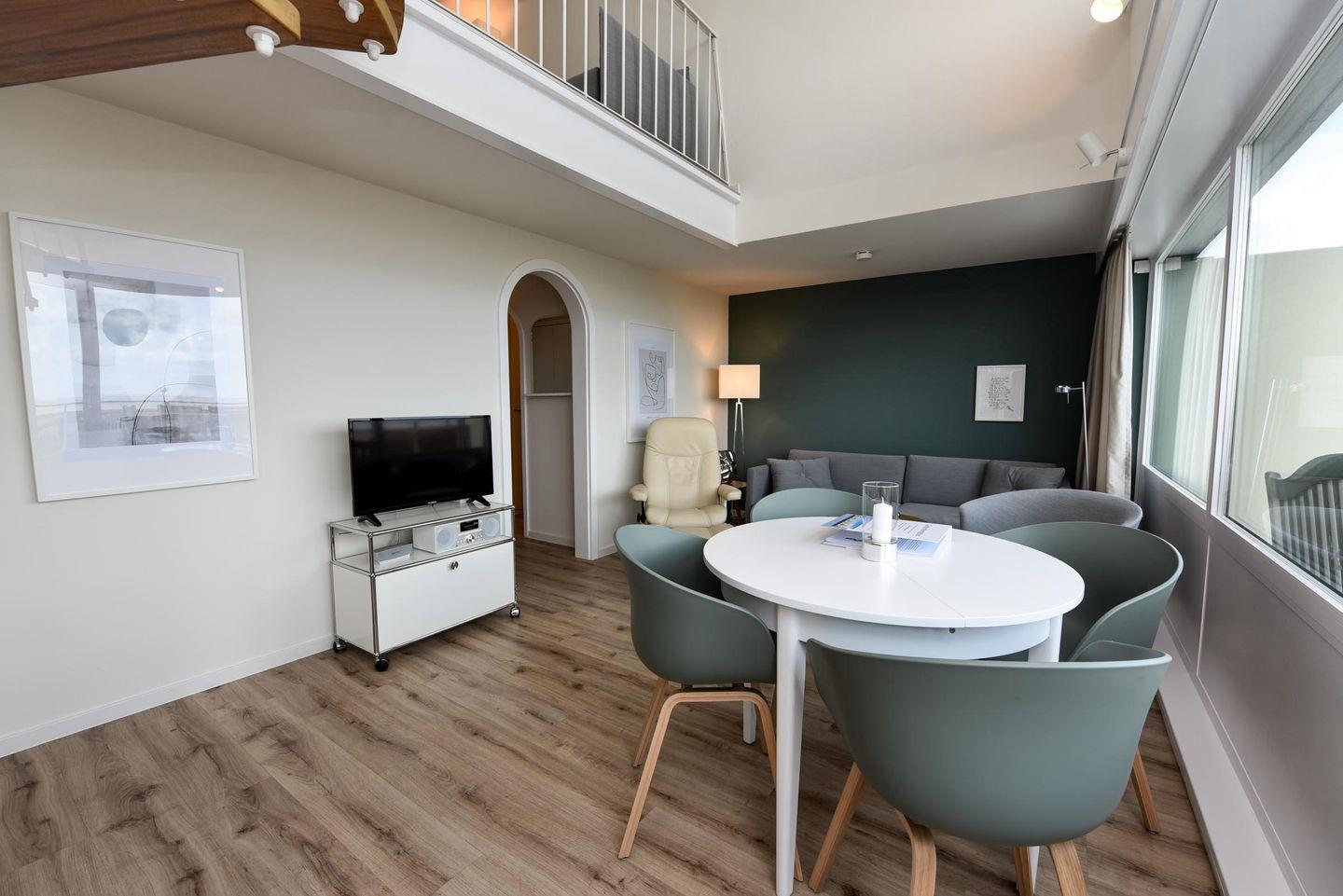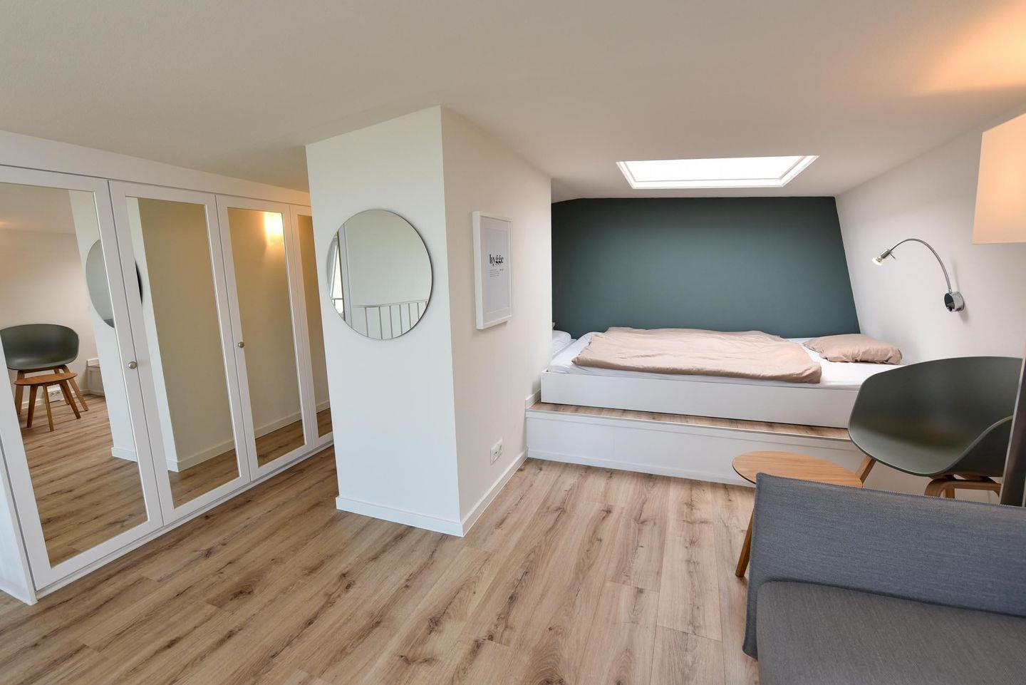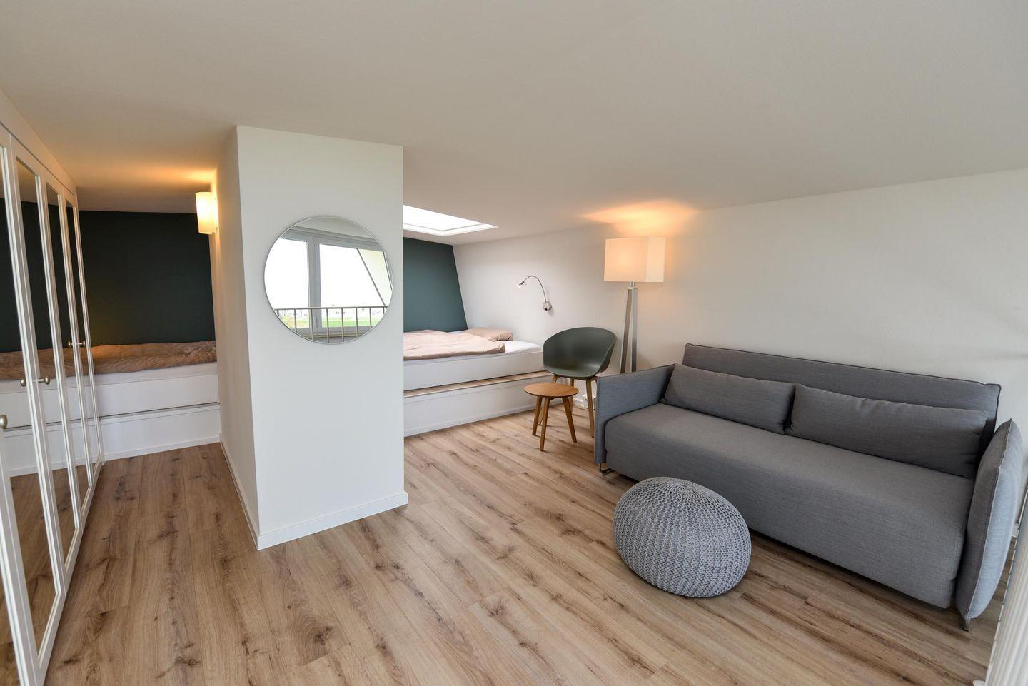 Das geschmackvoll und hochwertig eingerichtete, allergikerfreundliche Appartement verfügt über einen gemütlichen Schlafraum auf der Empore, welcher mit einem Doppelbett (140 x 200 cm), einem Einzelbett (90 x 200 cm) und einem bequemen Schlafsofa (140 x 200 cm) ausgestattet ist. (Emporen-Stehhöhe 165-175)