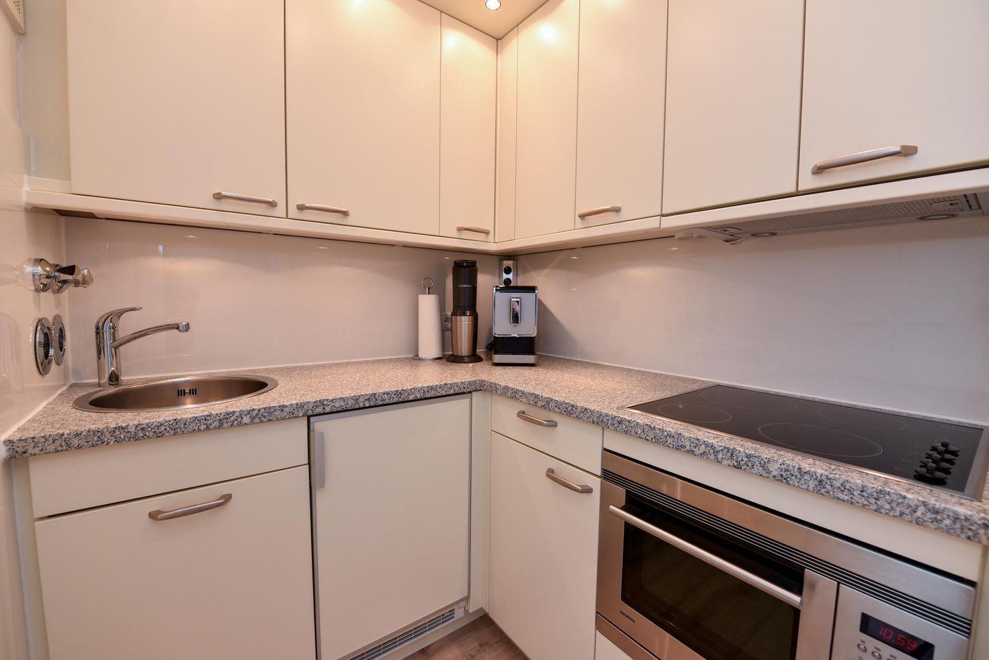 Die Couch im Wohnzimmer ist ebenfalls ausziehbar und bietet eine Liegefläche von 125 x 200 cm. Das Appartement hat eine sehr gut ausgestattete Küche.