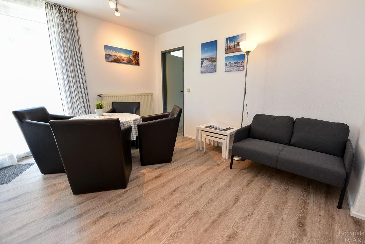 Charmantes 3-Zimmer-Ferienappartement im Hochparterre des Hauses PAVILLON, ideal für einen entspannten Aufenthalt. Das Appartement bietet einen einladenden Wohn- und Essbereich sowie zwei gemütliche Schlafzimmer. Die allergikerfreundlichen Fußböden sorgen für zusätzlichen Komfort. Genießen Sie die Annehmlichkeiten der offenen Küchenzeile mit Mikrowelle, die sich perfekt in den Wohnraum integriert. Der Essbereich mit vier komfortablen Sesseln und passendem Tisch ist ideal für gemeinsame Mahlzeiten und gemütliche Stunden. Die Schlafzimmer sind praktisch eingerichtet – eines mit zwei Einzelbetten und das andere mit einem Doppelbett (140x200). Bitte beachten Sie, dass in dieser Wohnung keine Unterbringung eines Babybetts möglich ist. Zur Unterhaltung steht ein großer Fernseher mit Kabelfernsehen zur Verfügung. Der kleine Balkon erweitert den Wohnraum ins Freie. Für Ihren Komfort inkludiert das Appartement einen PKW-Stellplatz sowie kostenloses WLAN.