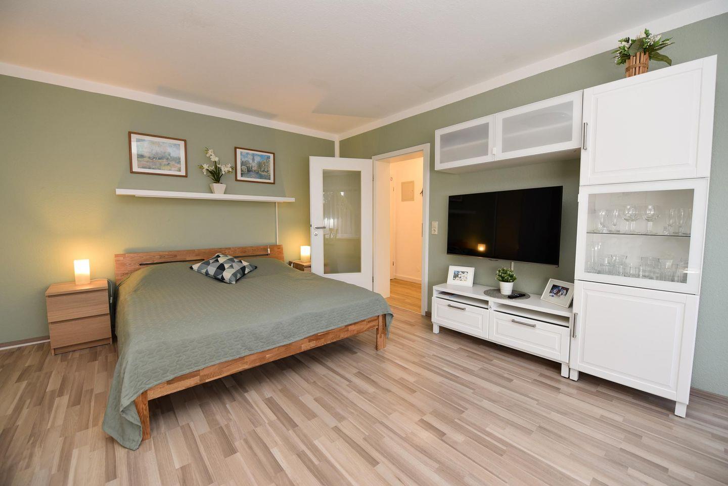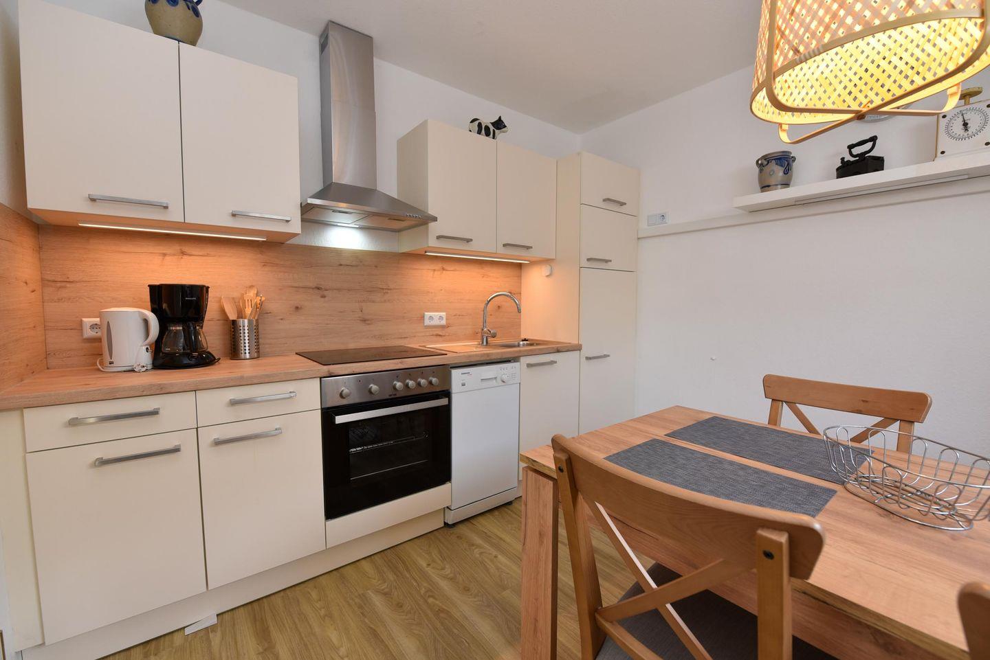 1-Zimmer-Ferienwohnung im EG des Hauses LUV mit WLAN. In dem Wohn-/Schlafraum befindet sich u.a. ein Ehebett und eine gemütliche Couchgarnitur. Im separaten Küchenraum, von wo aus Sie in den Garten blicken, finden Sie Esstisch, 4 Stühle und auch eine Geschirrspülmaschine. Duschbad mit WC., Kabel-TV., Möblierte Terrasse. Spielrasen, Spielgerät und Sandkiste auf dem Grundstück, PKW-Stellplatz. Schwimmbad-Benutzung kostenfrei!.