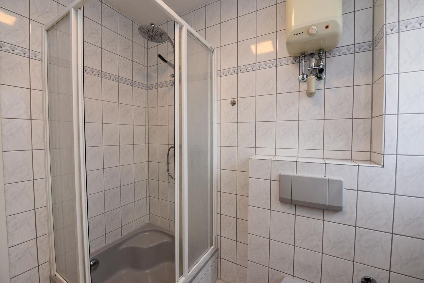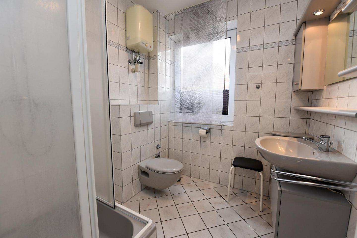 Das helle Badezimmer mit Dusche und WC, ausgestattet mit einem Fenster, bietet moderne Annehmlichkeiten und Komfort. Auf dem möblierten Balkon können Sie frische Luft und Ruhe genießen.