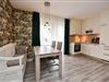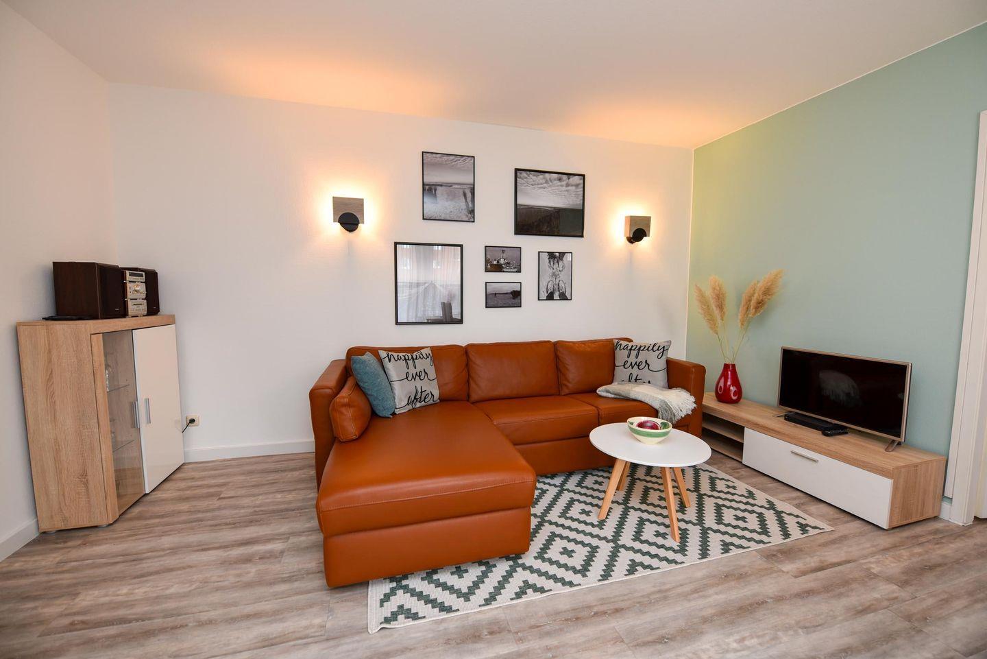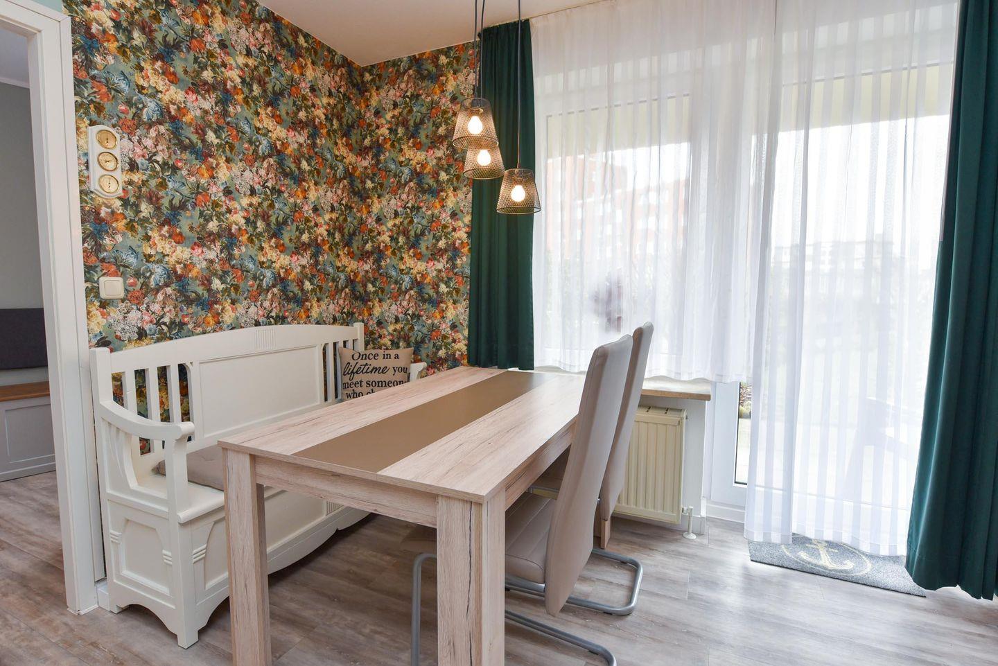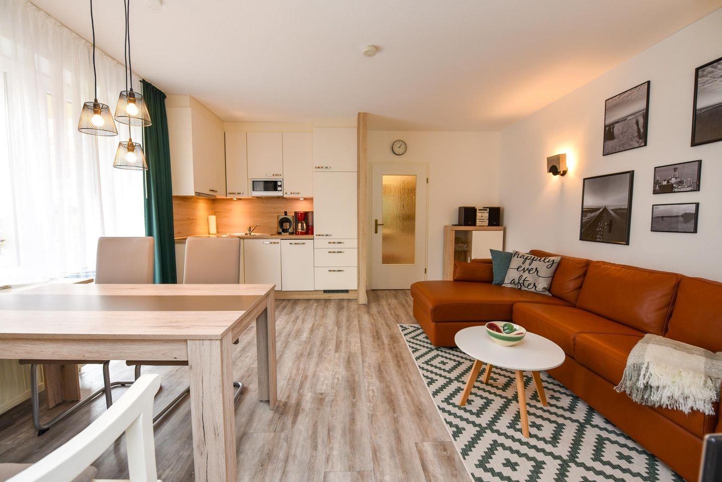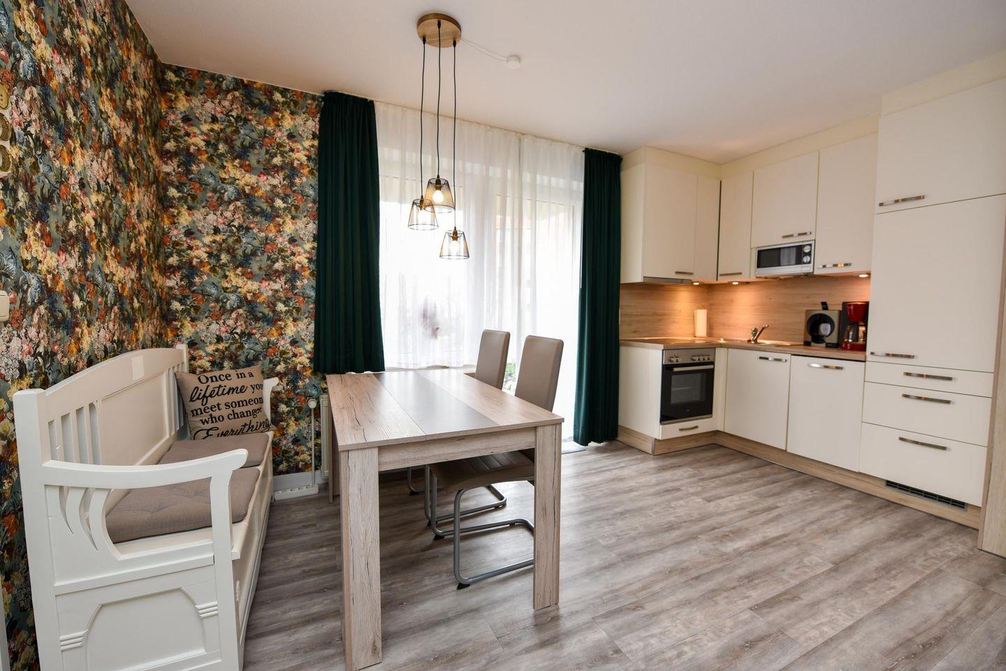 Willkommen im 2-Zimmer-Apartment im Erdgeschoss der Residenz KORMORAN. Das Apartment umfasst einen einladenden Wohn- und Essbereich mit einem komfortablen Schlafsofa (120 x 200 cm), perfekt für gemütliche Abende oder als zusätzliche Schlafmöglichkeit. Der Essbereich ist ideal für vier Personen konzipiert und führt in die voll ausgestattete Küchenzeile – ideal für Selbstversorger..