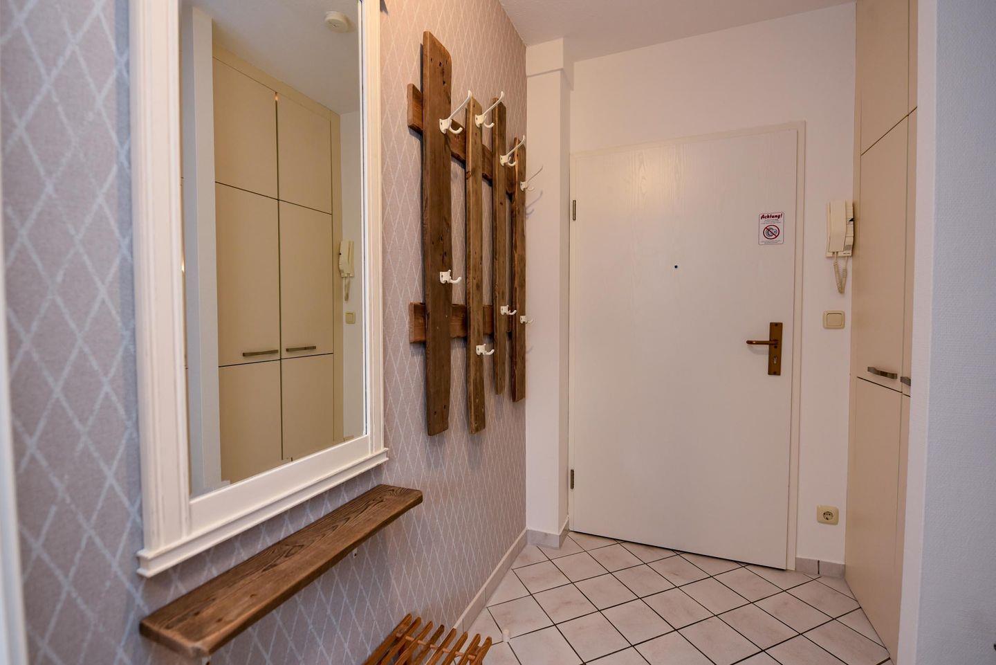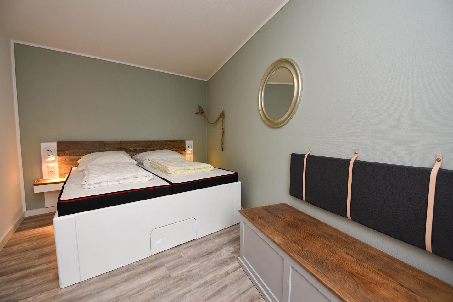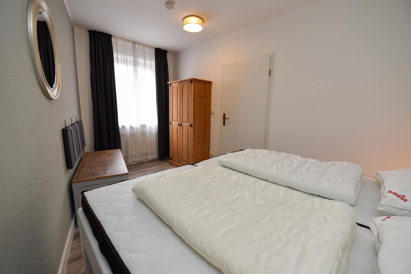 Im separaten Schlafzimmer finden Sie ein gemütliches Doppelbett, das nach einem Tag voller Erlebnisse zur Ruhe einlädt. Die Wohnung ist mit einem allergikerfreundlichen Bodenbelag ausgestattet, der für einen angenehmen und gesundheitsbewussten Aufenthalt sorgt.