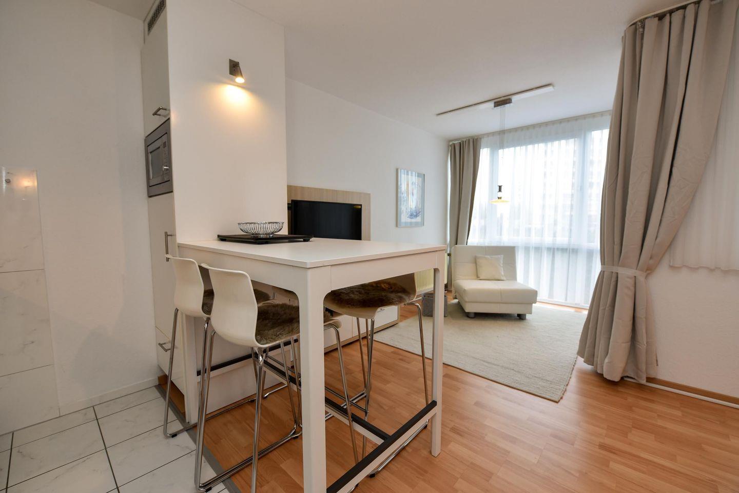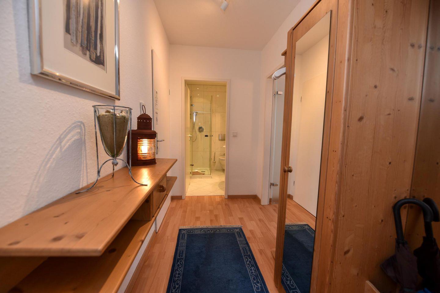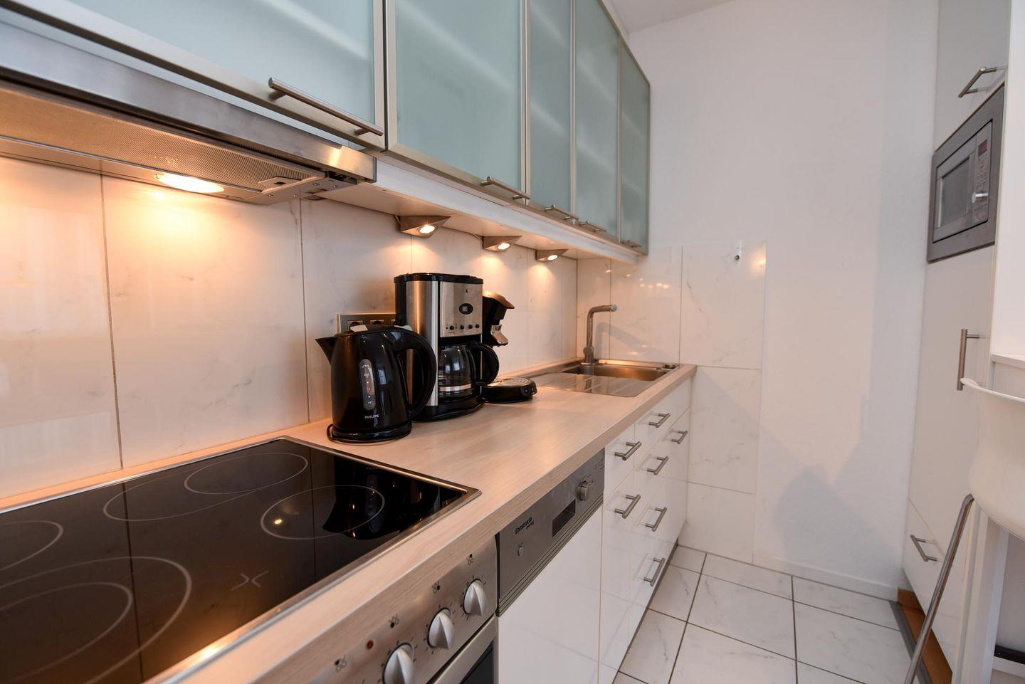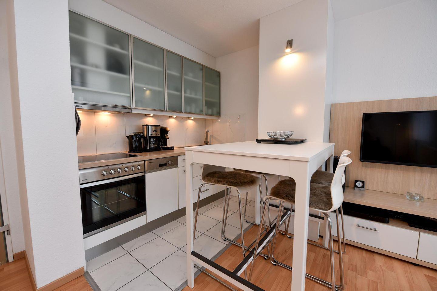 Geräumiges 2-Zimmer Appartement mit Balkon im Hochparterre der Residenz "Passat". Das Appartement verfügt über ein helles Schlafzimmer mit Ehebett und MagentaTV. Im Wohnzimmer befindet sich u.a. ein Schlafsofa und ein Einsitzer. Auch Bücher und Gesellschaftsspiele stehen zur Verfügung. Die voll ausgestattete Küchenzeile mit Tresentisch und 4 Stühlen ist im Wohnraum integriert und verfügt über einen Backofen, eine Mikrowelle und einen Geschirrspüler.