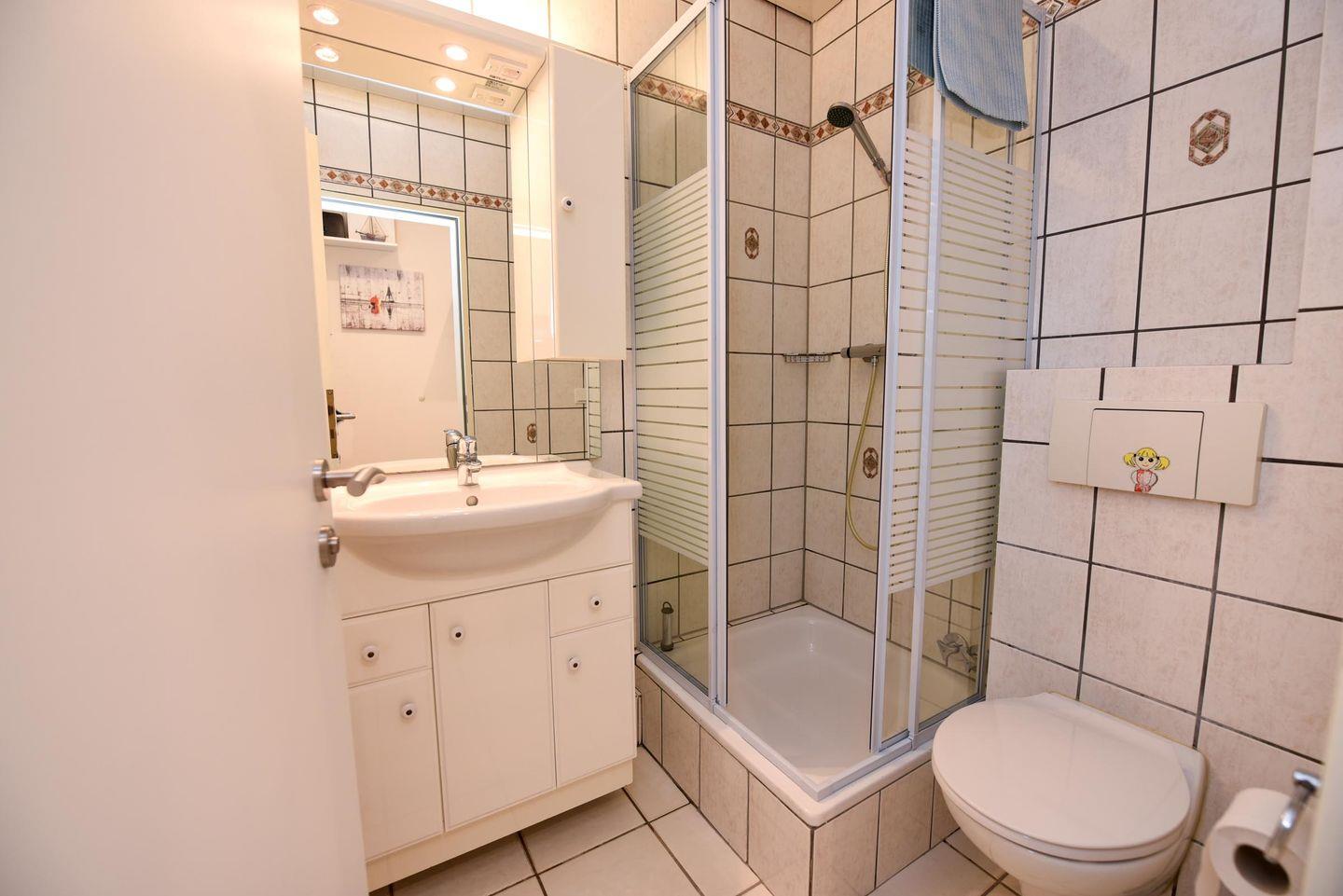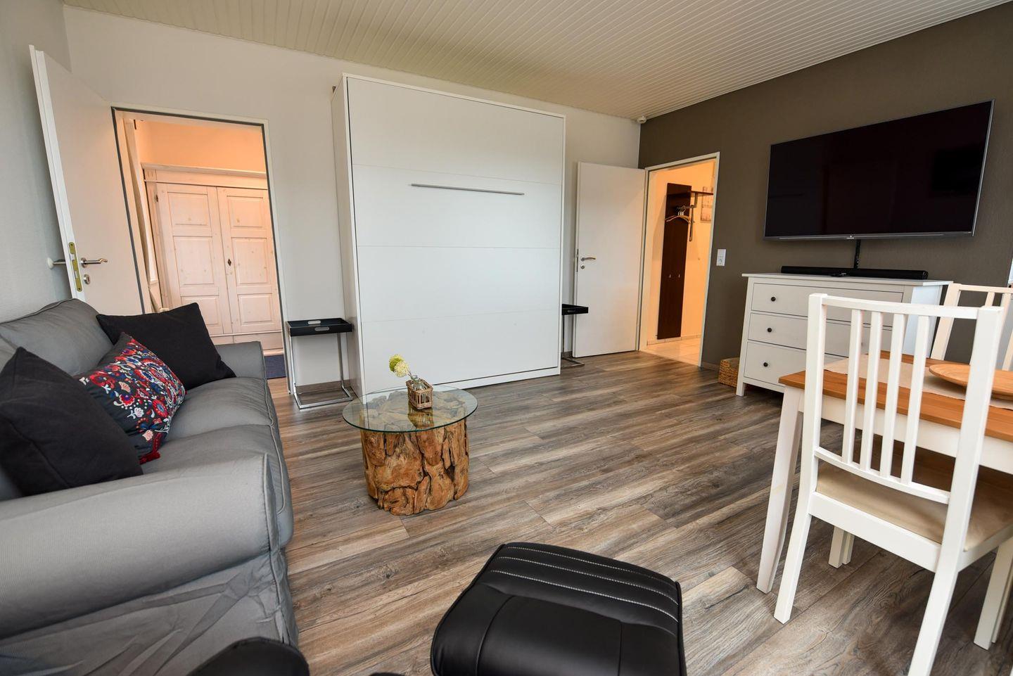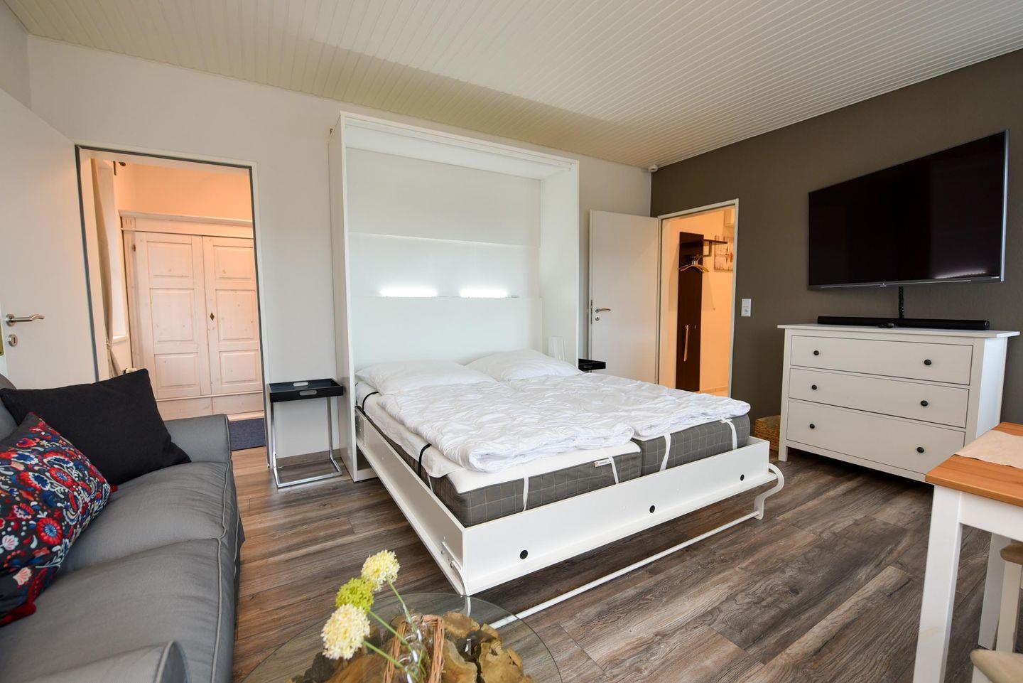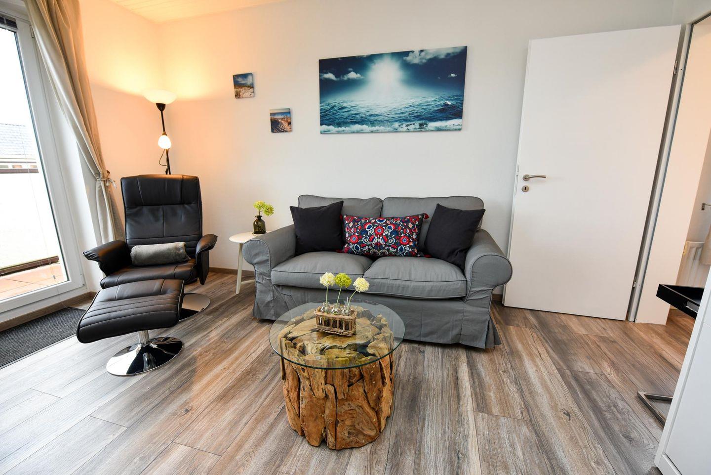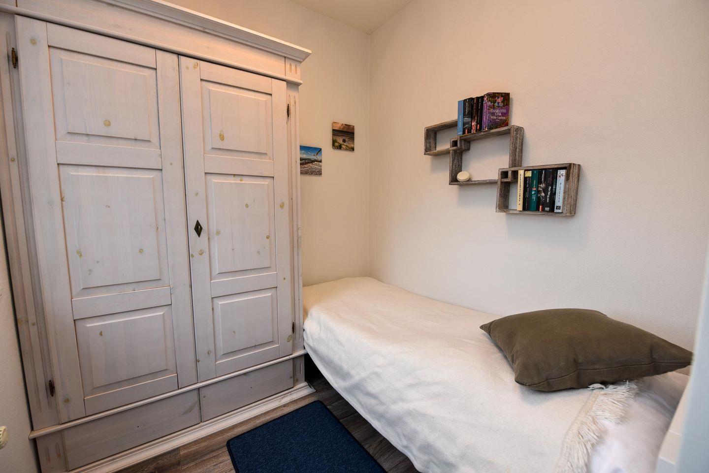 Die Ferienwohnung "Naja8" im 2. Obergeschoss des Hauses Najade ist ideal für bis zu drei Personen und bietet zahlreiche Annehmlichkeiten für einen komfortablen Aufenthalt. Der einladende Wohn- und Schlafbereich ist mit einem praktischen Schrankbett, einem bequemen Sofa, einem Relaxsessel sowie einem stilvollen Esstisch und vier passenden Stühlen ausgestattet. Ein separates Schlafzimmer verfügt über ein Einzelbett und einen geräumigen Kleiderschrank. Die gut ausgestattete Küchenzeile bietet alles, was Sie für die Selbstverpflegung benötigen, und ein modernes Duschbad rundet die Ausstattung ab.