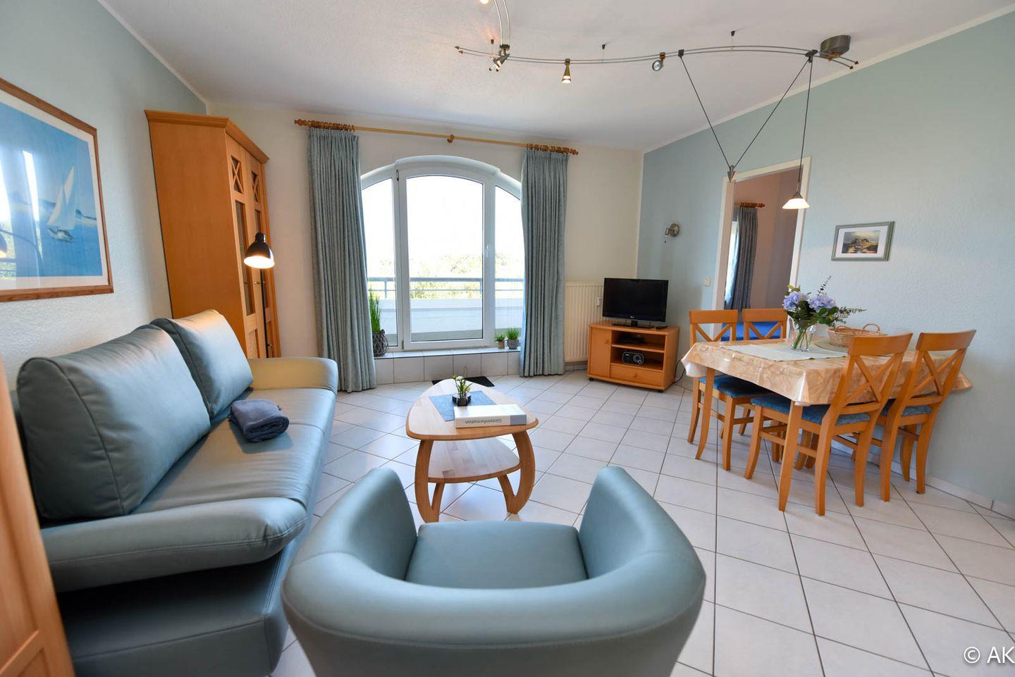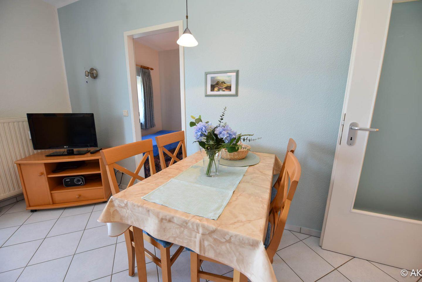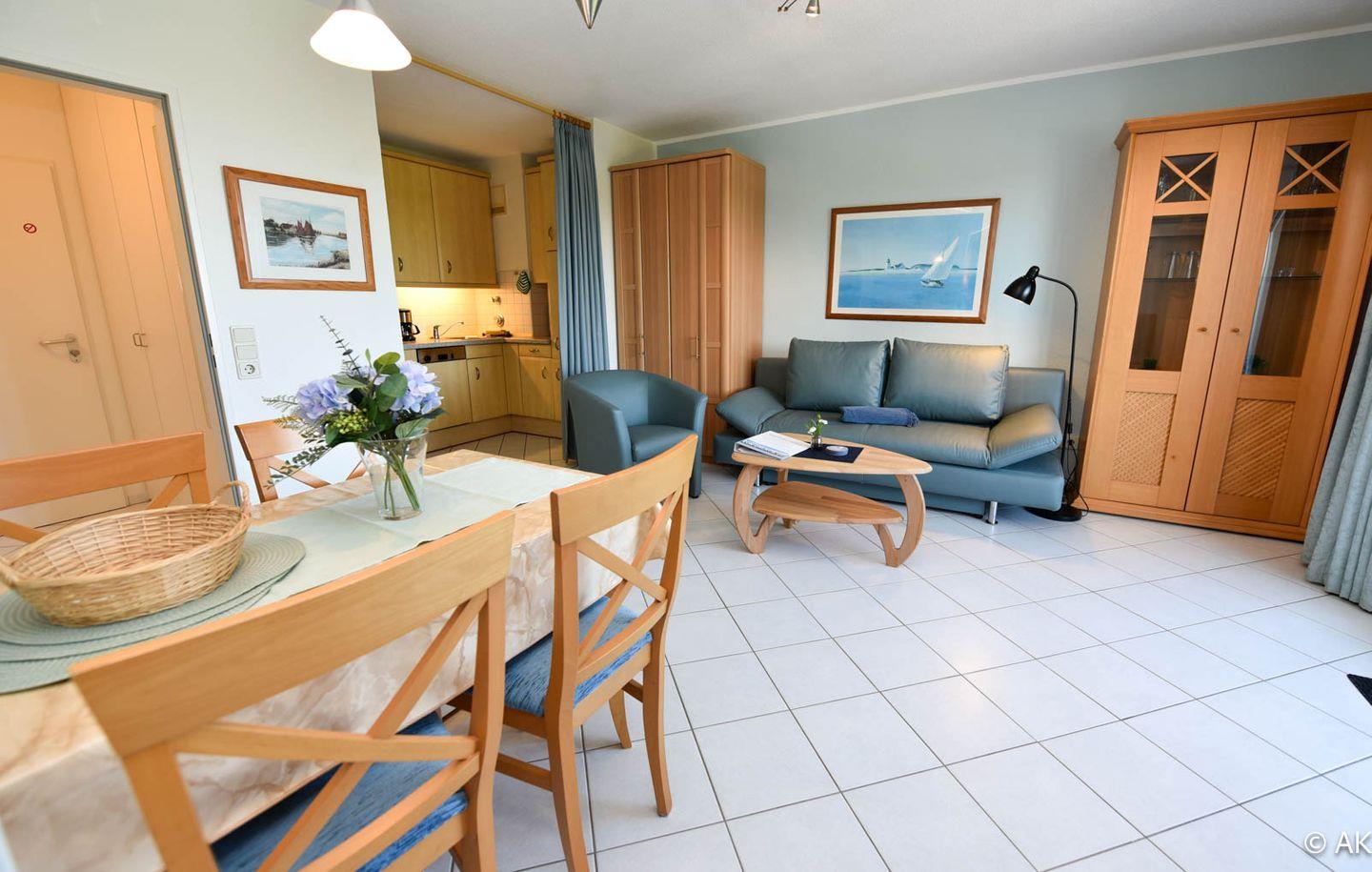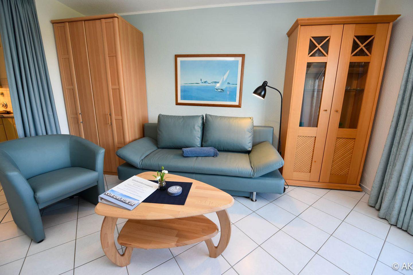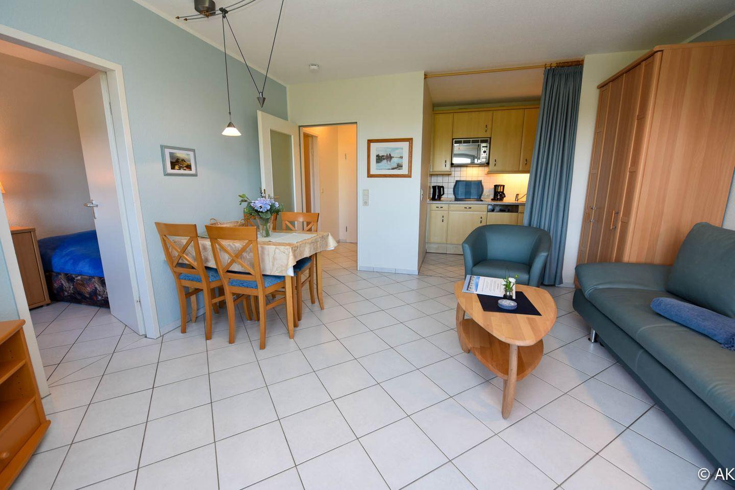 Tolles 2-Zimmer-Appartement mit Blick Richtung Nordsee, gelegen im 2. OG des Hauses DEICHGRAF. Dieses allergikerfreundliche Appartement verfügt über einen kombinierten Wohn-, Ess- und Schlafraum. Hier finden Sie eine komfortable Schlafcouch, einen gemütlichen Sessel sowie einen Esstisch mit Platz für vier Personen.
